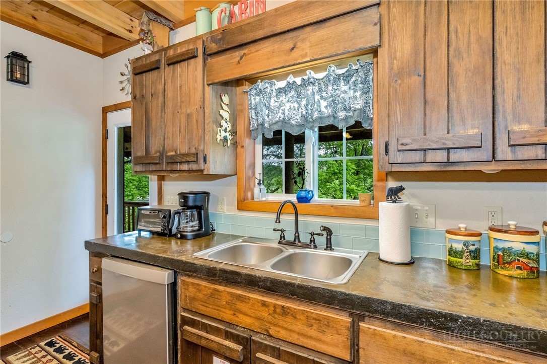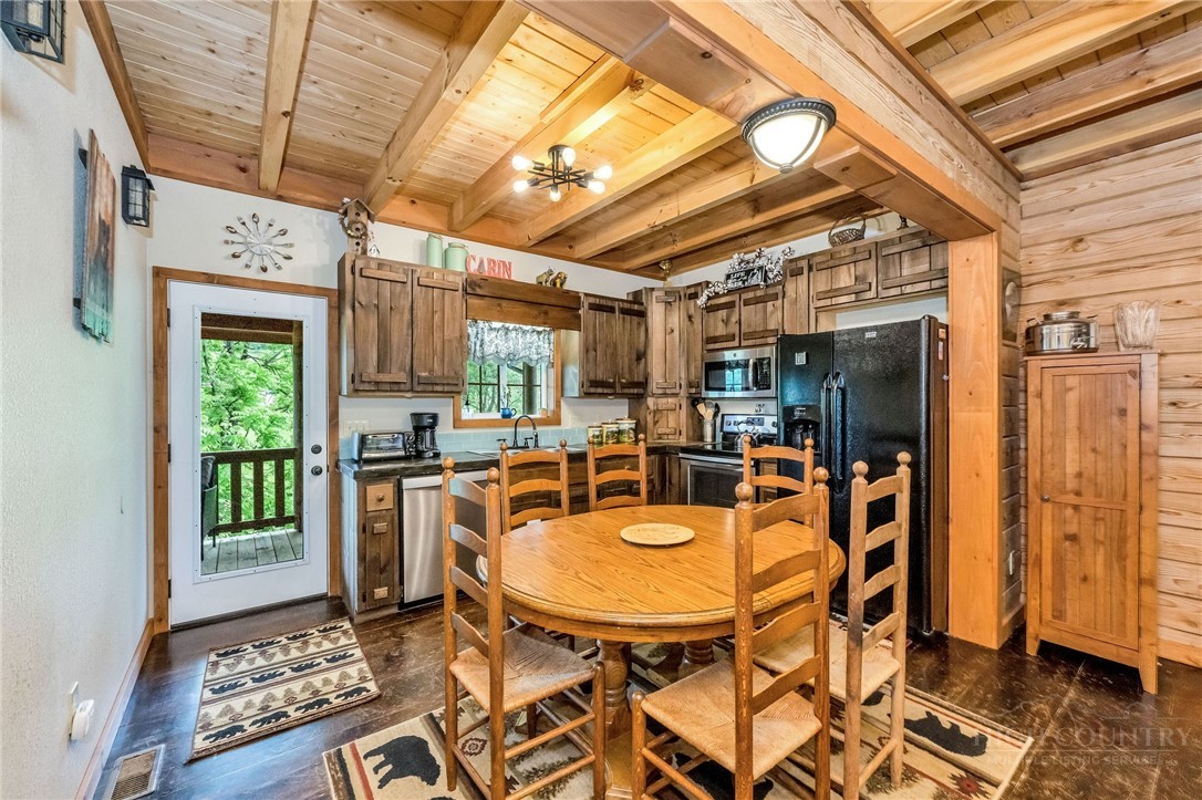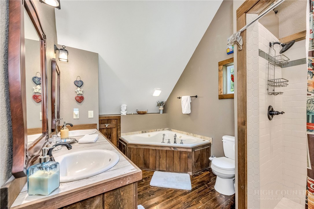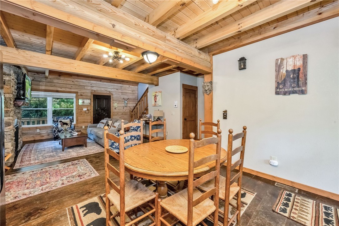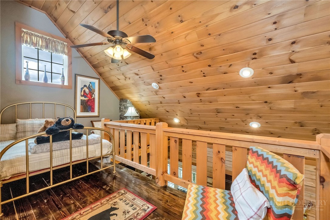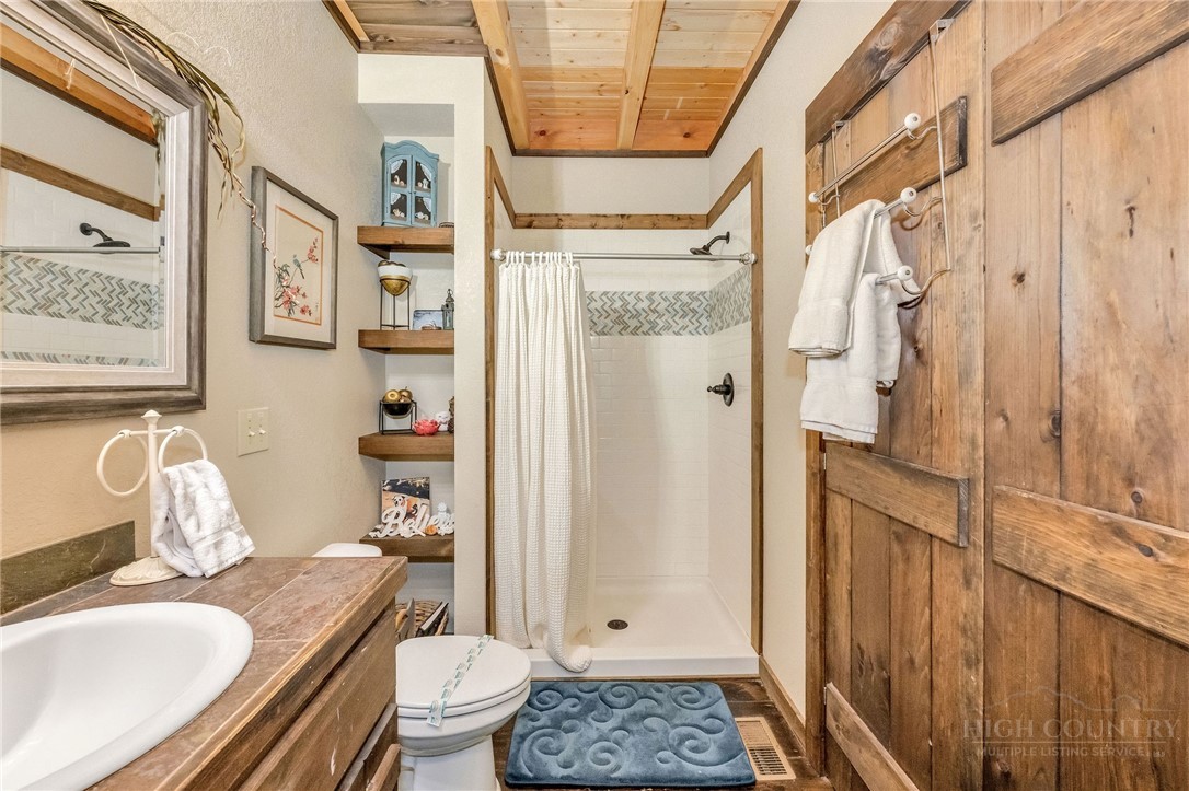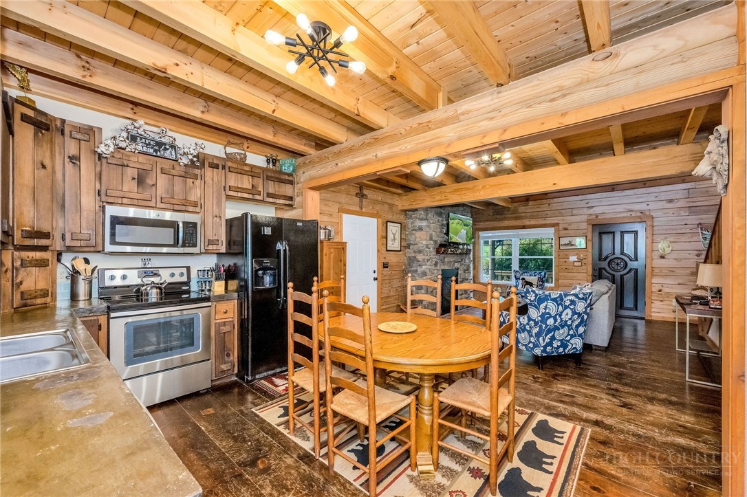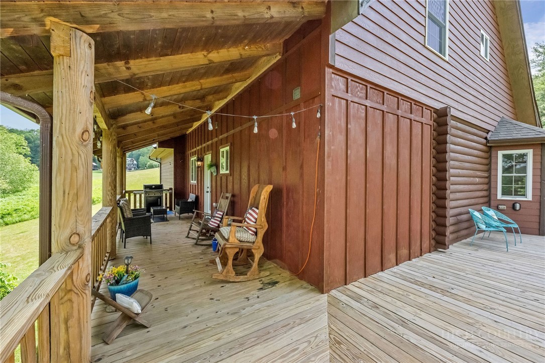 Charming Mountain Retreat with Pond Frontage in Canawhay — Set on a picturesque 2-acre lot overlooking a tranquil community pond, this beautifully crafted custom home offers the perfect blend of rustic charm and modern comfort. The inviting exterior features a mix of logs, board and batten, HardiePlank, and cedar shakes, all complemented by an expansive covered deck that spans the front and back — with an open-air section ideal for relaxing and enjoying peaceful water views. Inside, the main level welcomes you with a spacious open-concept design, where the living room and eat-in kitchen flow seamlessly together. A cozy stone fireplace anchors the space, creating a warm and inviting atmosphere for gathering. The kitchen features stainless steel appliances and distinctive concrete countertops for a unique, mountain-modern feel. Also on the main level: a guest bedroom with private en suite bath and deck access, a convenient half bath with laundry, and an attached one-car garage. Upstairs, a loft overlooks the main living area and leads to a spacious primary suite, complete with a whirlpool tub, walk-in tile shower, and thoughtful finishes throughout. The finished lower level offers excellent flexibility with a private entrance, efficiency kitchen, living area, bedroom, and full bath — ideal for guests, extended family, or additional rental potential. Offered fully furnished and with a strong short-term rental history, this home is perfectly suited as a full-time residence, mountain getaway, or income-producing investment. Located just minutes from New River State Park and a short drive to downtown West Jefferson, you’ll enjoy easy access to hiking, river activities, and all the charm of the High Country.