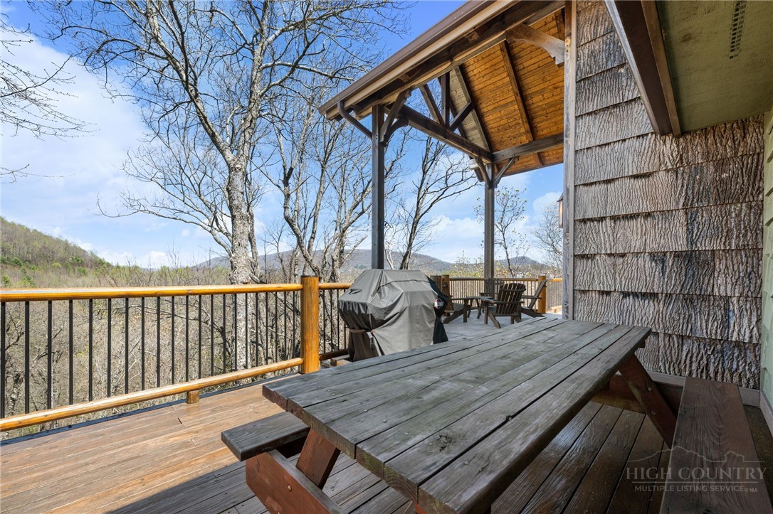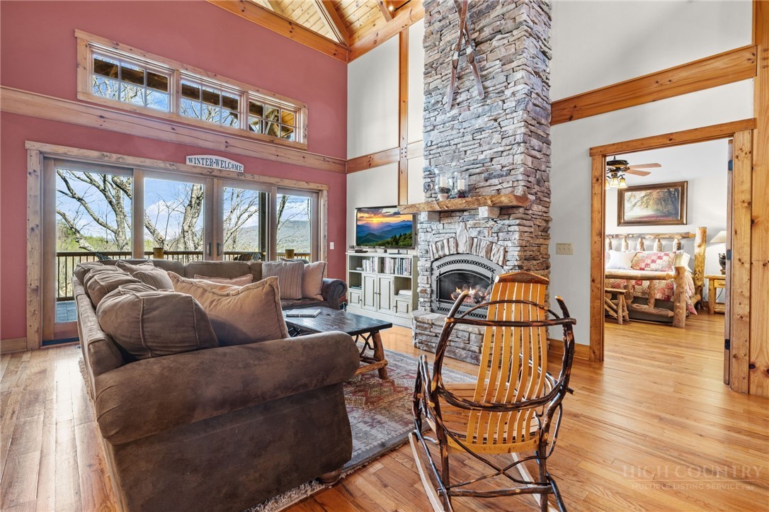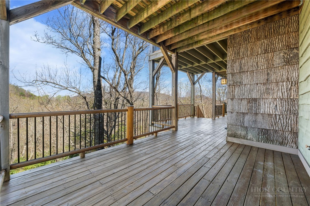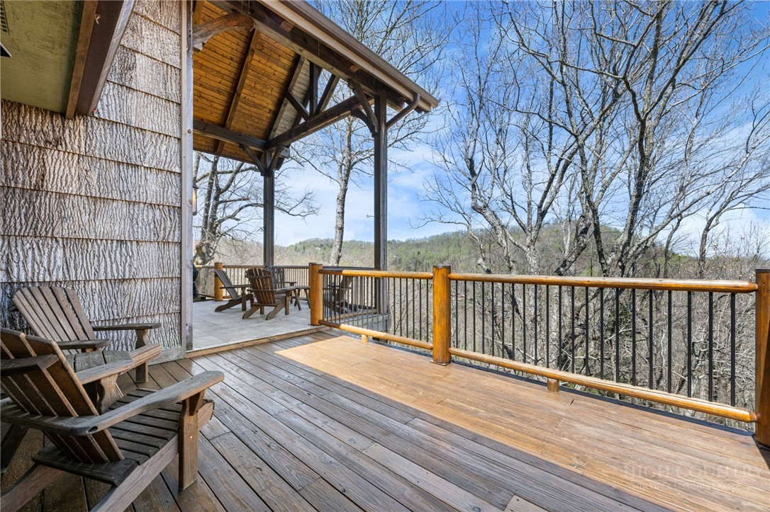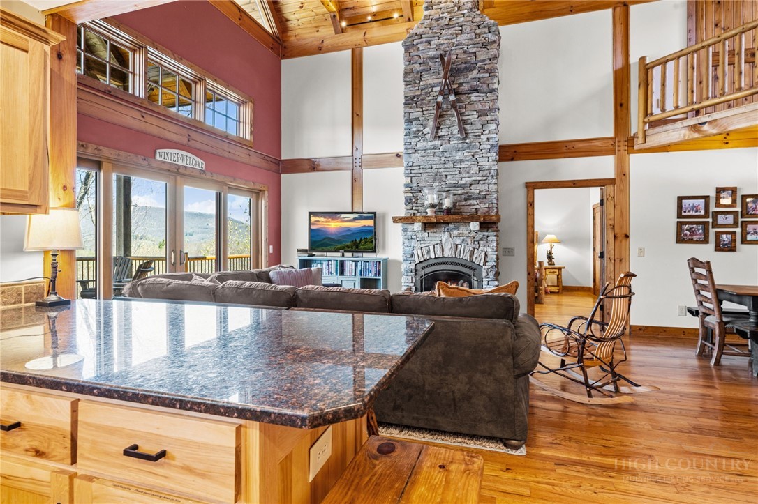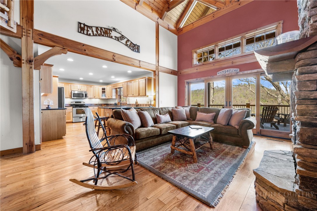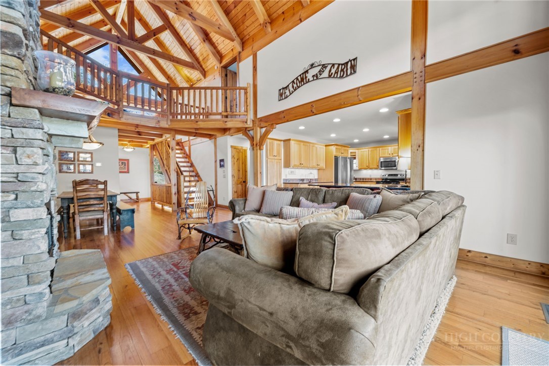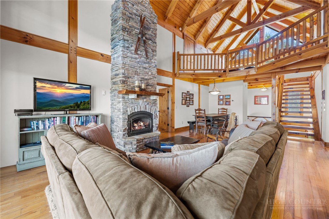 Perched to capture breathtaking long-range mountain views, this expertly crafted timber frame home is tucked among the trees on 2.39 acres, just minutes from downtown Boone. This exceptional mountain retreat offers the perfect blend of luxury, comfort, and unforgettable High Country scenery in every season. Designed and built by renowned local builder Mark Kirkpatrick of Mountain Construction, the home showcases exceptional craftsmanship throughout, from its striking timber frame construction to distinctive exterior details including poplar bark and featherboard siding. Inside, a dramatic window wall frames long-range mountain views, while soaring ceilings, exposed beams, and a floor-to-ceiling stone fireplace create a warm, inviting great room designed for gathering and everyday living. The main level flows effortlessly between the kitchen, dining, and living areas, opening onto expansive covered and open decks, perfect for morning coffee, evening sunsets, and entertaining. The kitchen features granite countertops, stainless steel appliances, and a pantry, while the primary suite offers its own cozy propane fireplace and a spacious ensuite bath with jetted tub, tiled shower, and granite finishes. A second main-level bedroom with its own bathroom provides additional comfort and flexibility. Upstairs, a loft overlooking the great room captures mountain views and leads to a large bunk room, offering additional sleeping space ideal for guests or a fun retreat. The fully finished lower level expands the home’s versatility with a separate entrance, a spacious game and recreation area complete with pool table and card table, office or study, laundry room, and additional bedrooms, including a second primary suite with ensuite bath. Multiple rooms on this level open directly to covered decks, creating a seamless indoor-outdoor living experience across all three levels. Offered fully furnished, this turnkey property is truly move-in ready and well-suited for full-time living, a mountain getaway, or an income-producing opportunity. Smart home features, including connected thermostats, smart lighting, a front door keypad lock, and a WiFi-enabled Ring camera, add convenience and modern functionality, while an EV charging plug provides added flexibility for today’s lifestyle. Recent updates include a new roof (2025), well pump (2025), water heater (2024), and multiple HVAC improvements, along with ongoing professional servicing. Devonwood is a small, established community with large lots and minimal HOA dues of $100 per year. Conveniently located approximately 10 minutes to Boone, 20 minutes to Blowing Rock, and about 25 minutes to Sugar Mountain Resort, the property offers easy access to the best of the High Country including dining, shopping, skiing, and the Blue Ridge Parkway. Whether you're relaxing by the firepit, hosting friends on the deck, or enjoying the changing mountain views, 225 Devonwood is a home designed for living well in every season.