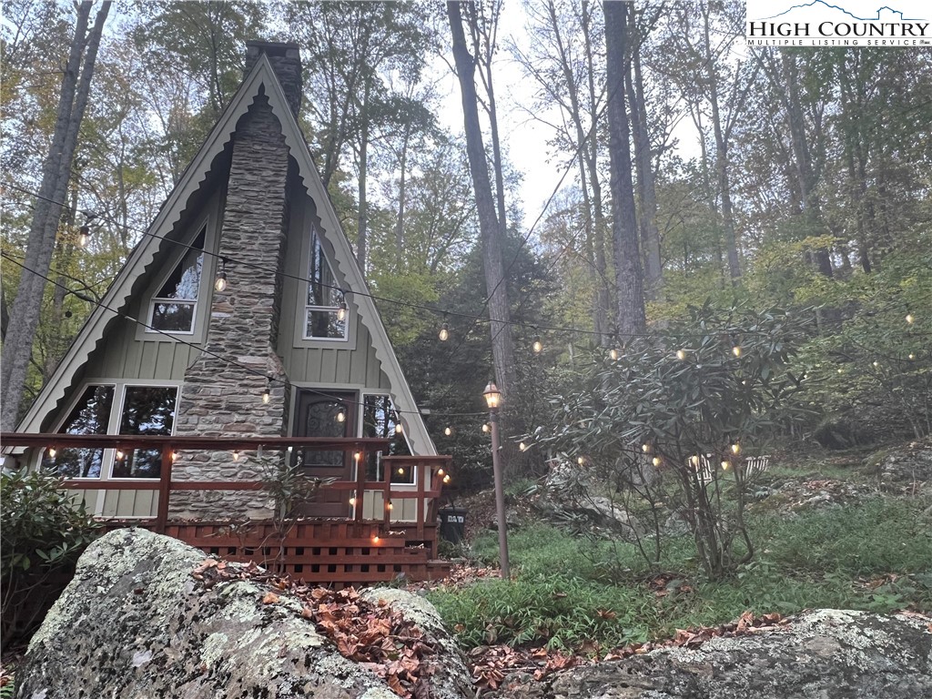 LOCK & LEAVE LIFESTYLE: guarded/ gated 24/7 where else can one find the central location. Thankfully post H. Helene electric/water restored w/in days; unlike most of Hound Ears took closer to 2 weeks. The cabin sits on a fairly flat lot surrounded by large beautiful boulders, immerse yourself in nature while being a hop skip from the clubhouse where you can walk easily to the golf course,dining. The famous one & only original Daniel Boone Cabin is on the market, Glenn Causey the actor of Daniel Boone owned this cabin during his tenure at Horn in the West. A true cabin is what everyone wants, living in the gates of Hound Ears provides a picture perfect postcard photo of the golf course as you enter is a big plus for property values. Hound Ears is Watauga County's ONLY Country Club; gated 24 hr security centrally equidistant to Blowing Rock, Boone & Banner Elk. Canopied in a tree like setting the home is ‘not too big, not too small, just right’, a perfect sanctuary for a couple looking to getaway from the hustle bustle & enjoy the cool summers. The walkway to the cabin was rebuilt in flagstone with intricate grout work boasting a sun shower. When the cabin was rebuilt all the walls & under roof has insulated roof panels additionally the wood shingles are pressure treated, other A-frames may not have these upgrades.The ceilings are finished in wood T&G, floors are wood/tile/carpet, countertops are granite. 1 bedroom/ bath/washer/ dryer/ kitchen/ dining/ living room on main; upstairs offers 2 bdrm, 1 bath, a loft offers a 4th sleeping area. Rare to find a home on sewer (not septic) in Hound Ears, you will have an item for sewer on your water bill, can add on bedrooms/living area if desired. A short drive from security and in walking distance to the clubhouse & golf course, we have the mountain cabin setting and appeal, nostalgia, large boulders. Please do your diligence on STR restrictions, less STR means more privacy, country club lifestyle isn’t a rental community. Expand your lifestyle to the outdoors, you will be hard pressed to find a more beautiful flattish lot in walk to distance to the clubhouse surrounded with beautiful boulders in the most idyllic setting, this property sparkles like a firefly!