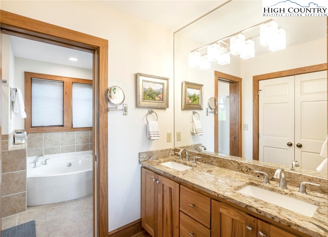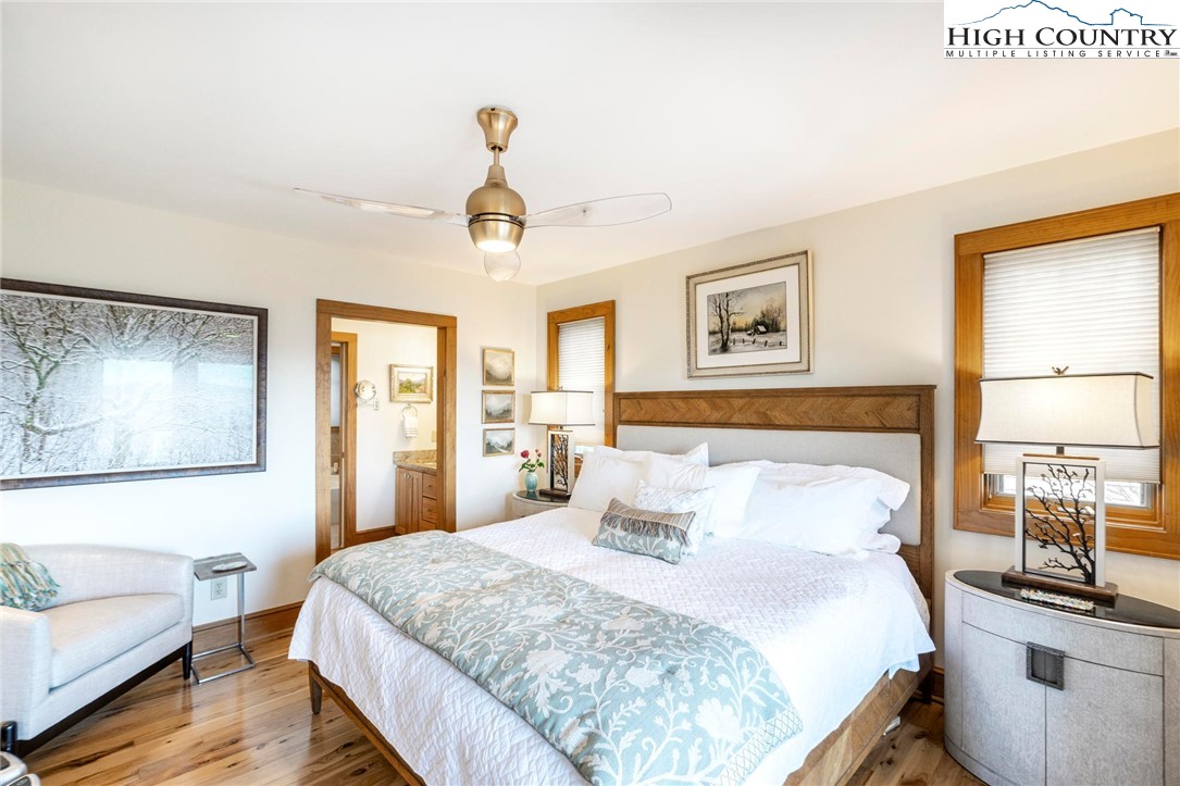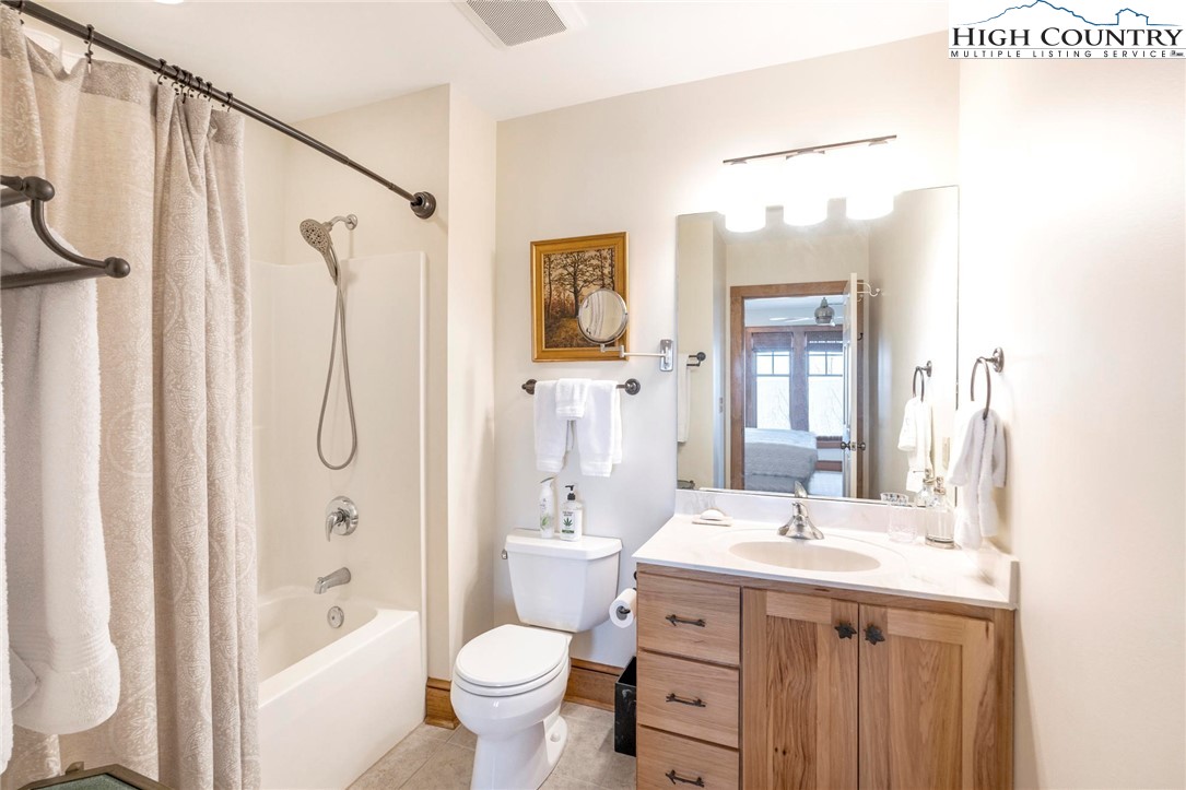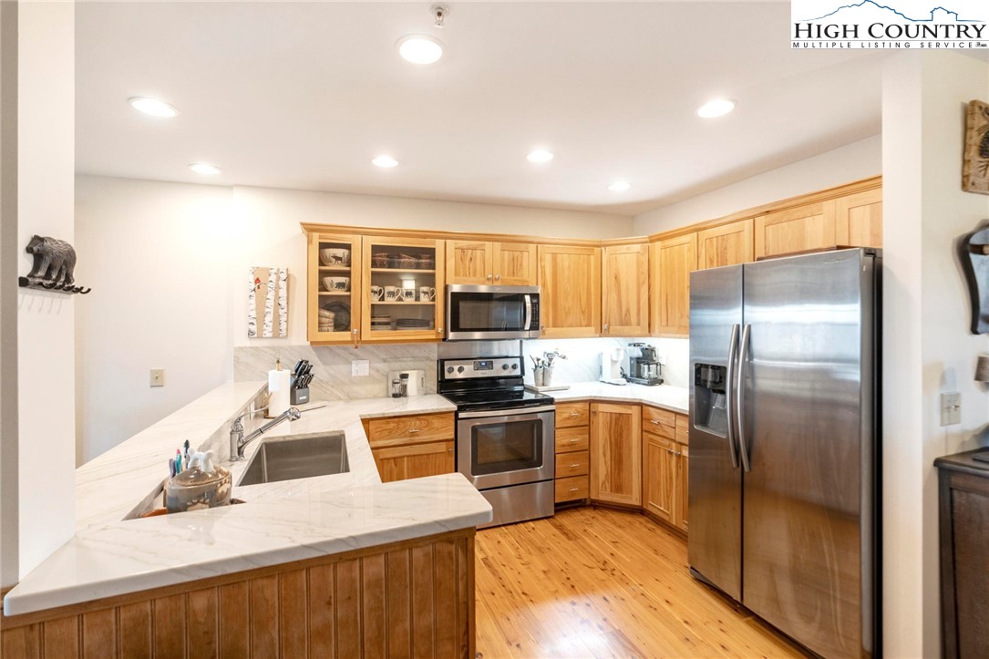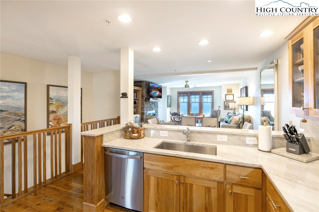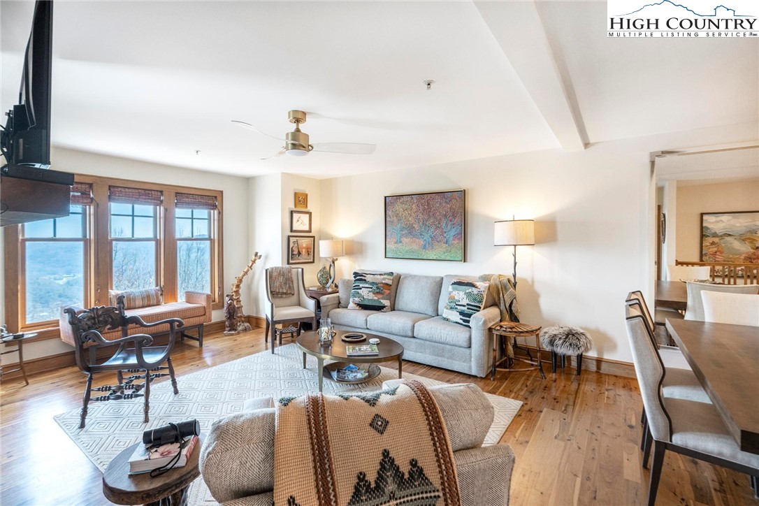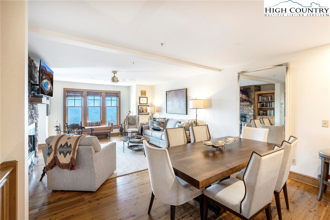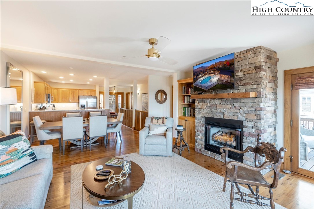 Beautifully updated and move-in ready, this split-level 3BR/3.5BA Cedar Woods condo at Echota on the Ridge offers serene mountain views and a thoughtfully appointed interior. The functional floorplan features tasteful mountain finishes including cypress hardwood floors throughout the main living areas and master bedroom, pine doors, stained trim, and a stacked stone gas fireplace with cedar mantle. The open kitchen shines with hickory cabinetry with glass front accents, stainless steel appliances, stunning new Quartzite countertops, and a new sink. A convenient breakfast bar connects seamlessly to the dedicated dining area, perfect for casual meals or entertaining. The main level also features a spacious laundry room with updated shelving and a refreshed half bath with new sink, granite countertops, faucets, and cabinet hardware. The living room opens to the covered deck, while the main level primary suite offers a spacious closet, deck access and a tastefully updated master bath with dressing area that features a new vanity and sink, granite countertops, soaking tub with tile surround, and a separate shower. Downstairs are two generous guest bedrooms each with their own bathroom and access to the second covered deck — that's 3.5 baths total, more than most comparable units in the community which typically offer only 2.5. A bonus flex space on the lower level is currently used as a fun kid's retreat but would work equally well as a bunk room, game room, or extra sleeping area. You'll also find plenty of additional storage. Fresh paint and new carpet throughout, along with new lighting and fans in every room, give this condo a crisp, updated feel. Offered furnished with exclusions — the higher-end furnishings are sure to impress.
