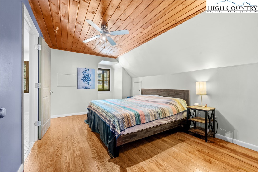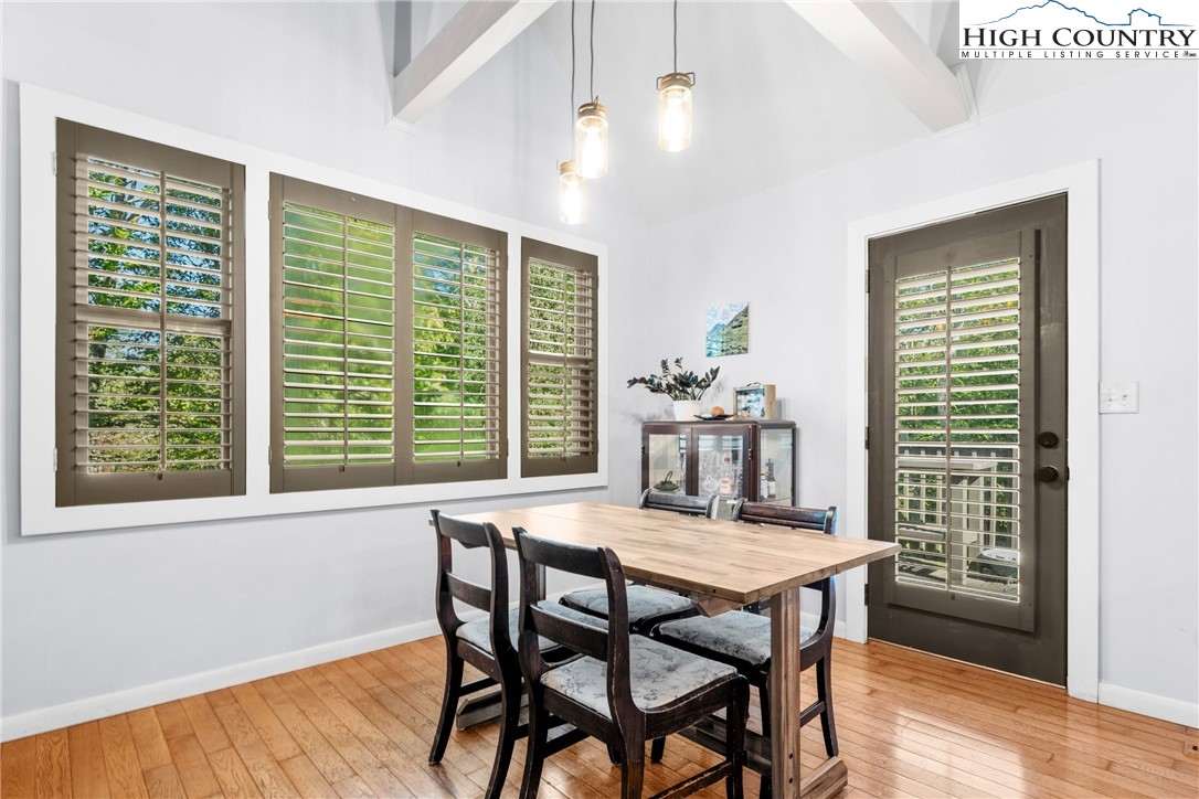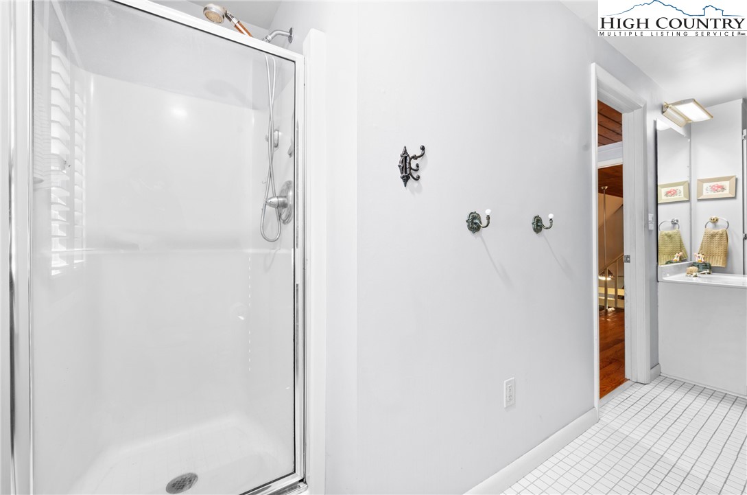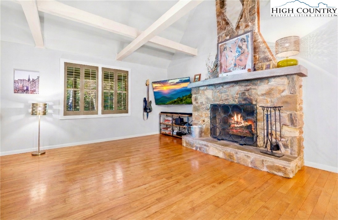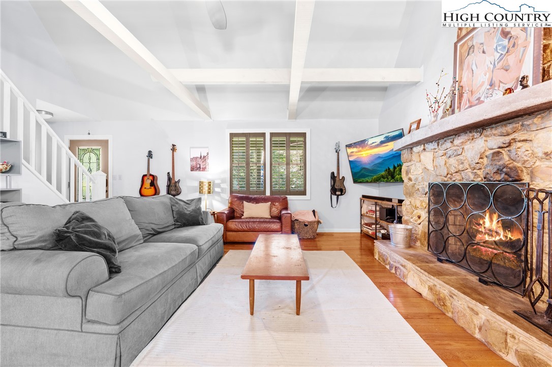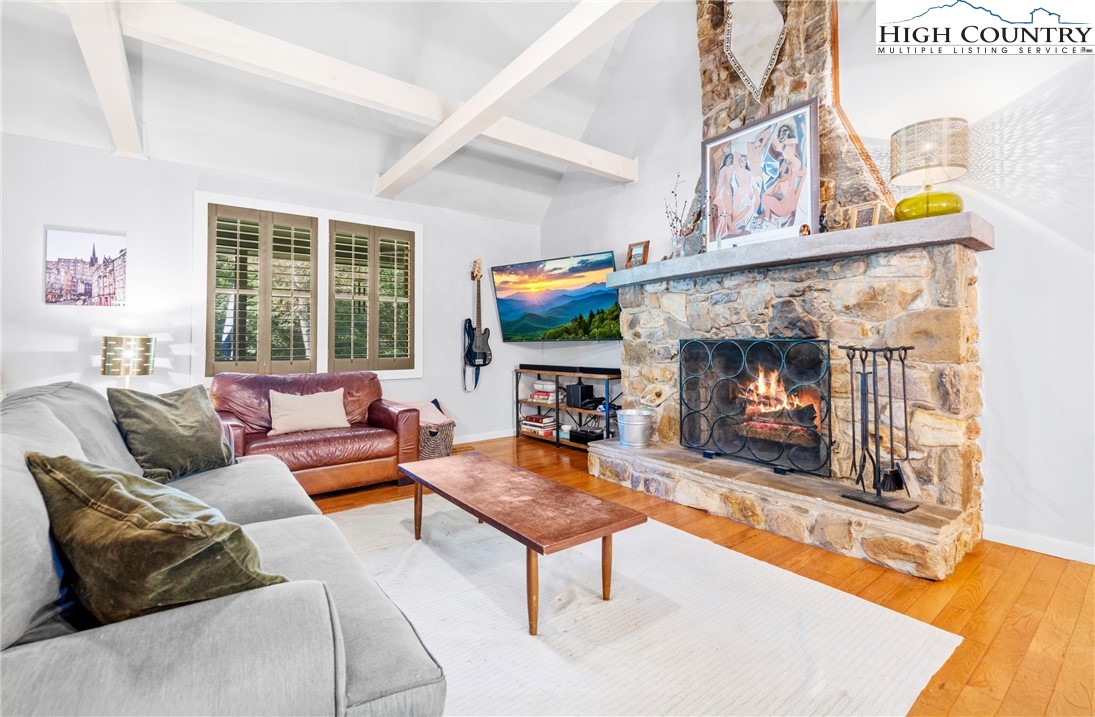 Nestled in one of Boone's most desirable neighborhoods, this cottage offers a perfect blend of comfort, style, and convenience. Just one mile from the Blue Ridge Parkway and six miles to the heart of Boone, this home is ideally situated for both serene mountain living and easy access to all that the area has to offer. The moment you step onto the large rocking chair covered porch, you'll feel the warmth and charm of this home. It's the perfect spot to enjoy your morning coffee or relax in the evening as you take in the peaceful surroundings. Enter into the spacious living room with vaulted ceilings, beautiful wood floors, and open beams. The focal point is a stunning floor-to-ceiling stone fireplace, adding a rustic yet refined touch to the space. Plantation-style blinds allow you to control the light while adding to the home’s timeless appeal. The great room seamlessly flows into the dining area and delightful kitchen, creating an open, airy atmosphere ideal for entertaining or casual living. A main-level bedroom, bath, and convenient laundry facilities complete the easy-living layout. The second floor is the primary bedroom, complete with an en-suite bath with a soaking tub, shower and walk-in closet providing an elevated private retreat perfect for relaxation. Downstairs you'll find a cozy den that offers additional living space, a half bath and two bonus rooms that could be used as additional sleeping quarters, a home office, playroom or a gym and direct access to the garage. The property is designed for ease of living with a well-maintained exterior featuring classic board-and-batten siding, stone accents, and a durable metal roof. With its convenient location and a great neighborhood, this home offers year-round comfort and convenience, making it an excellent choice for both full-time living or a seasonal escape.