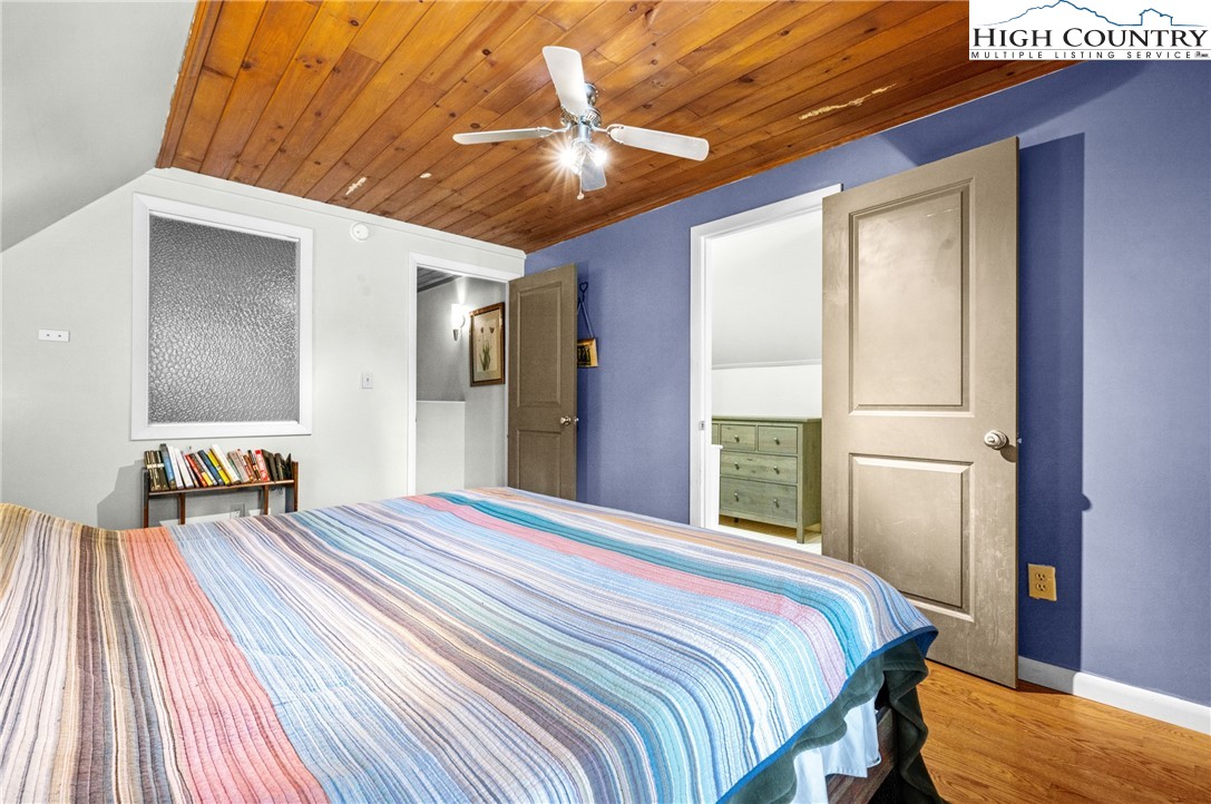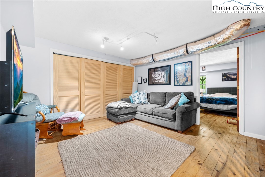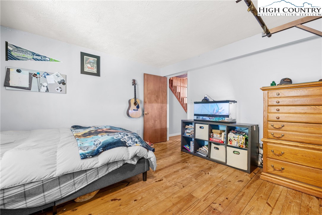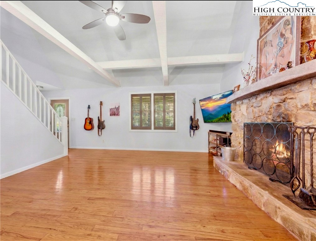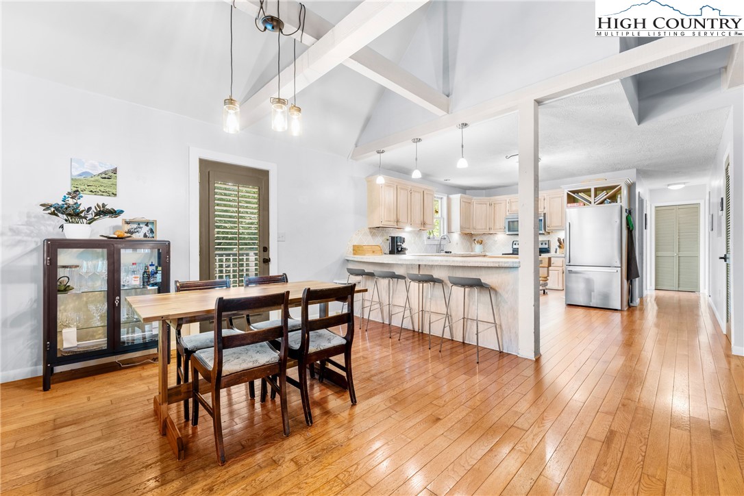 Nestled in one of Boone's most desirable neighborhoods, this cottage offers a perfect blend of comfort, style, and convenience. Just one mile from the Blue Ridge Parkway and six miles to the heart of Boone, this home is ideally situated for both serene mountain living and easy access to all that the area has to offer. The moment you step onto the large rocking chair covered porch, you'll feel the warmth and charm of this home. It's the perfect spot to enjoy your morning coffee or relax in the evening as you take in the peaceful surroundings. Enter into the spacious living room with vaulted ceilings, beautiful wood floors, and open beams. The focal point is a stunning floor-to-ceiling stone fireplace, adding a rustic yet refined touch to the space. Plantation-style blinds allow you to control the light while adding to the home’s timeless appeal. The great room seamlessly flows into the dining area and delightful kitchen, creating an open, airy atmosphere ideal for entertaining or casual living. A main-level bedroom, bath, and convenient laundry facilities complete the easy-living layout. The second floor is the primary bedroom, complete with an en-suite bath with a soaking tub, shower and walk-in closet providing an elevated private retreat perfect for relaxation. Downstairs you'll find a cozy den that offers additional living space, a half bath and two bonus rooms that could be used as additional sleeping quarters, a home office, playroom or a gym and direct access to the garage. The property is designed for ease of living with a well-maintained exterior featuring classic board-and-batten siding, stone accents, and a durable metal roof. With its convenient location and a great neighborhood, this home offers year-round comfort and convenience, making it an excellent choice for both full-time living or a seasonal escape.