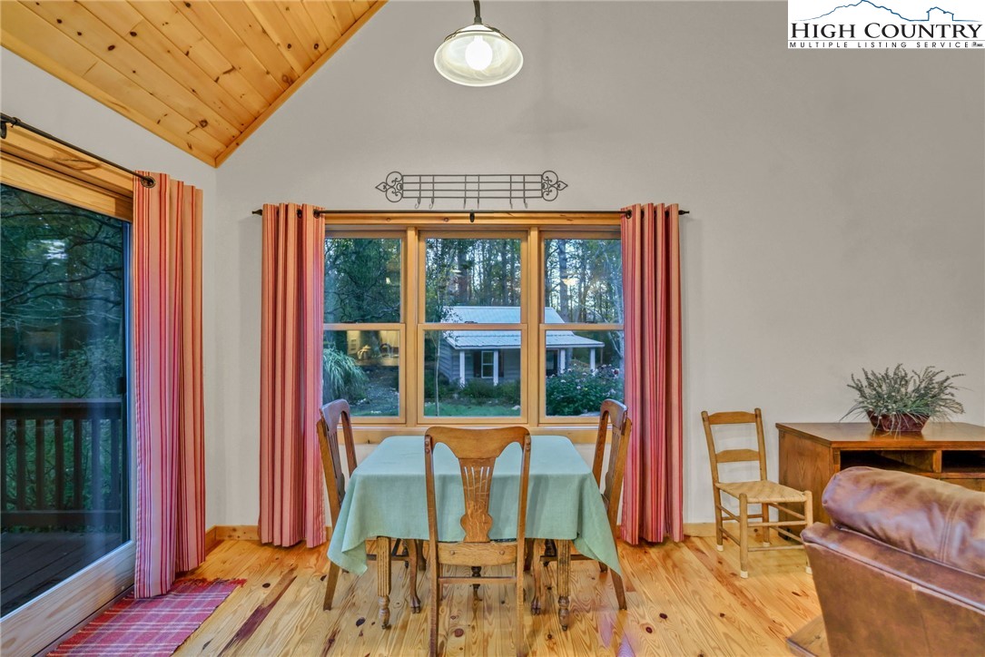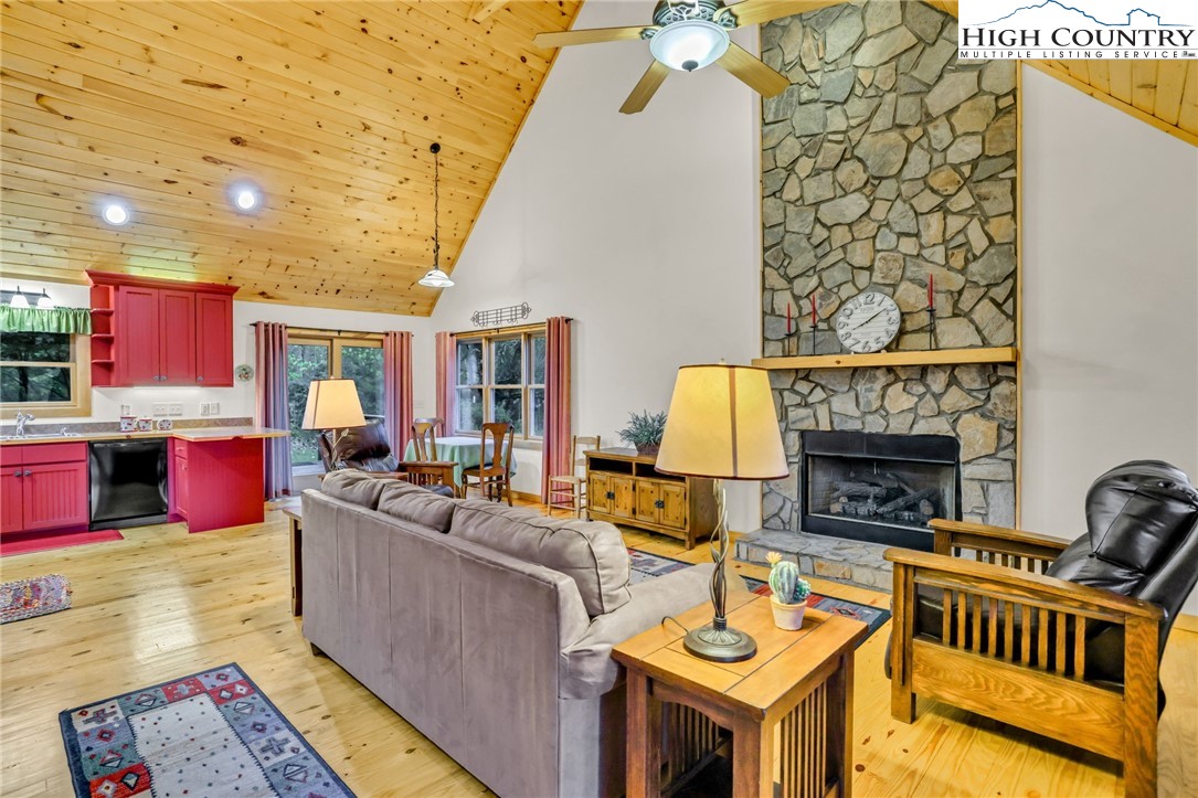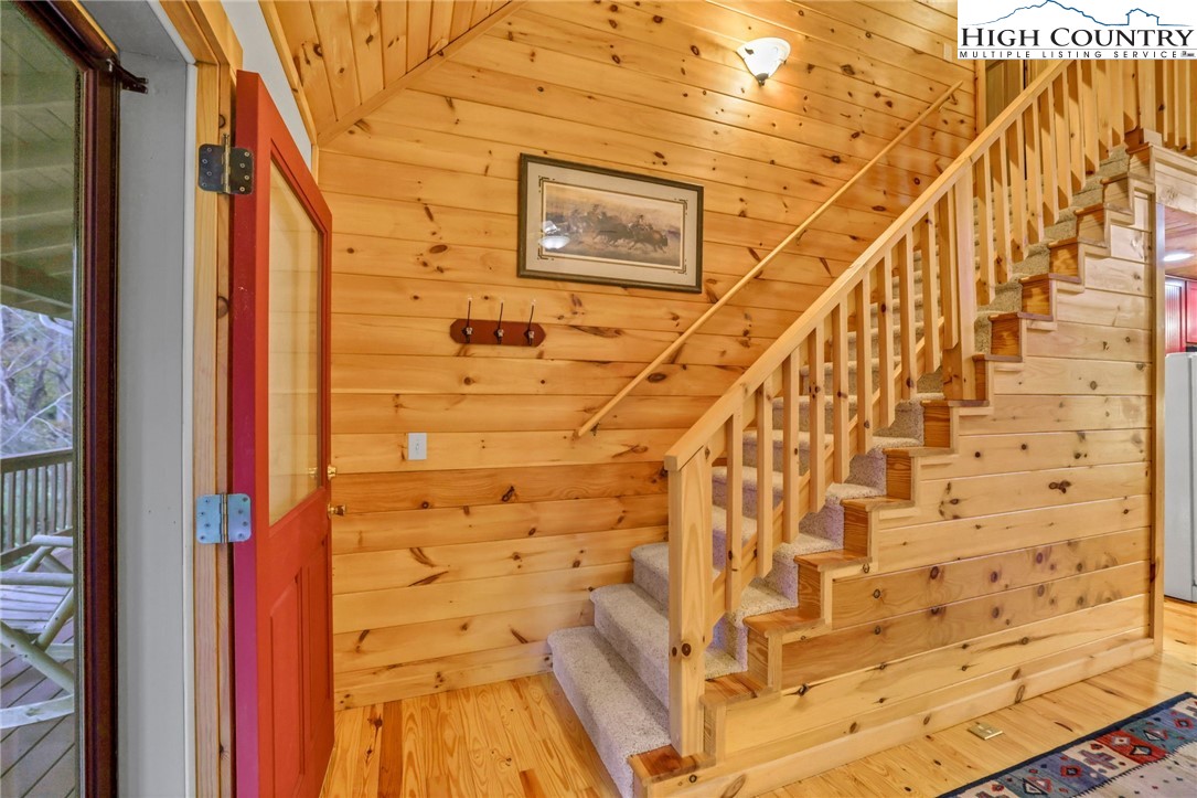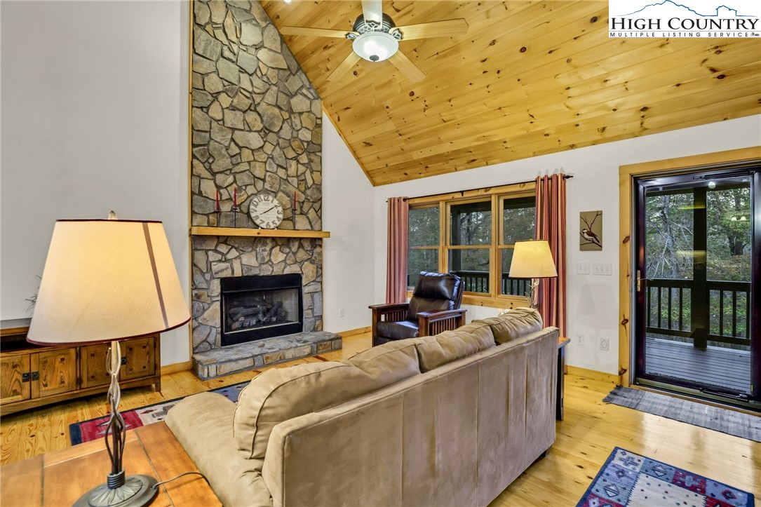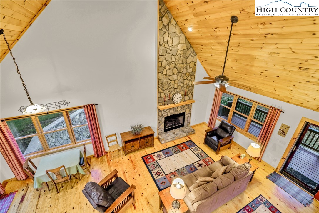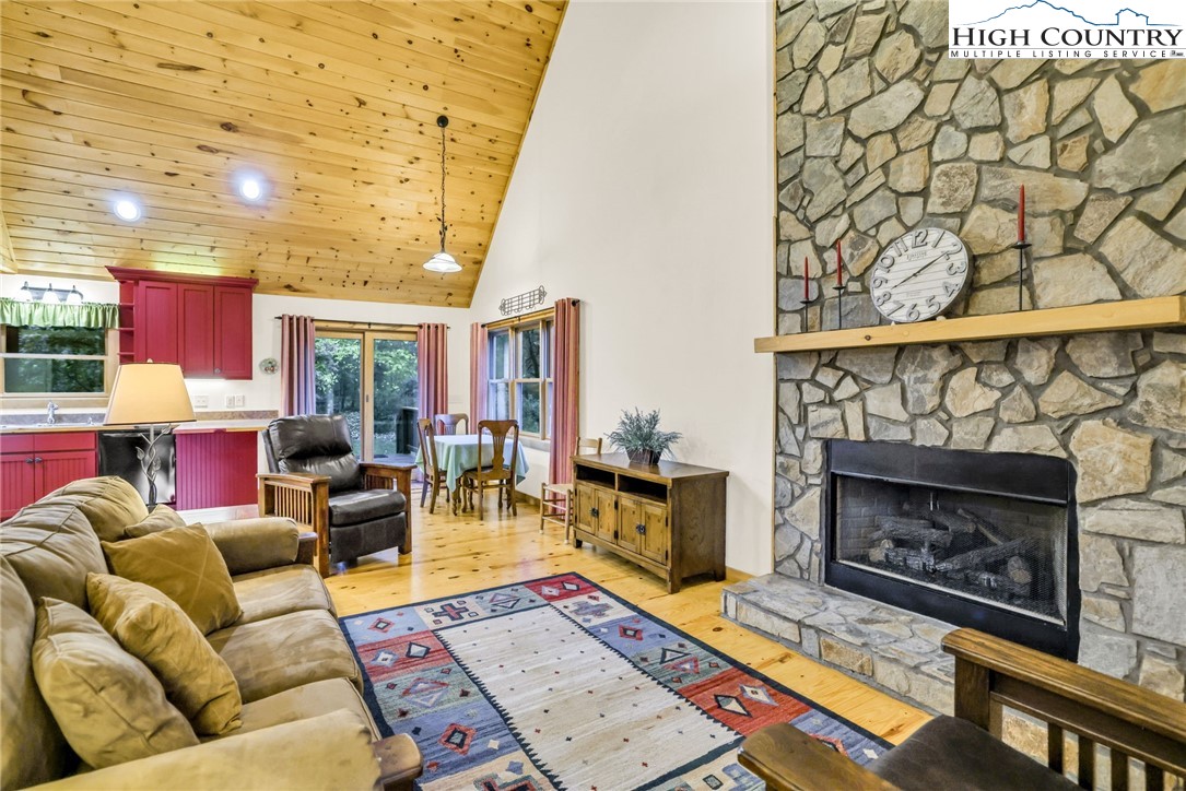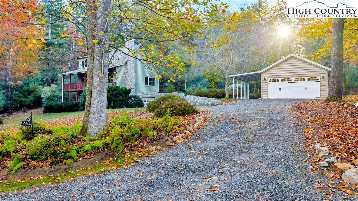 Beautifully Maintained Mountain Home Bordering the Blue Ridge Parkway. Located just steps from the Mountains-to-Sea Trail, this move-in ready home is a dream for hiking enthusiasts and nature lovers alike. Offered fully furnished, the home features a charming wood siding exterior with stone accents, recently painted exterior including porches (both front and back), and porch ceilings for a fresh, well-kept look. Beautiful landscaping with blueberry bushes, rhododendrons, lilacs, and more. Recent improvements include , New HVAC system installed in late 2024, New roof with metal drip edge added in late 2021. Once inside enjoy the spacious great room with cathedral ceilings, hardwood floors, tongue & groove ceilings, and a stunning stone fireplace. Open kitchen and dining area with access to a peaceful back porch overlooking a small pond with fountain. Bedroom and full bath on the main floor, which could be used as primary bedroom. Main level laundry closet with new washer and dryer (purchased June 2025) Upper level large bedroom suite with ensuite bath, soaking tub, and walk-in closet. Basement offers a head start on future living space with framing, insulation, electrical, and rough-in plumbing already place. Potential for a third bedroom, third bath, and second living space and includes a 1 car- garage. Additional structure includes detached 1-car garage (added in 2014) with covered area and full attic storage – perfect for vehicles, ATVs, equipment or workshop. Don’t miss the opportunity to own this exceptional mountain retreat with direct access to the Blue Ridge Parkway. Schedule your showing today!