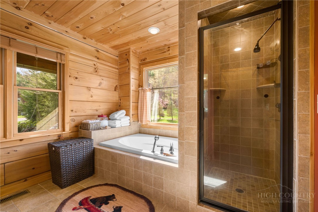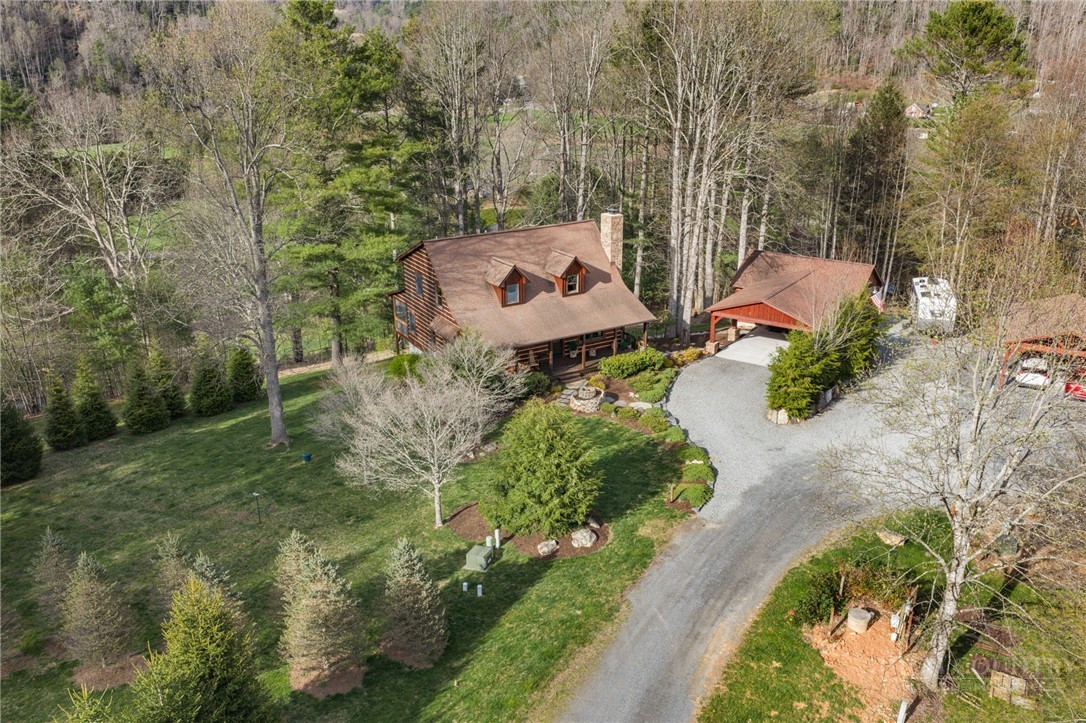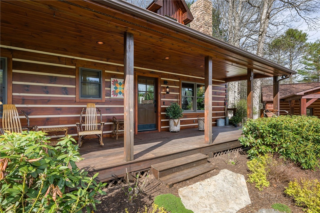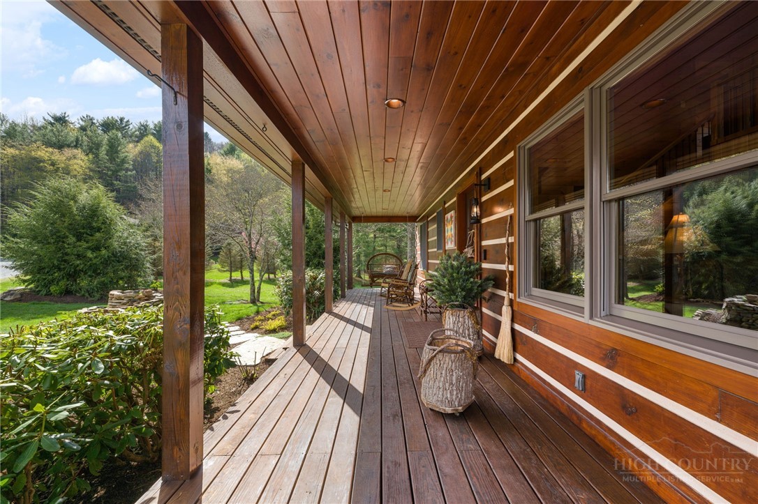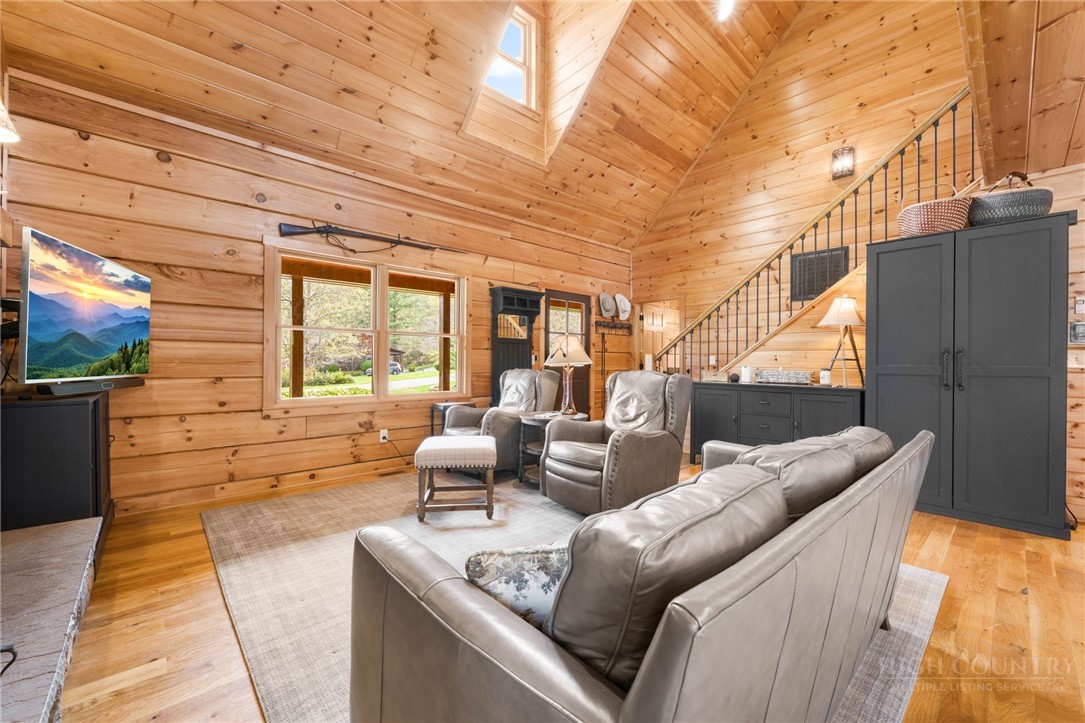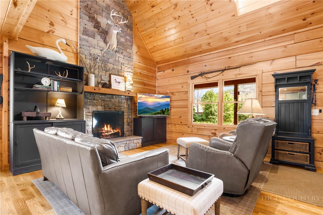 Luxury meets mountain living in this exceptionally well-maintained log cabin, privately situated on a 1-acre cul-de-sac lot in the desirable Riverwood subdivision close to the Watauga River and close proximity to historic Valle Crucis! This property is rare with usable land, gentle slopes, grassy areas and cool mountain breezes. The open-concept great room has a striking floor-to-ceiling stone wood-burning fireplace, complemented by hickory wood flooring throughout and a well-appointed kitchen featuring a cooktop island, custom cabinetry, granite countertops, and new stainless steel appliances—designed for both effortless entertaining and everyday comfort.The main-level primary suite offers a true retreat with a whirlpool tub, ceramic tile shower with glass door, and double vanity. Upstairs, an open loft, second bedroom, and full bath provide ideal space for guests, while the lower level expands the home’s versatility with a spacious media/bonus room, full bath, and additional sleeping area, plus walk-out access to a deck and level backyard.Covered front and back decks invite year-round enjoyment of the peaceful mountain setting, offering both privacy and a sense of escape just minutes from area amenities. A standout feature is the detached heated garage with over 1,000 square feet, added by the current owners—ideal for a workshop, recreation, or inviting outdoor entertaining space. Additional updates include a new HVAC furnace system (2024) and new kitchen appliances. The newly screened back deck is a showpiece, offering panoramic valley views and a breezy shady retreat- great for mountain coffee as fog lifts from the valley below. Properties of this caliber—combining privacy, thoughtful upgrades, and timeless mountain appeal—are increasingly rare in today’s market. A rare opportunity to own a mountain retreat where comfort, craftsmanship, and setting come together—this is the kind of place you’ll never want to leave. List of improvements can be provided. * No short term rentals less than 30 days*