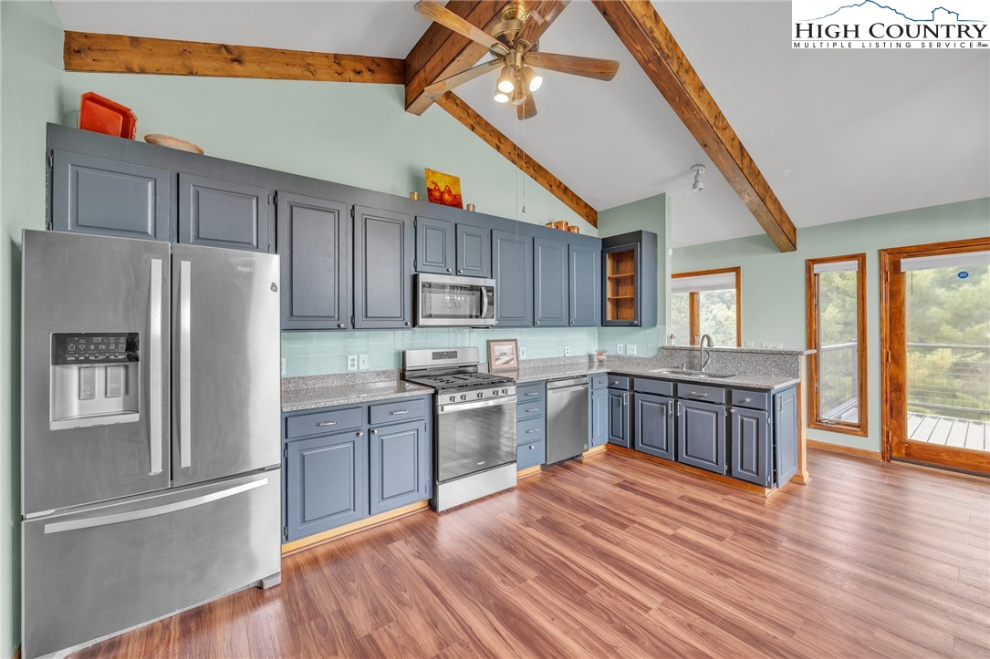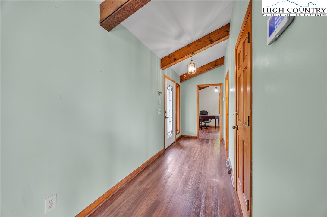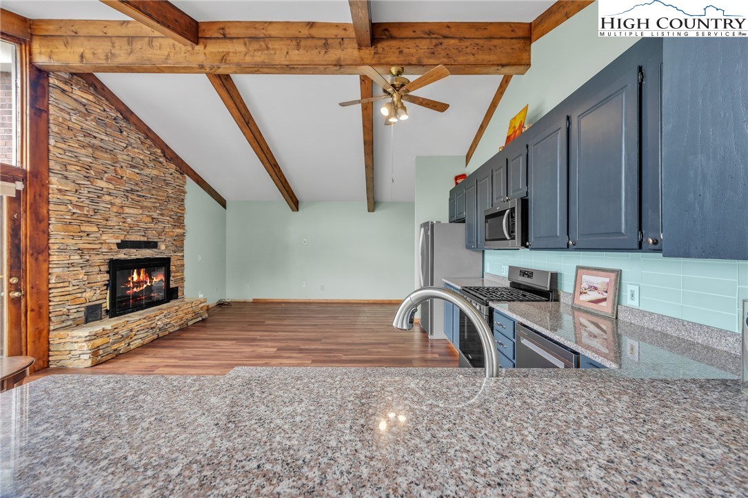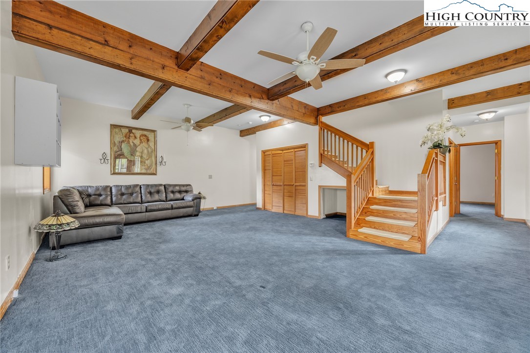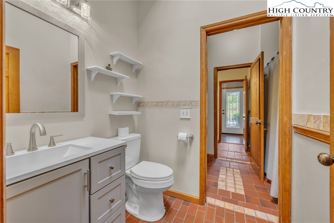 Mountain retreat with stunning scenic views! The main level features an open-concept floor plan connecting the living, kitchen, and dining areas, highlighted by a striking floor-to-ceiling stone fireplace, vaulted ceilings, and exposed beams throughout. The kitchen offers granite countertops and stainless steel appliances, great for both everyday living and entertaining. The primary bedroom includes double closets with additional storage above and shares a Jack-and-Jill style bathroom with a second bedroom or office. Each side is equipped with its own vanity and toilet, connected by a walk-in shower for convenience and privacy. Step outside to the open rear deck—recently updated with composite decking and wire mesh panels—an ideal space to relax, entertain, and take in the mountain views, with potential for even more expansive vistas through selective tree trimming. The lower level offers a spacious family room, two guest bedrooms with a shared Jack-and-Jill bath featuring a tub/shower combo, a laundry area, and a bright sunroom filled with natural light. Recent updates include a new roof (2023) and two new heat pumps (2023). Additional features include a two-car carport, extra parking, and a walk-in crawl space providing excellent storage. Conveniently located just minutes from Jefferson and West Jefferson, with easy access to grocery stores, restaurants, shops, art galleries, and local entertainment.