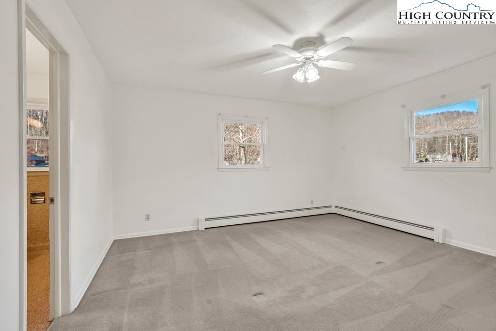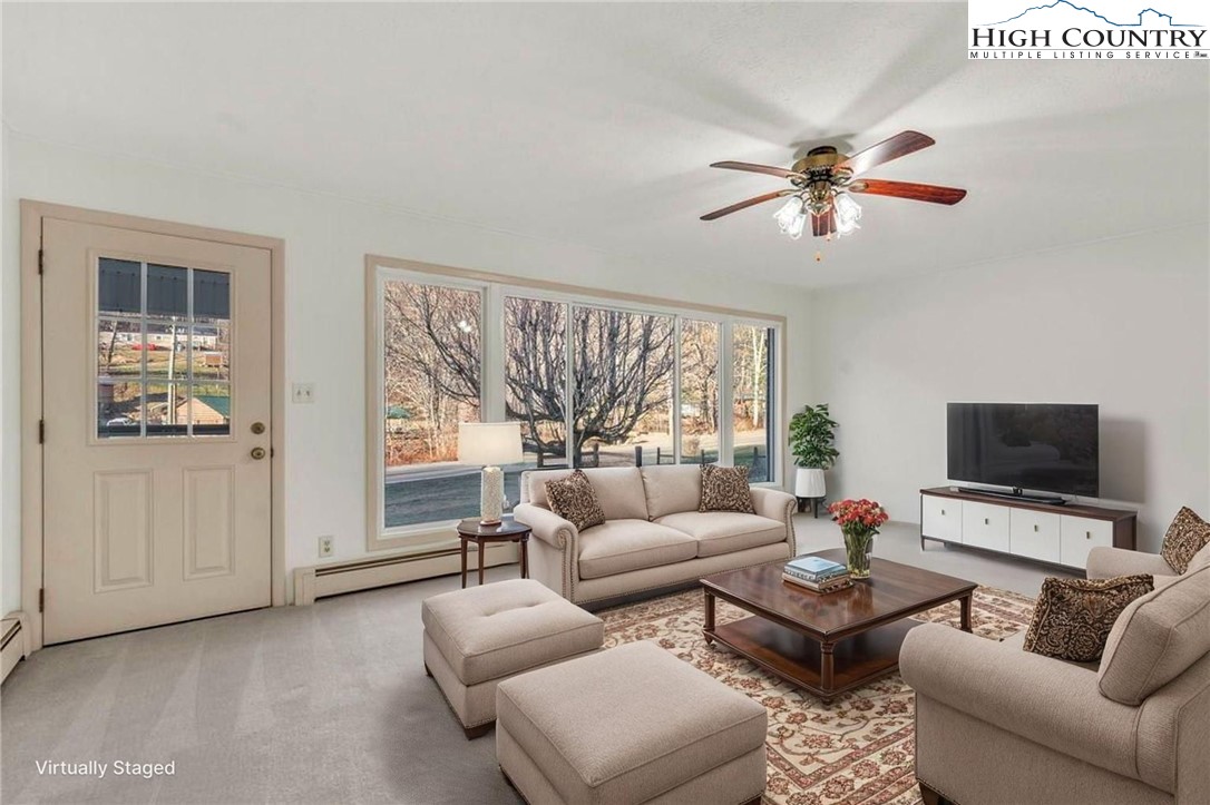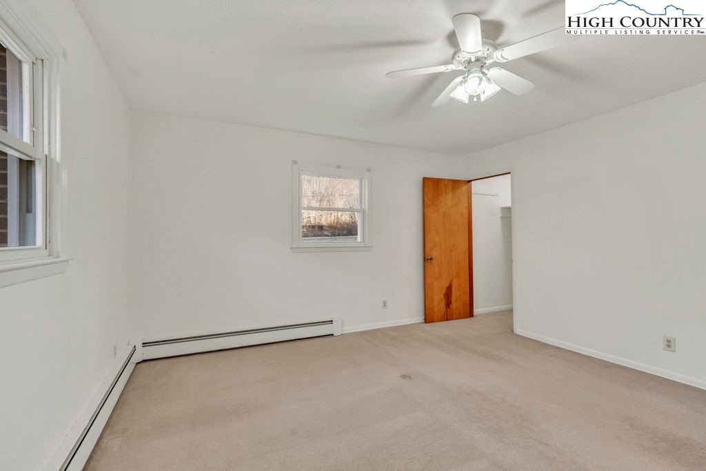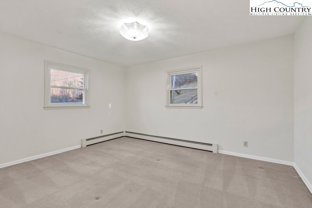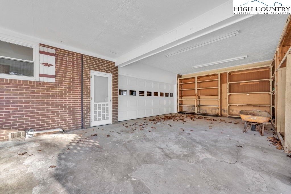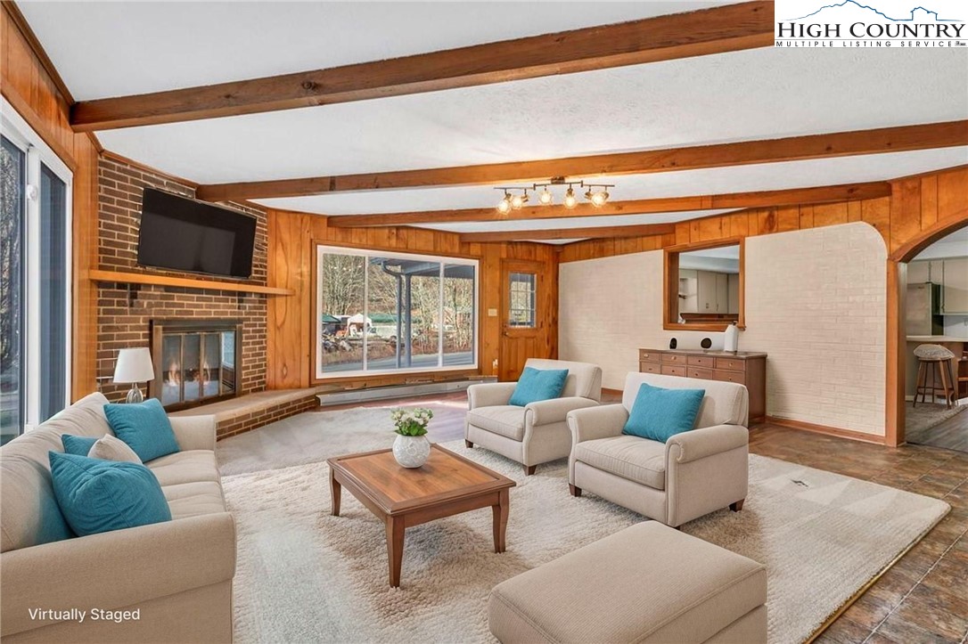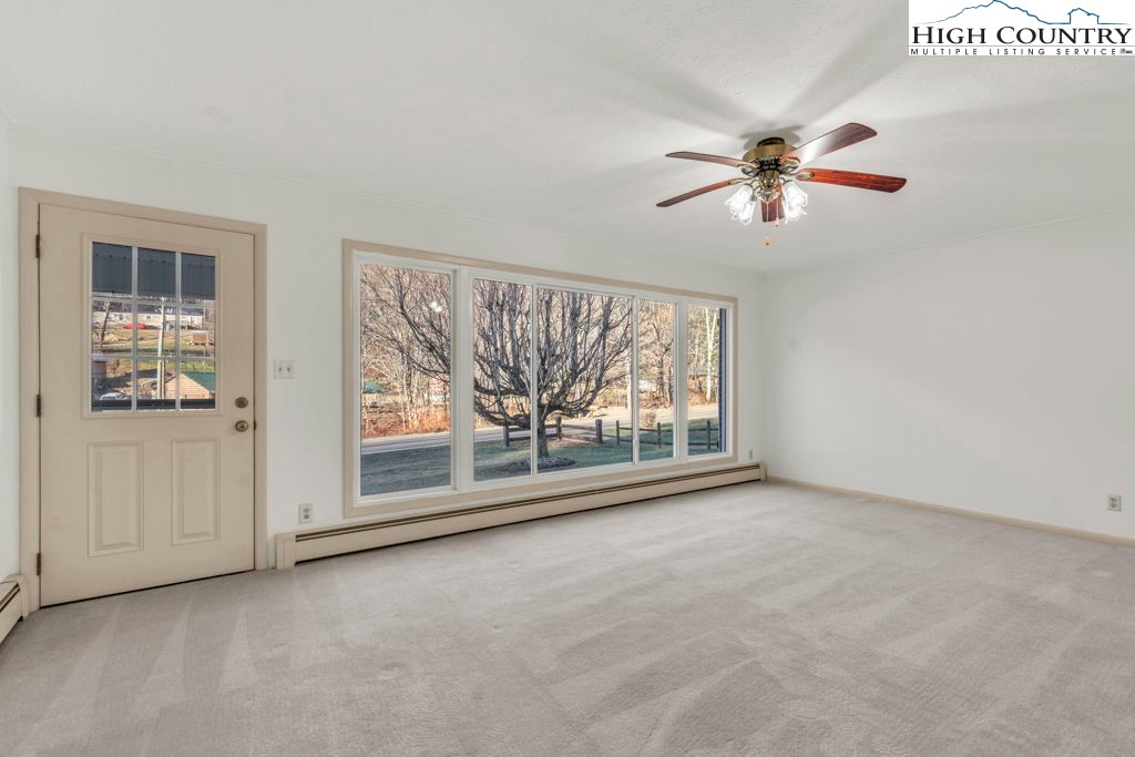 Well-maintained, single-level brick home offering comfortable living with thoughtful features throughout. This 3-bedroom, 2-bath residence features a large kitchen with abundant cabinet space and passthrough to the living room, a big electric range with hood vent, bay window, and adjoining dining area with gas log fireplace. The spacious parlor with large windowns and ample sunlight, wide hallway, and generous closet space enhance everyday functionality. Flooring includes vinyl and carpet, LVP, Torigal flooring, counter tops, & walls. The primary bedroom offers a walk-in closet and ensuite bath. The laundry room functions as a mud room to the garage and includes a utility sink. Additional highlights include double-pane vinyl windows, storm door, crawl space, and an electric water heater. Heating options include oil baseboard heat (above-ground tank), a wood-burning fireplace ( stone / Brick ), gas logs, and a woodstove in the garage. A propane heater with stone surround is also located in the garage (no propane tank installed). The home features a durable tin roof (approx. 18 years) plus a recently updated flat roof section, along with newer gutters. Exterior amenities include a paved driveway, double garage doors with access to the rear yard, covered front porch, covered workshop space, and a level yard. Septic system is located at the rear of the property. The well is positioned to the right of the driveway and includes an iron filtration system serviced by Brooks Heating & Plumbing. Property experienced no known issues during Hurricane Helene. One-owner home with pride of ownership evident throughout. Enjoy a peaceful setting with a stocked Meat Camp Creek across the road, just 5 minutes to Elk Knob and approximately 15 minutes to Boone situated over 3,400 ft above sea level.