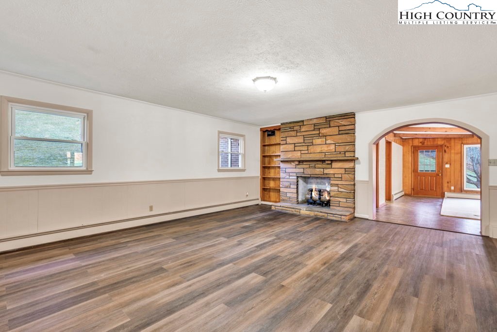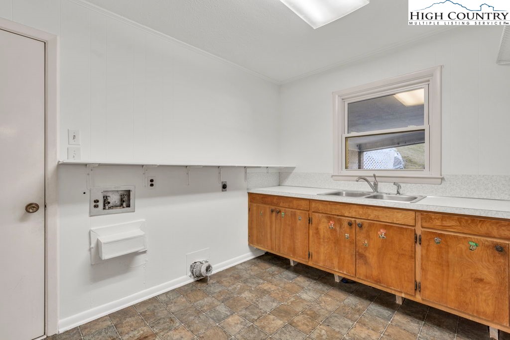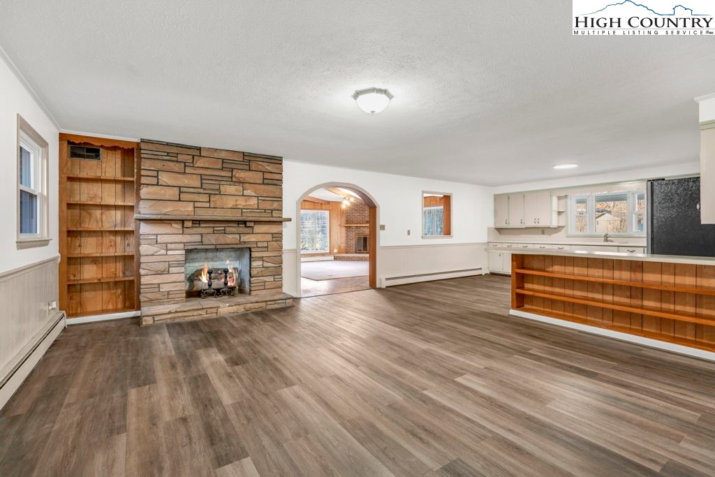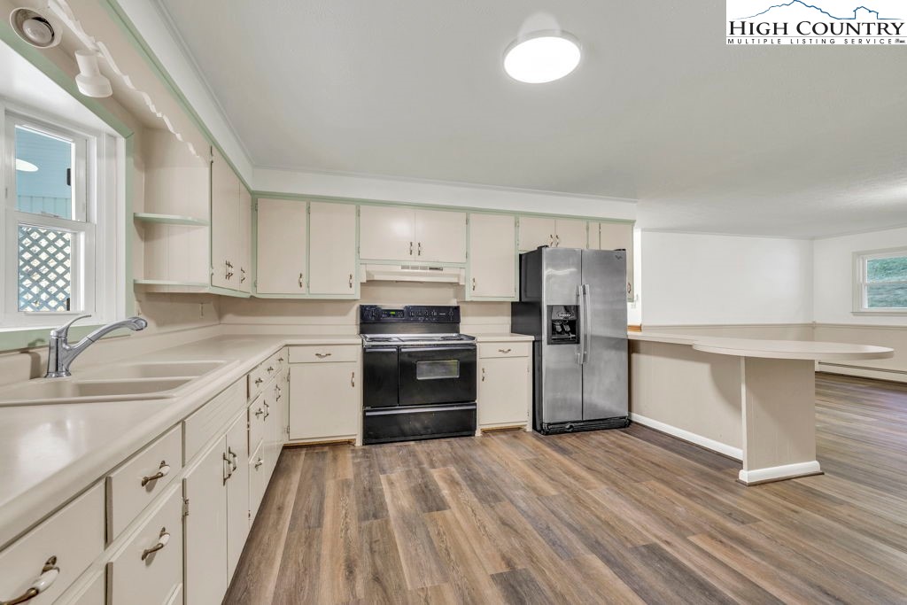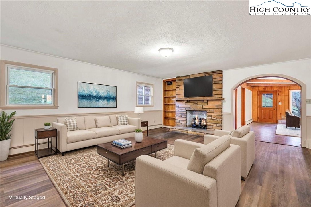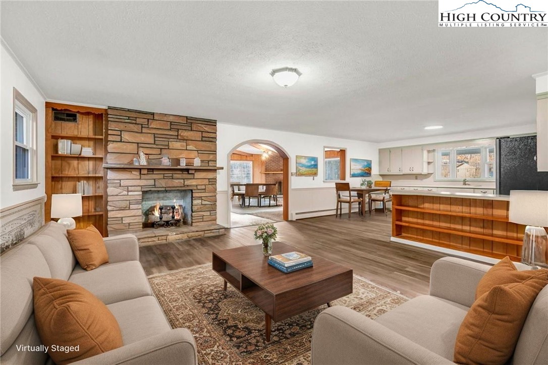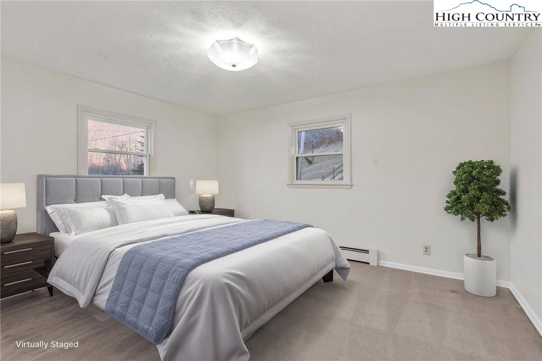 Well-maintained, single-level brick home offering comfortable living with thoughtful features throughout. This 3-bedroom, 2-bath residence features a large kitchen with abundant cabinet space and passthrough to the living room, a big electric range with hood vent, bay window, and adjoining dining area with gas log fireplace. The spacious parlor with large windowns and ample sunlight, wide hallway, and generous closet space enhance everyday functionality. Flooring includes vinyl and carpet, LVP, Torigal flooring, counter tops, & walls. The primary bedroom offers a walk-in closet and ensuite bath. The laundry room functions as a mud room to the garage and includes a utility sink. Additional highlights include double-pane vinyl windows, storm door, crawl space, and an electric water heater. Heating options include oil baseboard heat (above-ground tank), a wood-burning fireplace ( stone / Brick ), gas logs, and a woodstove in the garage. A propane heater with stone surround is also located in the garage (no propane tank installed). The home features a durable tin roof (approx. 18 years) plus a recently updated flat roof section, along with newer gutters. Exterior amenities include a paved driveway, double garage doors with access to the rear yard, covered front porch, covered workshop space, and a level yard. Septic system is located at the rear of the property. The well is positioned to the right of the driveway and includes an iron filtration system serviced by Brooks Heating & Plumbing. Property experienced no known issues during Hurricane Helene. One-owner home with pride of ownership evident throughout. Enjoy a peaceful setting with a stocked Meat Camp Creek across the road, just 5 minutes to Elk Knob and approximately 15 minutes to Boone situated over 3,400 ft above sea level.