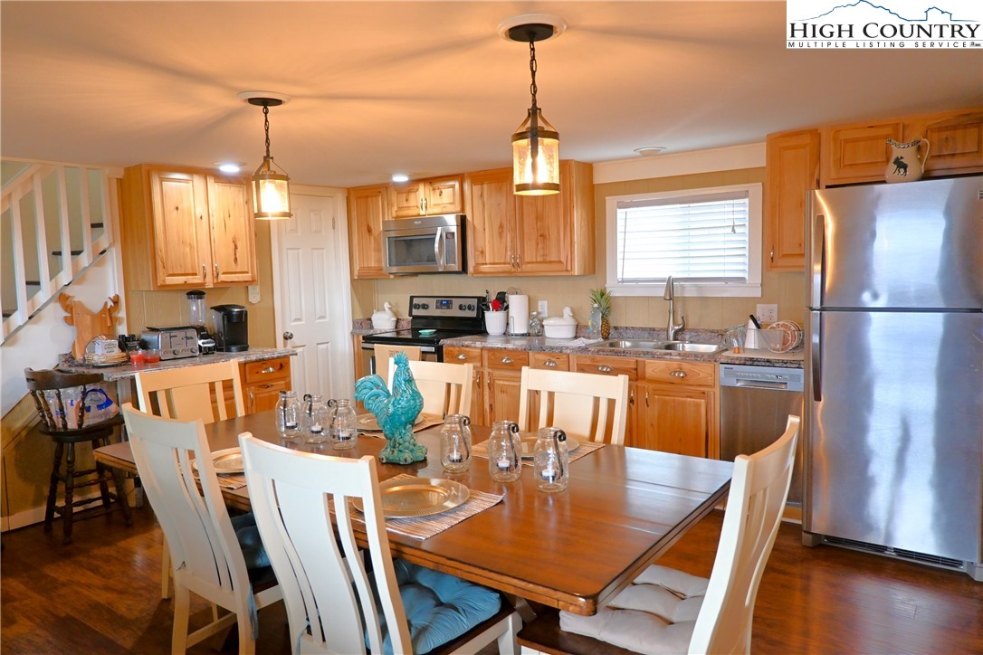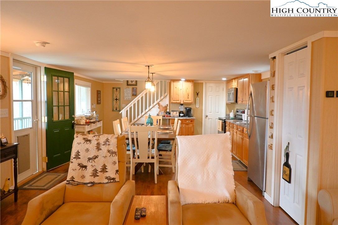 Meticulously maintained Turn-key Mountain cottage on over 3 acres with In your face long range mountain views located near the New River. What more could you want at this price? Open dining/living area with half bath. Sofa in living room pulls out to a queen bed for additional sleeping. Huge dining table in kitchen for all to gather around. Upstairs you will find a Bedroom, full bath, laundry and another sitting/sleeping area for guests. Sit back and relax at the Fire Pit and enjoy nature in a peaceful and serene setting. The parcel where home sits is fully fenced in for the children to play and fur babies alike. There is also an additional adjoining lot that is included. This home will be great for full time or getaway living. See documents for 2BR Septic Permit.