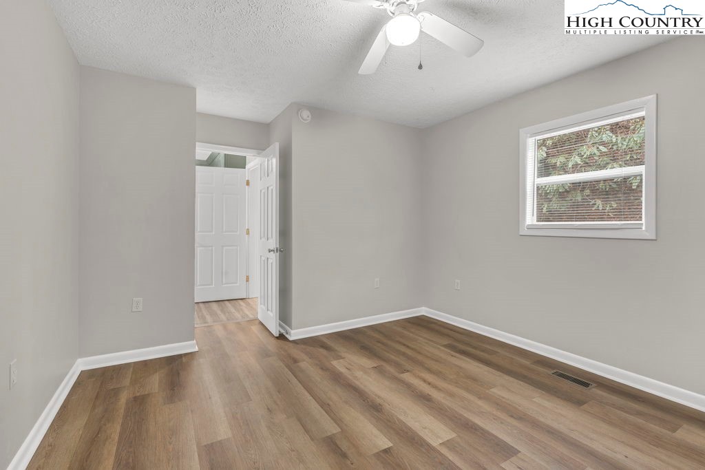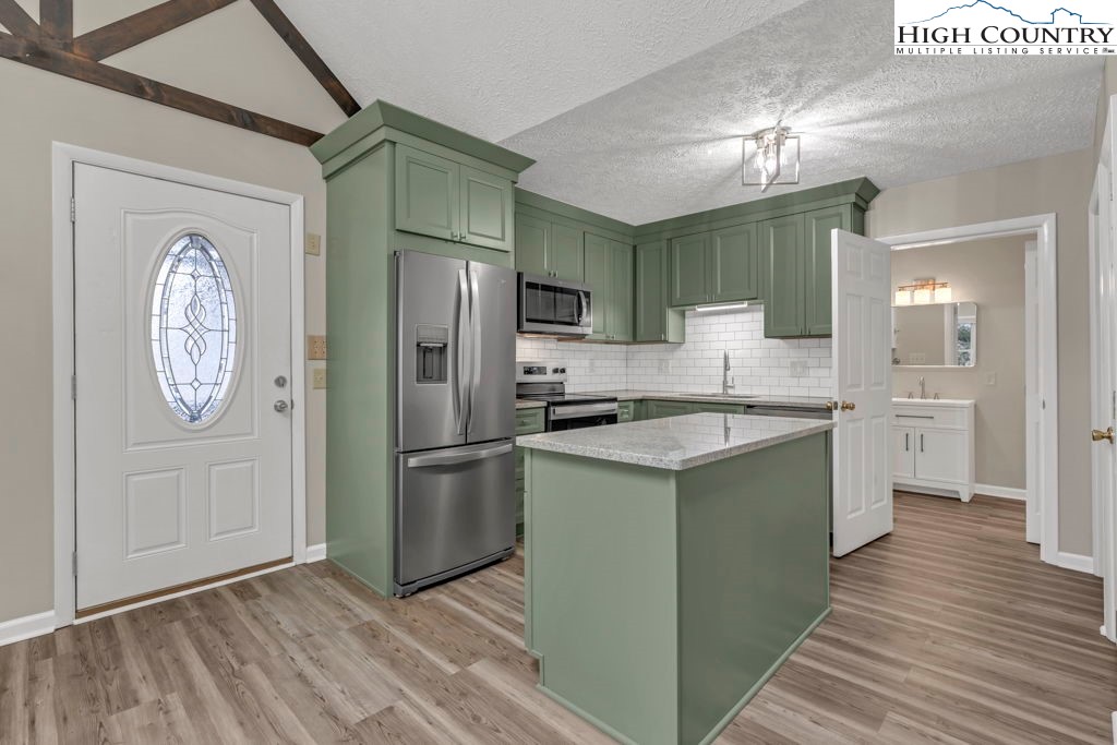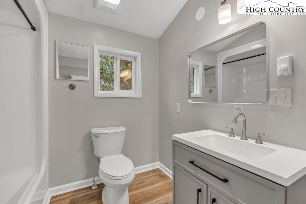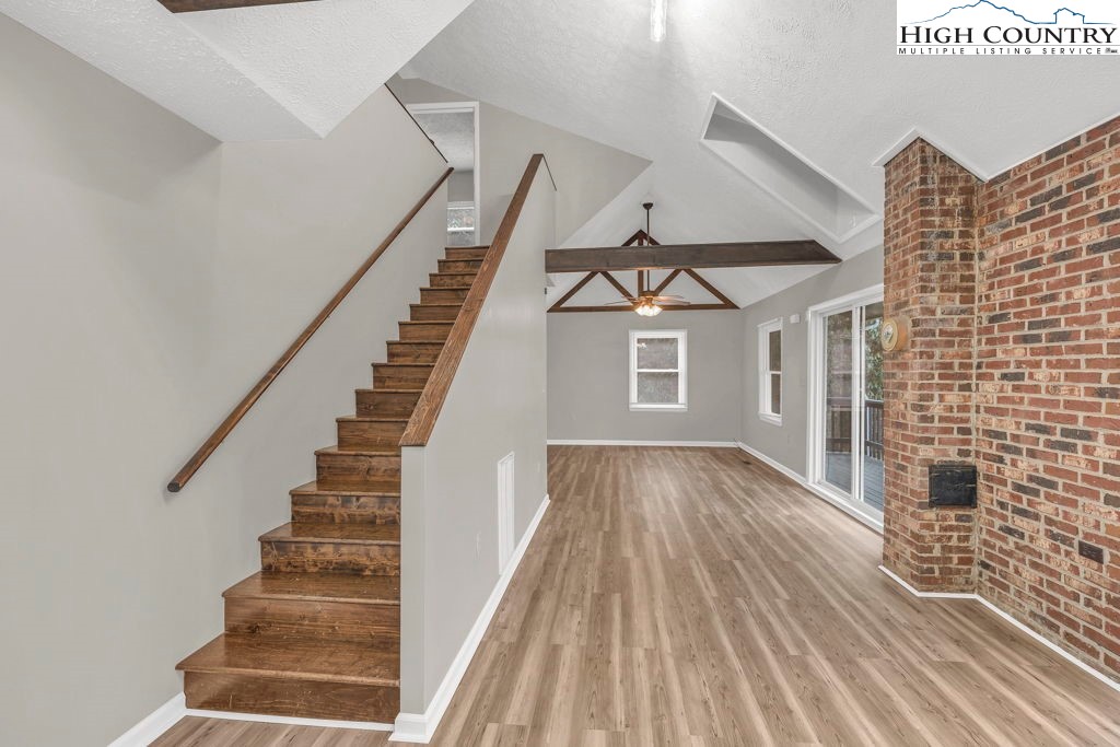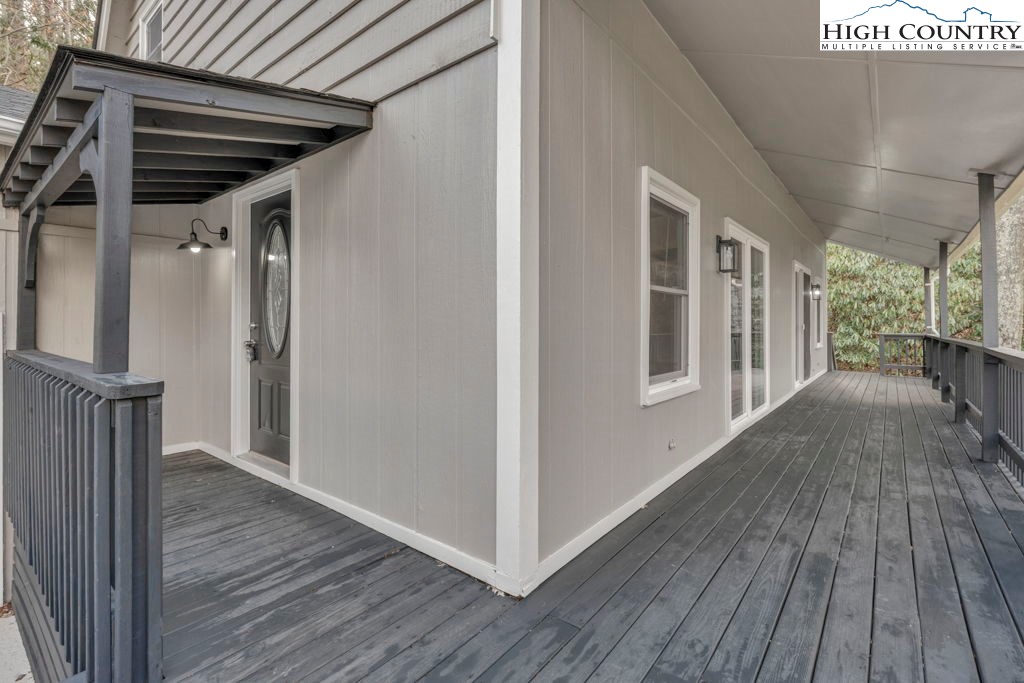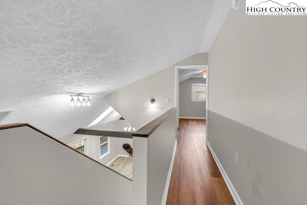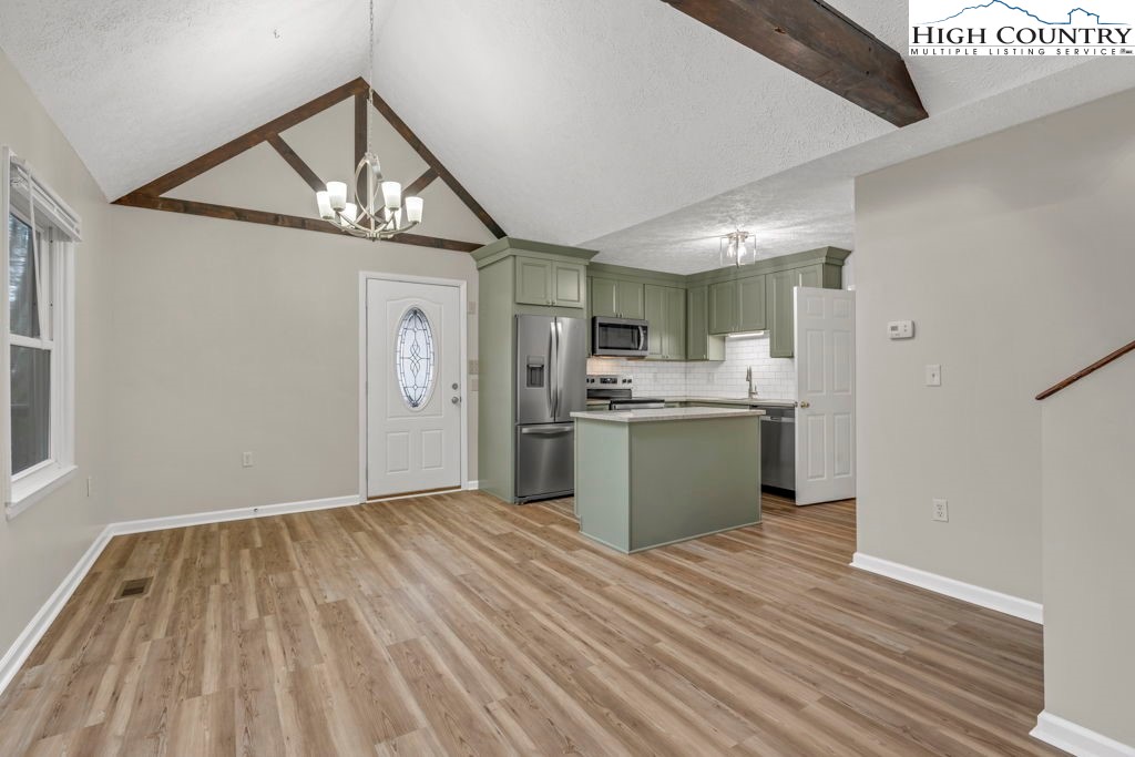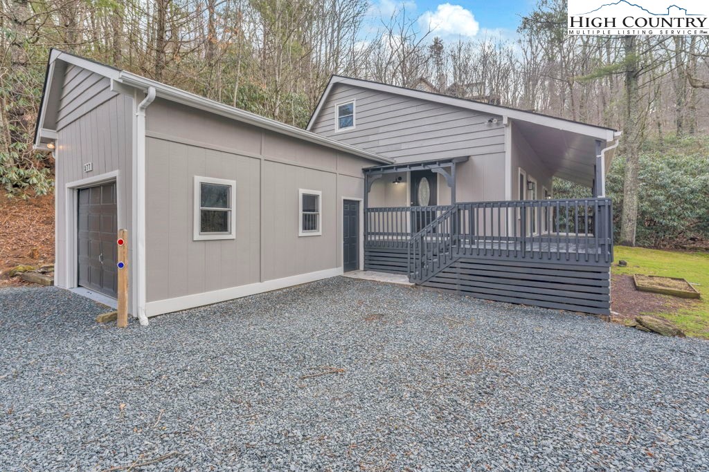 4 BR / 3BA mountain home offering a functional layout and convenient location. The entry level features high ceilings, laminate flooring, and an open living area with flue in place for a future stove or fireplace. The kitchen has been updated with new cabinetry, stainless steel appliances, and a built-in microwave fan. Two bedrooms and two full baths are located on the main level, including a primary suite with private ensuite bath. Upstairs offers two additional bedrooms connected by a shared Jack-and-Jill bath, providing flexible space for guests, family, or home office use. Outdoor features include a covered front porch accessed by two sliding glass doors, a fire pit area for enjoying cool mountain evenings, and potential seasonal views toward Appalachian Ski Mountain. Additional highlights include an attached single-car garage. A great option for full-time living, a second home, or investment property in the High Country.