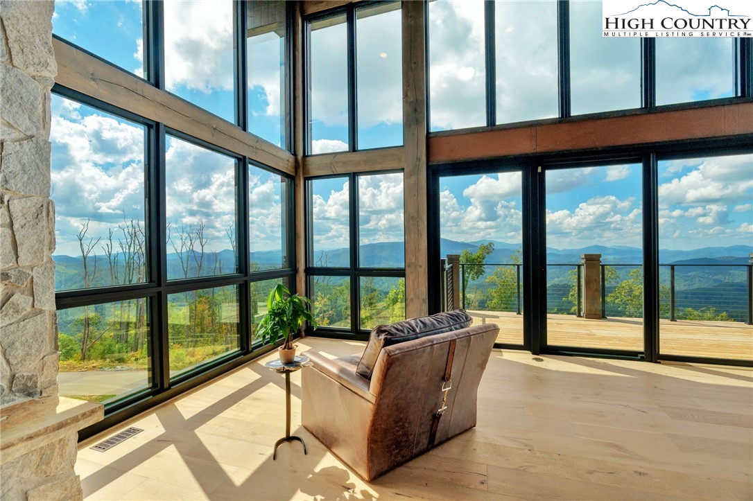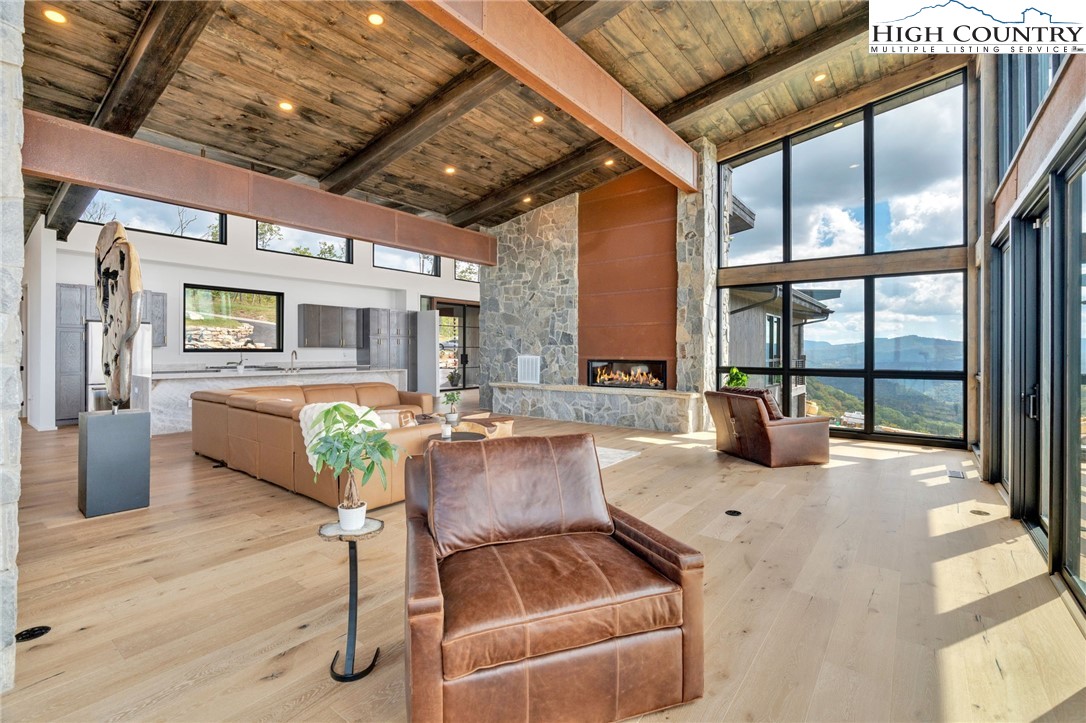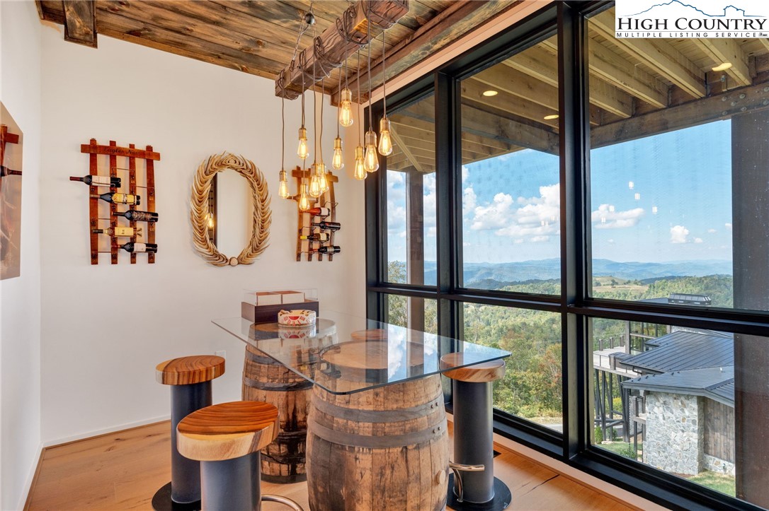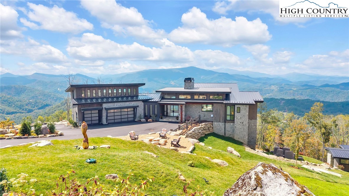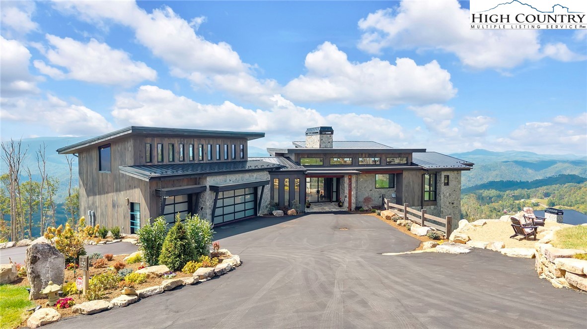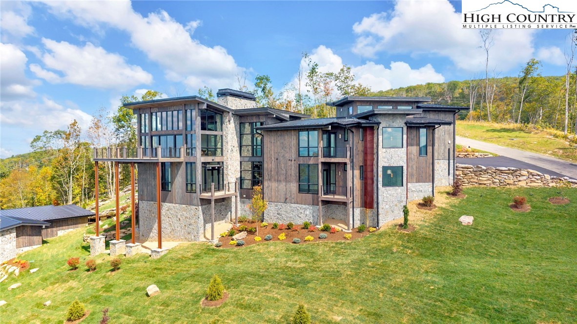 Located in the coveted Sunset Section of The Lodges at Eagles Nest, the Eagles Nest Glass House is an exceptional custom estate redefining mountain living through masterful design and craftsmanship. Developed over three years, this architectural showcase occupies 1.033 acres, where rugged natural beauty blends seamlessly with refined elegance. The residence offers 7,055 sq ft of heated living space, excluding the three-car garage. Perched at 4,400 feet elevation, it commands panoramic views spanning North Carolina to Tennessee mountains, framed by awe-inspiring sunsets. The exterior presents a stylish mountain retreat with white pine-stained wood siding, expansive windows, and rustic metal beams. Over $250,000 was invested in professional landscaping, featuring natural boulders, enhanced lighting, and intricate hardscaping that create an impressive arrival experience. Outdoor living shines with 860+ sq ft of decking, a large hot tub, hand-laid stone pillars, and custom steel beams designed to highlight the sweeping vistas. An inviting fire pit promises memorable evenings beneath the stars. Entry by a grand custom glass door reveals a great room with soaring two-story glass walls that flood the interior with natural light while framing the stunning surroundings. Nickel gap white pine-stained ceilings with rustic beams combine rustic warmth and modern elegance, accented by hand-laid rock, light-toned floors, and a custom rusted gas fireplace. The gourmet kitchen impresses with Onyx Waterfall Island countertops, stainless steel appliances, and a wine cooler. The lower level houses a large custom bar, wine cellar, and a flexible bonus room suited for theater, family gatherings, or games. Throughout are handmade floating handmade stairs, custom wood ceilings, stone accents, custom glass windows, and exterior stonework. There are five spacious bedrooms, each with meticulously finished bathrooms featuring hand-laid stone, marble, various tiles, and teakwood benches. Two additional half-baths are located on each floor. Two generous primary suites, one on the main level and one on the lower level, feature spa-inspired bathrooms and conveniently located adjacent utility rooms. Above the garage, featuring hand painted bronze epoxy floors, lies a distinctive bunk room with a full bath and an expansive rec room. Roughly half of this 275 sq ft area features ceiling heights between 5 and 7 feet. The home is enhanced by commissioned artwork and custom furnishings throughout, reinforcing its one-of-a-kind character. Residents enjoy an extensive amenity offering including ATV and hiking trails, ropes course, playground, dog park, mini-golf, disc golf, archery, versatile sports fields, and courts for volleyball, basketball, tennis, and pickleball. Enjoy world class trout fishing along the Elk River with over 2000 ft of river frontage. Dining options include Eagles Nest Winery, Epic Chophouse and The Sportsman’s Grille. Additional amenities include a 24-hour Dollar General, an outdoor amphitheater offering live entertainment on Saturday evenings from May through October, fitness center, and two helicopter pads. This estate transcends standard mountain homes by flawlessly combining luxury, nature, and architectural brilliance, inviting an elevated mountain lifestyle. Adjacent to this property, a 4,959 sq ft neighboring estate (MLS #258350) is also available, presenting a rare opportunity for main and guest house combination. 4 year home warranty provided
