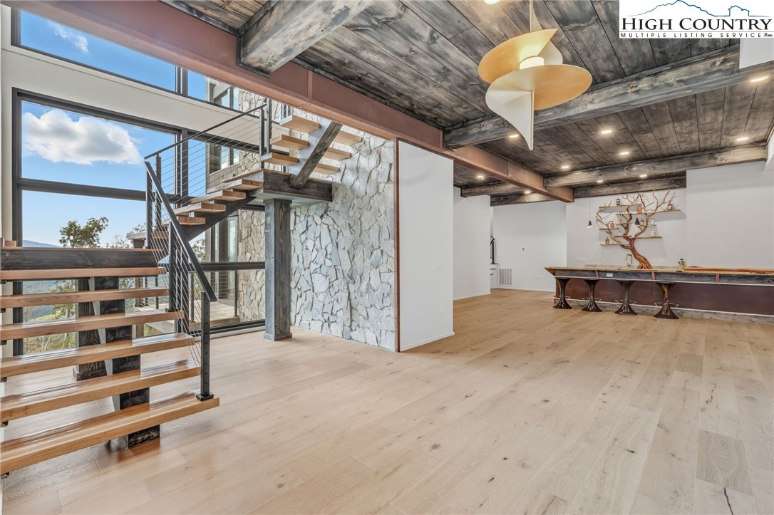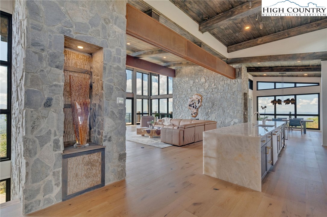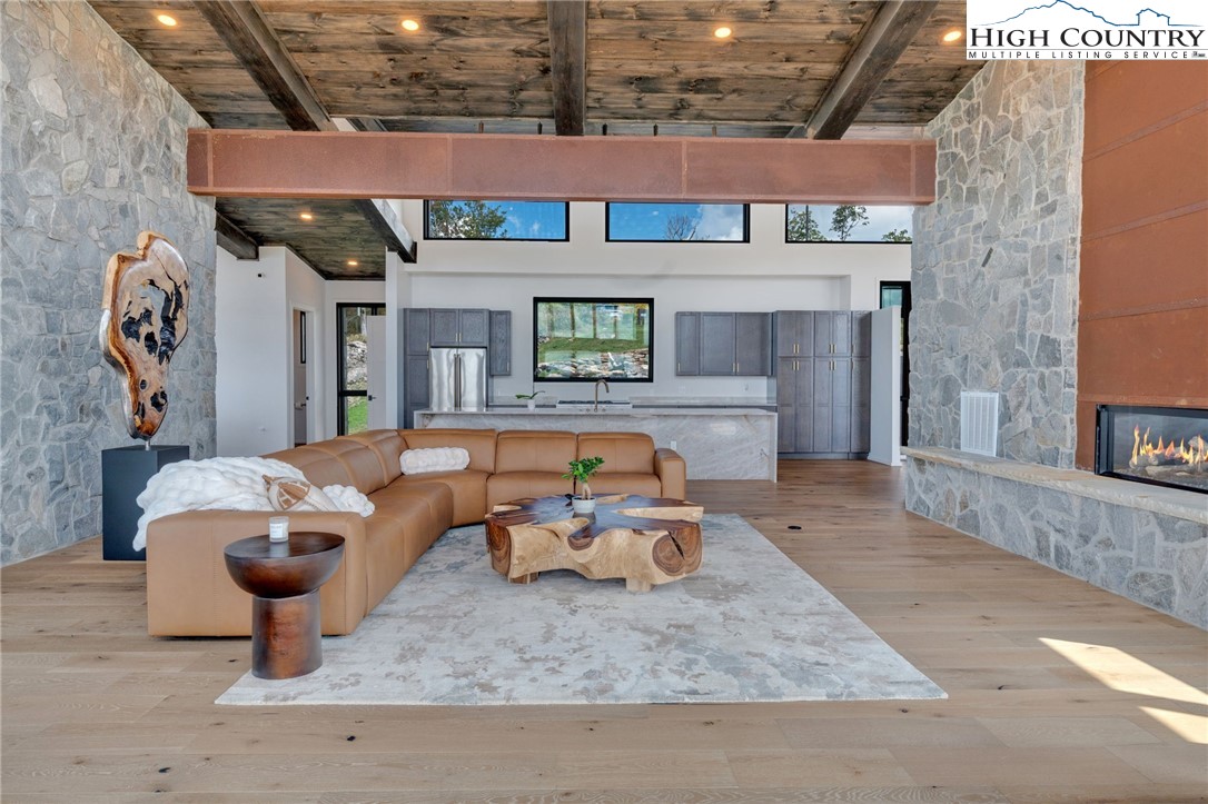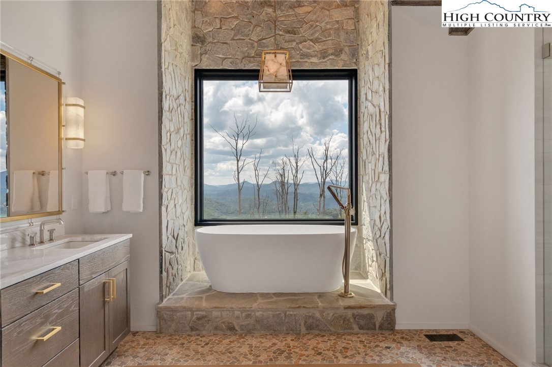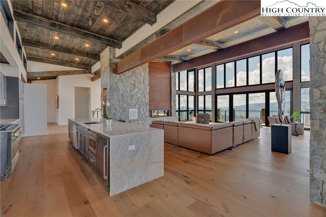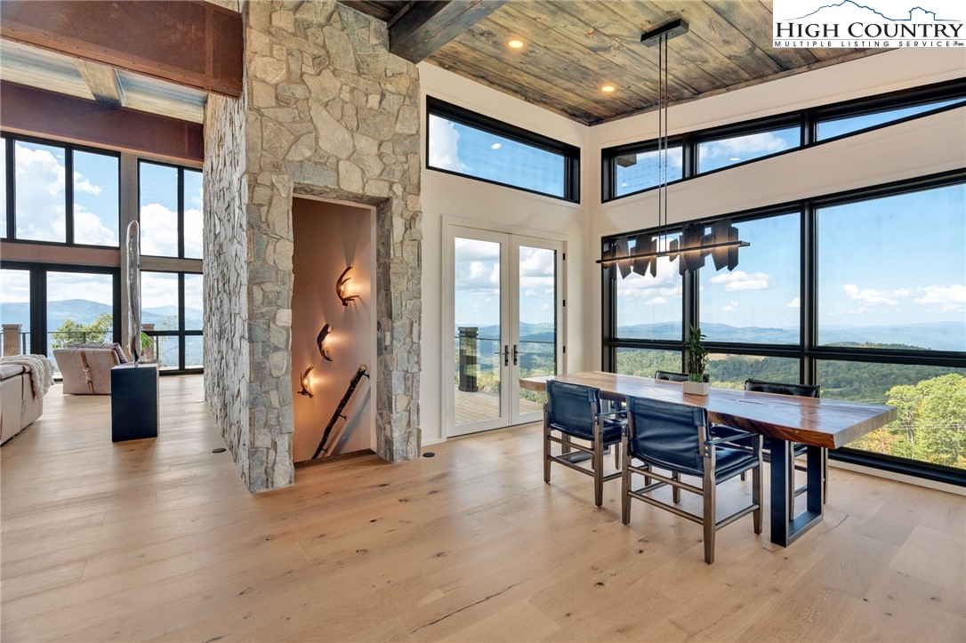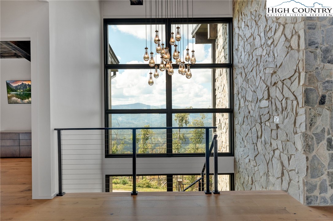 Located in the coveted Sunset Section of The Lodges at Eagles Nest, the Eagles Nest Glass House is an exceptional custom estate redefining mountain living through masterful design and craftsmanship. Developed over three years, this architectural showcase occupies 1.033 acres, where rugged natural beauty blends seamlessly with refined elegance. The residence offers 7,055 sq ft of heated living space, excluding the three-car garage. Perched at 4,400 feet elevation, it commands panoramic views spanning North Carolina to Tennessee mountains, framed by awe-inspiring sunsets. The exterior presents a stylish mountain retreat with white pine-stained wood siding, expansive windows, and rustic metal beams. Over $250,000 was invested in professional landscaping, featuring natural boulders, enhanced lighting, and intricate hardscaping that create an impressive arrival experience. Outdoor living shines with 860+ sq ft of decking, a large hot tub, hand-laid stone pillars, and custom steel beams designed to highlight the sweeping vistas. An inviting fire pit promises memorable evenings beneath the stars. Entry by a grand custom glass door reveals a great room with soaring two-story glass walls that flood the interior with natural light while framing the stunning surroundings. Nickel gap white pine-stained ceilings with rustic beams combine rustic warmth and modern elegance, accented by hand-laid rock, light-toned floors, and a custom rusted gas fireplace. The gourmet kitchen impresses with Onyx Waterfall Island countertops, stainless steel appliances, and a wine cooler. The lower level houses a large custom bar, wine cellar, and a flexible bonus room suited for theater, family gatherings, or games. Throughout are handmade floating handmade stairs, custom wood ceilings, stone accents, custom glass windows, and exterior stonework. There are five spacious bedrooms, each with meticulously finished bathrooms featuring hand-laid stone, marble, various tiles, and teakwood benches. Two additional half-baths are located on each floor. Two generous primary suites, one on the main level and one on the lower level, feature spa-inspired bathrooms and conveniently located adjacent utility rooms. Above the garage, featuring hand painted bronze epoxy floors, lies a distinctive bunk room with a full bath and an expansive rec room. Roughly half of this 275 sq ft area features ceiling heights between 5 and 7 feet. The home is enhanced by commissioned artwork and custom furnishings throughout, reinforcing its one-of-a-kind character. Residents enjoy an extensive amenity offering including ATV and hiking trails, ropes course, playground, dog park, mini-golf, disc golf, archery, versatile sports fields, and courts for volleyball, basketball, tennis, and pickleball. Enjoy world class trout fishing along the Elk River with over 2000 ft of river frontage. Dining options include Eagles Nest Winery, Epic Chophouse and The Sportsman’s Grille. Additional amenities include a 24-hour Dollar General, an outdoor amphitheater offering live entertainment on Saturday evenings from May through October, fitness center, and two helicopter pads. This estate transcends standard mountain homes by flawlessly combining luxury, nature, and architectural brilliance, inviting an elevated mountain lifestyle. Adjacent to this property, a 4,959 sq ft neighboring estate (MLS #258350) is also available, presenting a rare opportunity for main and guest house combination. 4 year home warranty provided