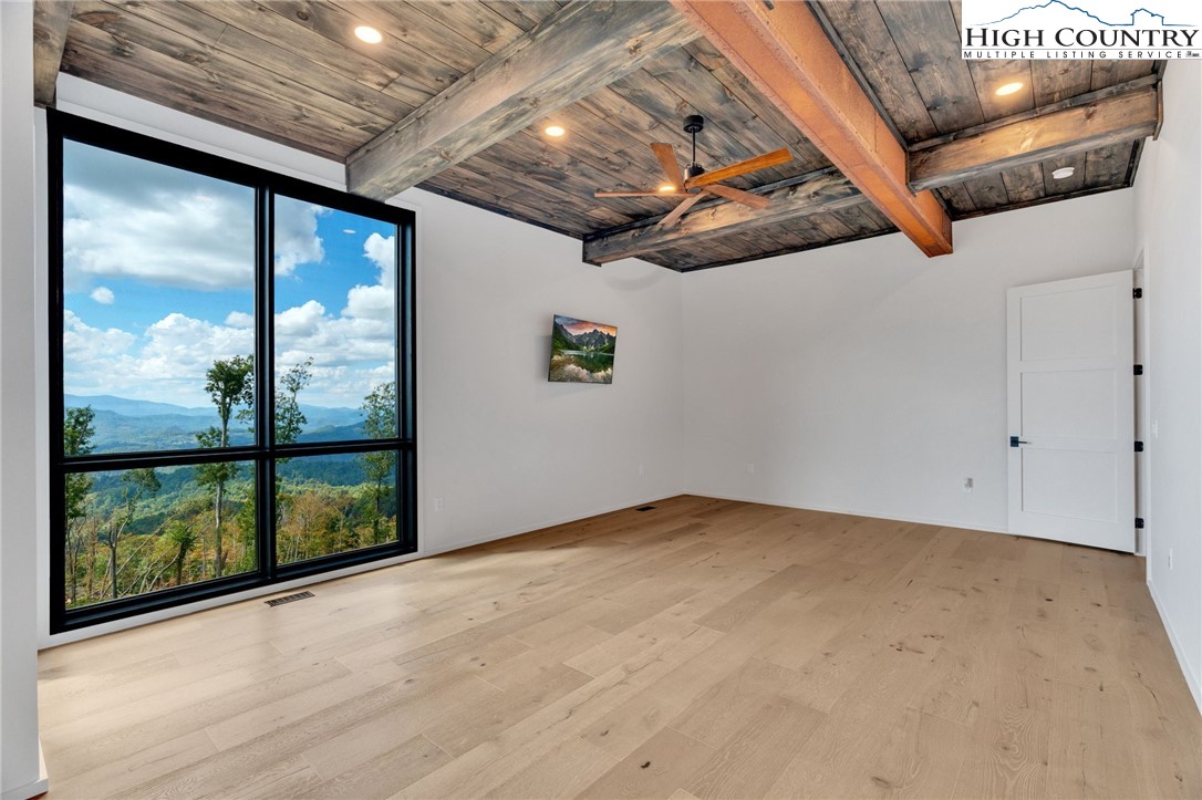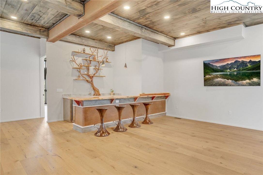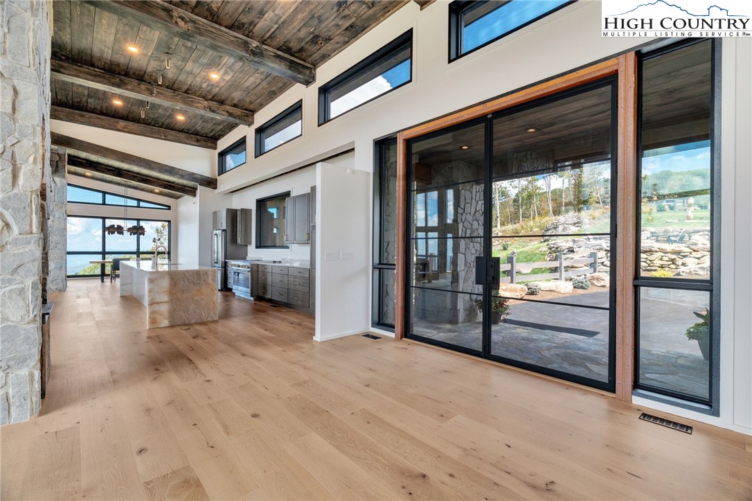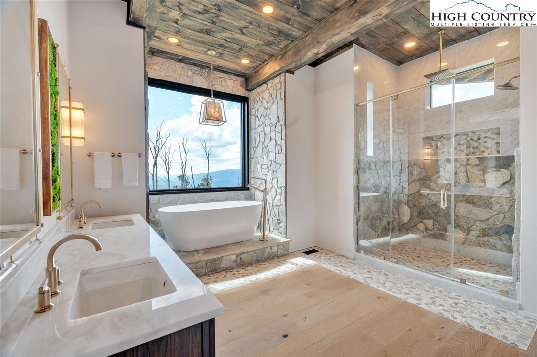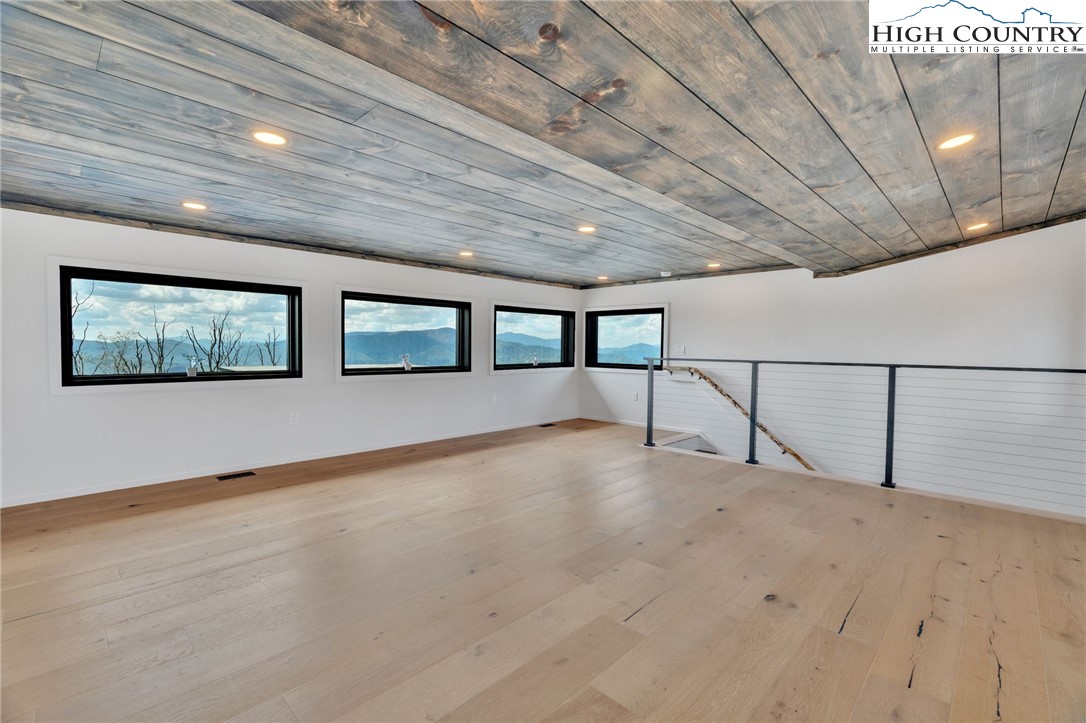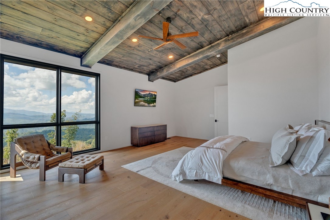 Located in the coveted Sunset Section of The Lodges at Eagles Nest, the Eagles Nest Glass House is an exceptional custom estate redefining mountain living through masterful design and craftsmanship. Developed over three years, this architectural showcase occupies 1.033 acres, where rugged natural beauty blends seamlessly with refined elegance. The residence offers 7,055 sq ft of heated living space, excluding the three-car garage. Perched at 4,400 feet elevation, it commands panoramic views spanning North Carolina to Tennessee mountains, framed by awe-inspiring sunsets. The exterior presents a stylish mountain retreat with white pine-stained wood siding, expansive windows, and rustic metal beams. Over $250,000 was invested in professional landscaping, featuring natural boulders, enhanced lighting, and intricate hardscaping that create an impressive arrival experience. Outdoor living shines with 860+ sq ft of decking, a large hot tub, hand-laid stone pillars, and custom steel beams designed to highlight the sweeping vistas. An inviting fire pit promises memorable evenings beneath the stars. Entry by a grand custom glass door reveals a great room with soaring two-story glass walls that flood the interior with natural light while framing the stunning surroundings. Nickel gap white pine-stained ceilings with rustic beams combine rustic warmth and modern elegance, accented by hand-laid rock, light-toned floors, and a custom rusted gas fireplace. The gourmet kitchen impresses with Onyx Waterfall Island countertops, stainless steel appliances, and a wine cooler. The lower level houses a large custom bar, wine cellar, and a flexible bonus room suited for theater, family gatherings, or games. Throughout are handmade floating handmade stairs, custom wood ceilings, stone accents, custom glass windows, and exterior stonework. There are five spacious bedrooms, each with meticulously finished bathrooms featuring hand-laid stone, marble, various tiles, and teakwood benches. Two additional half-baths are located on each floor. Two generous primary suites, one on the main level and one on the lower level, feature spa-inspired bathrooms and conveniently located adjacent utility rooms. Above the garage, featuring hand painted bronze epoxy floors, lies a distinctive bunk room with a full bath and an expansive rec room. Roughly half of this 275 sq ft area features ceiling heights between 5 and 7 feet. The home is enhanced by commissioned artwork and custom furnishings throughout, reinforcing its one-of-a-kind character. Residents enjoy an extensive amenity offering including ATV and hiking trails, ropes course, playground, dog park, mini-golf, disc golf, archery, versatile sports fields, and courts for volleyball, basketball, tennis, and pickleball. Enjoy world class trout fishing along the Elk River with over 2000 ft of river frontage. Dining options include Eagles Nest Winery, Epic Chophouse and The Sportsman’s Grille. Additional amenities include a 24-hour Dollar General, an outdoor amphitheater offering live entertainment on Saturday evenings from May through October, fitness center, and two helicopter pads. This estate transcends standard mountain homes by flawlessly combining luxury, nature, and architectural brilliance, inviting an elevated mountain lifestyle. Adjacent to this property, a 4,959 sq ft neighboring estate (MLS #258350) is also available, presenting a rare opportunity for main and guest house combination. 4 year home warranty provided
