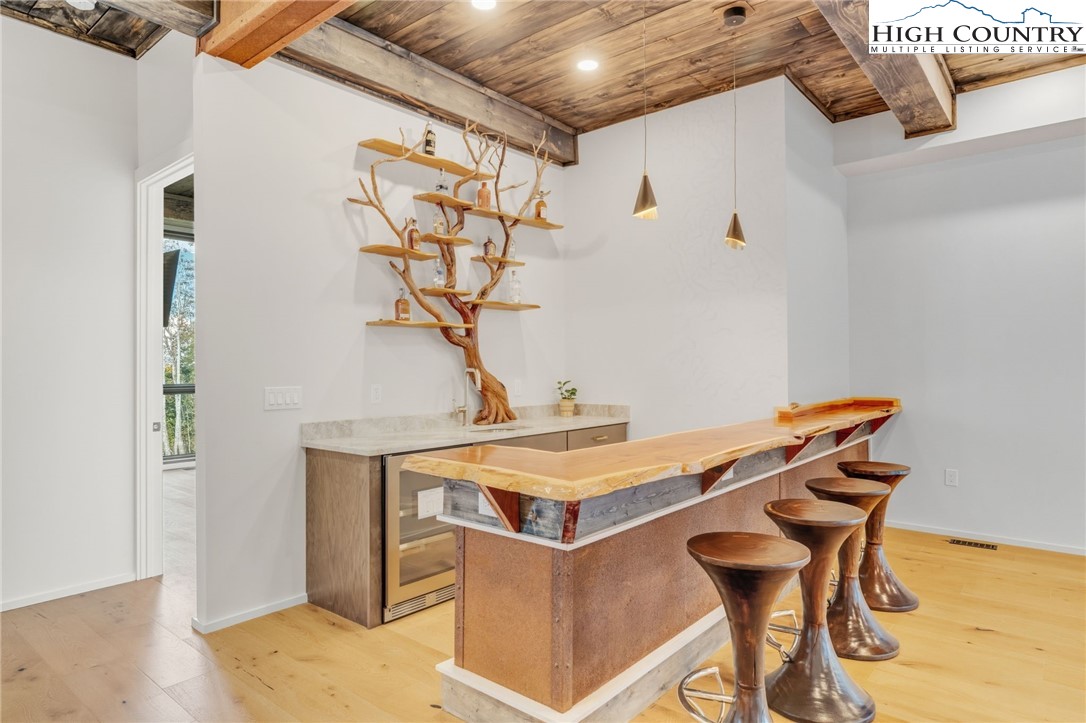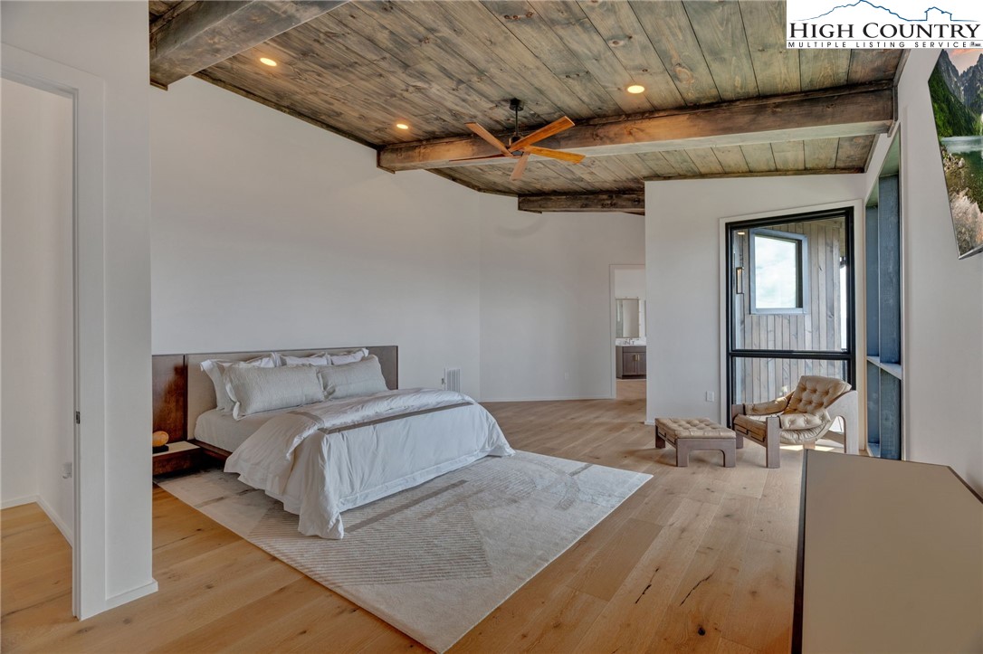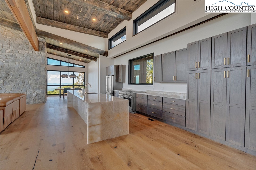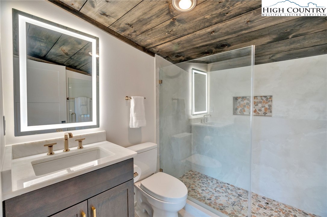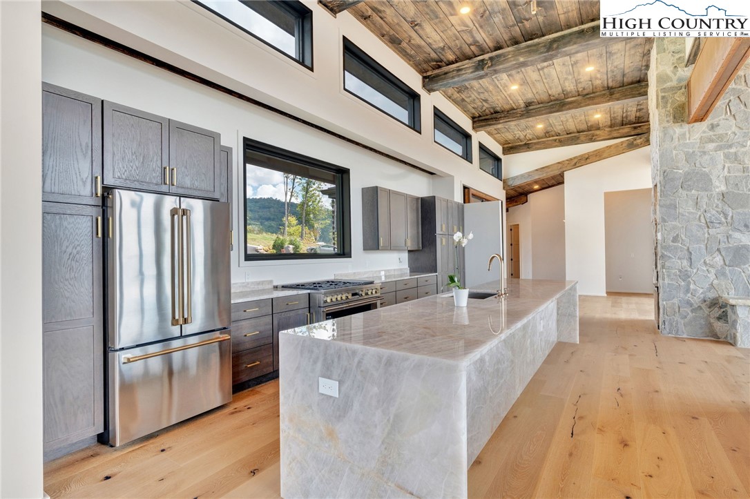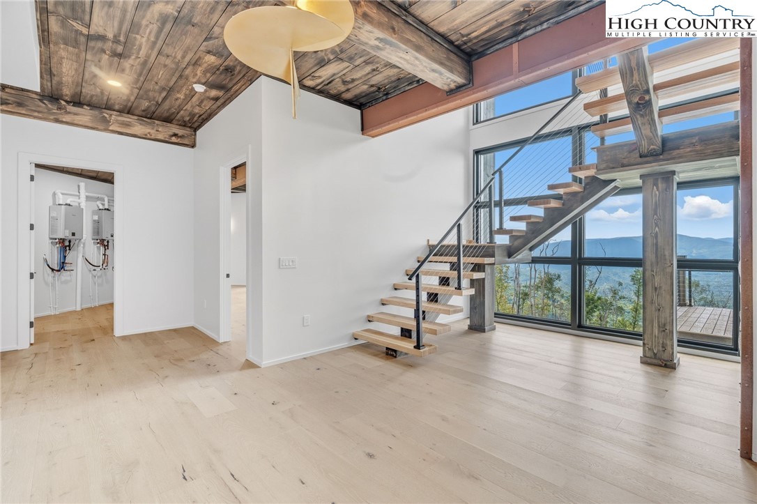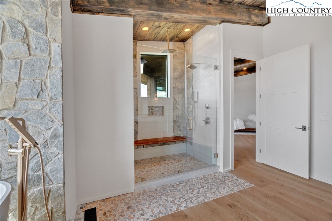 Located in the coveted Sunset Section of The Lodges at Eagles Nest, the Eagles Nest Glass House is an exceptional custom estate redefining mountain living through masterful design and craftsmanship. Developed over three years, this architectural showcase occupies 1.033 acres, where rugged natural beauty blends seamlessly with refined elegance. The residence offers 7,055 sq ft of heated living space, excluding the three-car garage. Perched at 4,400 feet elevation, it commands panoramic views spanning North Carolina to Tennessee mountains, framed by awe-inspiring sunsets. The exterior presents a stylish mountain retreat with white pine-stained wood siding, expansive windows, and rustic metal beams. Over $250,000 was invested in professional landscaping, featuring natural boulders, enhanced lighting, and intricate hardscaping that create an impressive arrival experience. Outdoor living shines with 860+ sq ft of decking, a large hot tub, hand-laid stone pillars, and custom steel beams designed to highlight the sweeping vistas. An inviting fire pit promises memorable evenings beneath the stars. Entry by a grand custom glass door reveals a great room with soaring two-story glass walls that flood the interior with natural light while framing the stunning surroundings. Nickel gap white pine-stained ceilings with rustic beams combine rustic warmth and modern elegance, accented by hand-laid rock, light-toned floors, and a custom rusted gas fireplace. The gourmet kitchen impresses with Onyx Waterfall Island countertops, stainless steel appliances, and a wine cooler. The lower level houses a large custom bar, wine cellar, and a flexible bonus room suited for theater, family gatherings, or games. Throughout are handmade floating handmade stairs, custom wood ceilings, stone accents, custom glass windows, and exterior stonework. There are five spacious bedrooms, each with meticulously finished bathrooms featuring hand-laid stone, marble, various tiles, and teakwood benches. Two additional half-baths are located on each floor. Two generous primary suites, one on the main level and one on the lower level, feature spa-inspired bathrooms and conveniently located adjacent utility rooms. Above the garage, featuring hand painted bronze epoxy floors, lies a distinctive bunk room with a full bath and an expansive rec room. Roughly half of this 275 sq ft area features ceiling heights between 5 and 7 feet. The home is enhanced by commissioned artwork and custom furnishings throughout, reinforcing its one-of-a-kind character. Residents enjoy an extensive amenity offering including ATV and hiking trails, ropes course, playground, dog park, mini-golf, disc golf, archery, versatile sports fields, and courts for volleyball, basketball, tennis, and pickleball. Enjoy world class trout fishing along the Elk River with over 2000 ft of river frontage. Dining options include Eagles Nest Winery, Epic Chophouse and The Sportsman’s Grille. Additional amenities include a 24-hour Dollar General, an outdoor amphitheater offering live entertainment on Saturday evenings from May through October, fitness center, and two helicopter pads. This estate transcends standard mountain homes by flawlessly combining luxury, nature, and architectural brilliance, inviting an elevated mountain lifestyle. Adjacent to this property, a 4,959 sq ft neighboring estate (MLS #258350) is also available, presenting a rare opportunity for main and guest house combination. 4 year home warranty provided