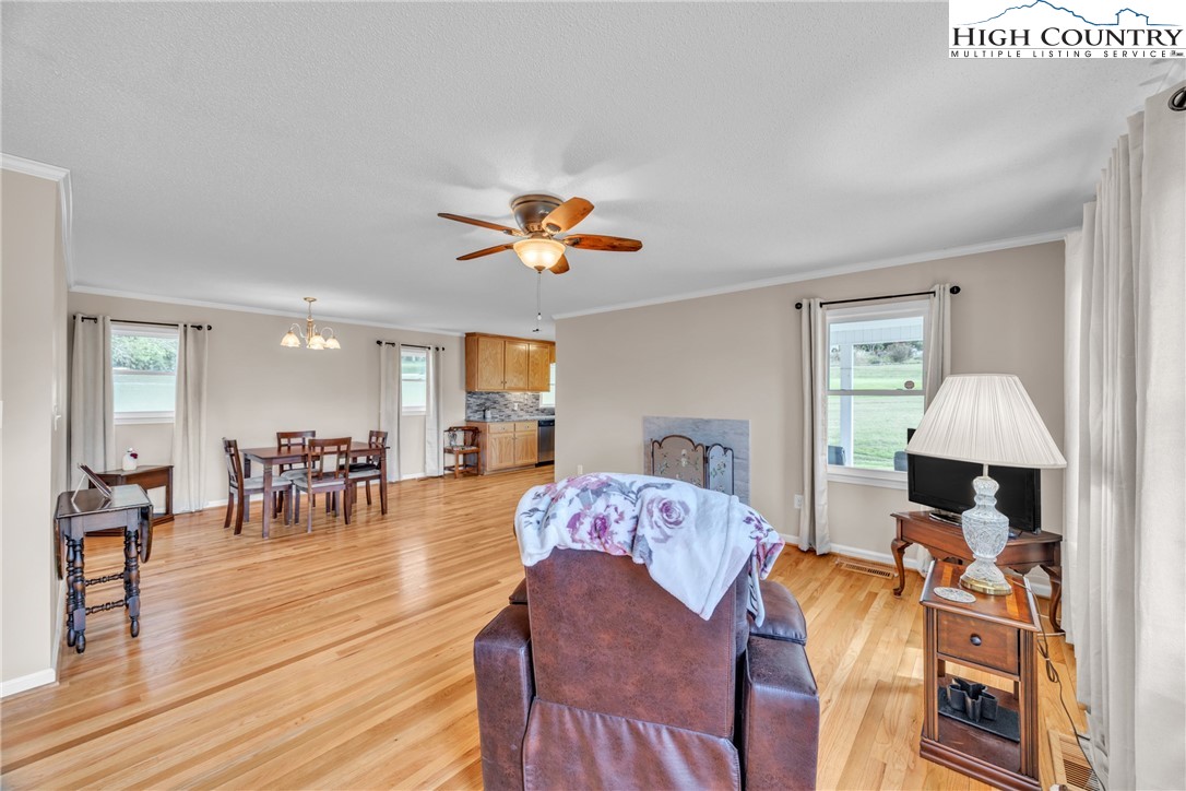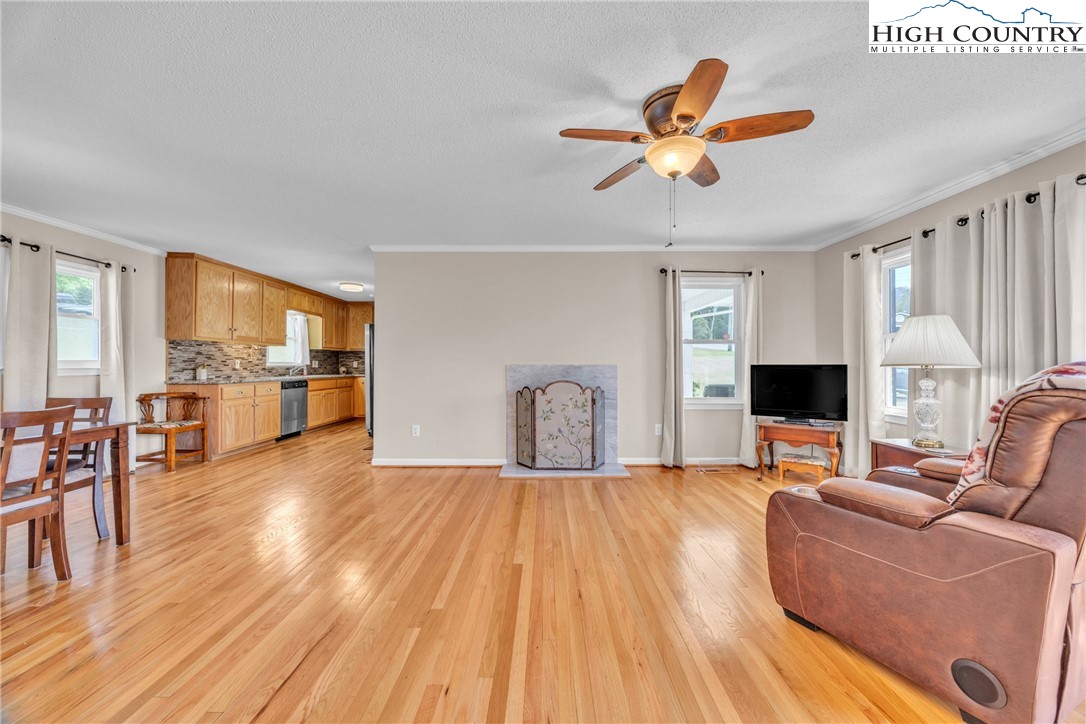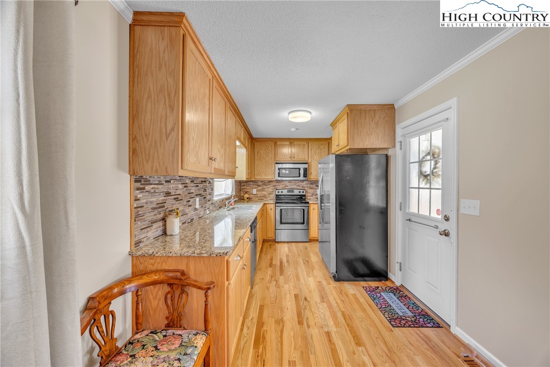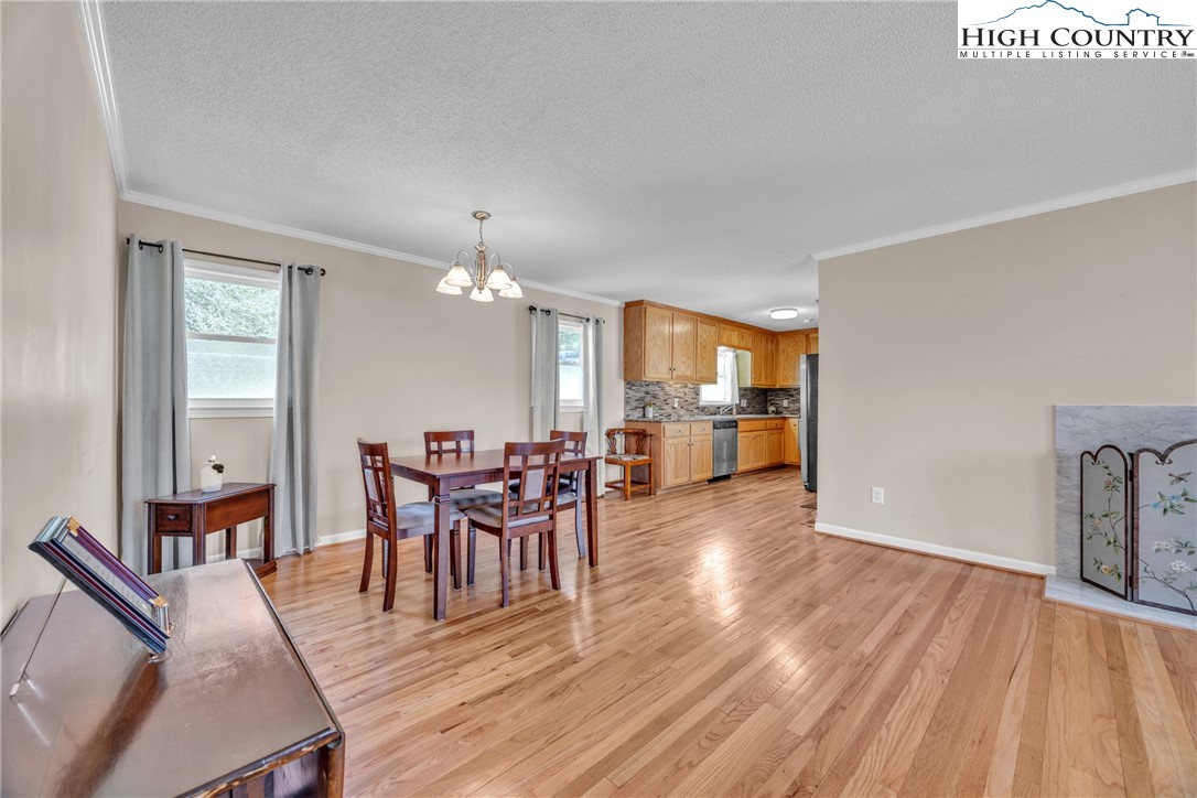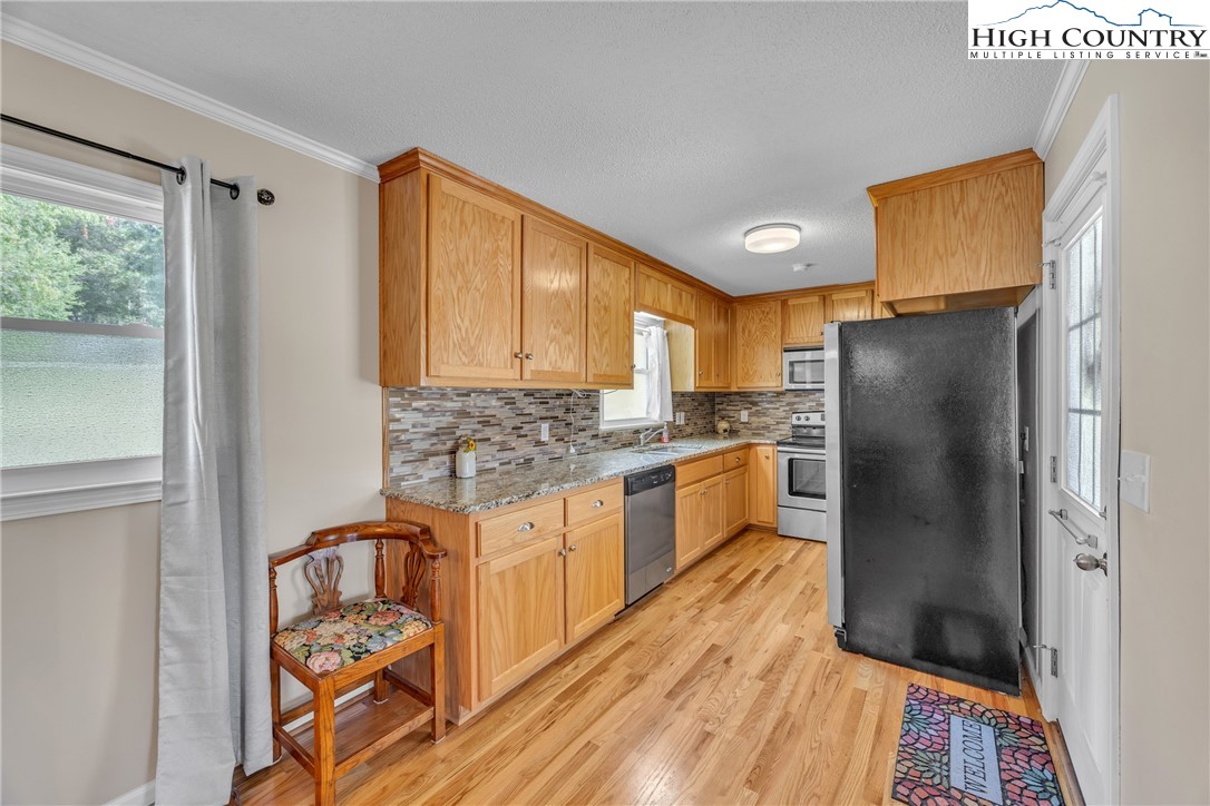 Conveniently located inside city limits while offering a peaceful country-like setting. Meticulously maintained and movein-ready, 3-bed 1-bath brick ranch home. Step inside to find beautiful hardwood floors, neutral paint colors, & modern fixtures. The kitchen, boasts custom cabinets, a gorgeous tile backsplash, sleek granite countertops, and all stainless steel appliances, and flows seamlessly into the bright, open-concept living and dining area featuring a cozy woodburning fireplace - great for chilly evenings and everyday comfort. The full basement offers additional washer and dryer hookups and plenty of storage or workshop potential. Recent updates include new window replacements and a metal roof installed in 2022. Spacious outdoor area with a storage building and nice concrete double driveway. Enjoy the convenience of city water and sewer in a peaceful neighborhood setting. This one will not last long so schedule your showing today.