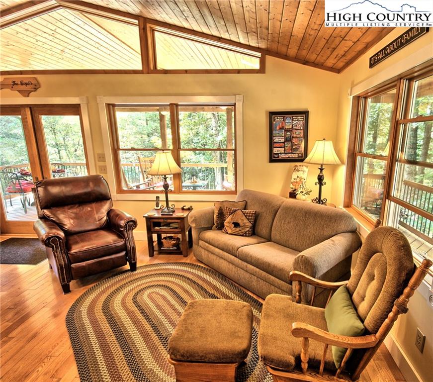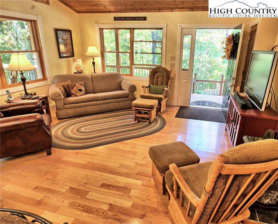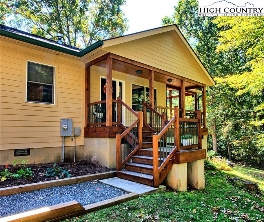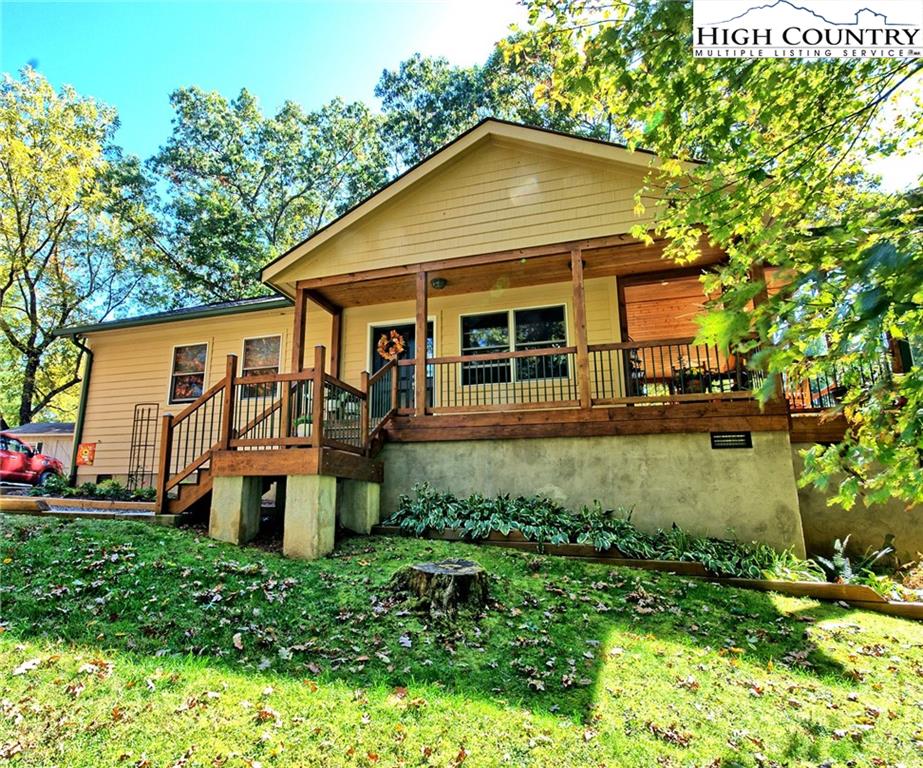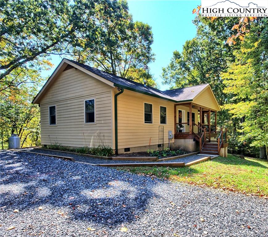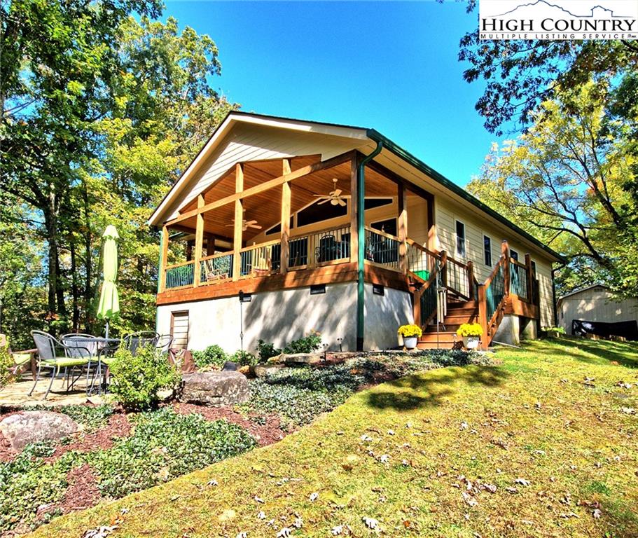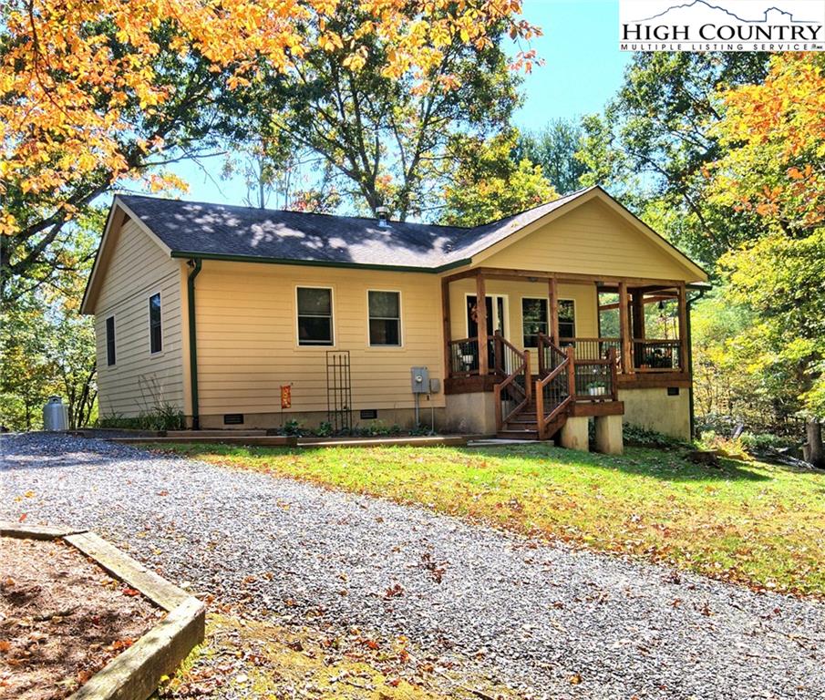 Within walking distance of the river !! 5 plus acres with this secluded home close to the North Fork New River. Cozy fully furnished just move right in! Numerous walking paths and 4-wheeling paths throughout the property. Picture perfect inside and out with lots of outdoor living space. All one level living with vaulted ceilings make this home seem very spacious. Lots of outdoor living space with a vaulted open covered deck and large stone patio perfect for those cool nights with a cozy firepit. Spacious workshop/ outbuilding wired for electricity. Circle drive so easy to get around with plenty of driveway parking also. Private well and septic 3 bedroom septic approved if buyer wanted to add on. Call today to preview !!