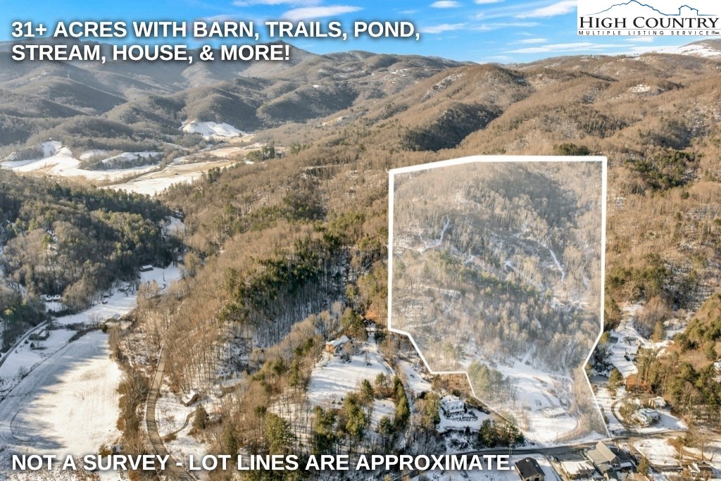 Valle Farm: a rare offering of 31+ acres with an extensive trail system, barn, and existing home in the heart of Valle Crucis! Located directly across the road from the Original Mast General Store, and with wooded acreage, usable yards, and long-range, layered Blue Ridge Mountain views at high elevations, this tract offers the potential for many different uses. Offering easy access year-round on state-maintained roads, this is the perfect place for a homestead, family estate/legacy property, horse property, or investment opportunity with potential for development or commercial use. The wooded acreage is easily accessible over an extensive trail system and offers a small pond, stream frontage, and good potential homesites with long-range views. A large barn on the property offers multiple stalls, storage rooms, a full bathroom, and a large storage loft, and is adjacent to an additional shed outbuilding, offering ample storage space. The existing home offers two bedrooms and one bath, a stone fireplace, and a front porch overlooking pastoral Valle Crucis. With serenity and mountain views year-round, this is the perfect place to enjoy all the High Country has to offer! Property is also being offered as 29+ acres, excluding the barn, house, and NC Highway 194 S frontage.