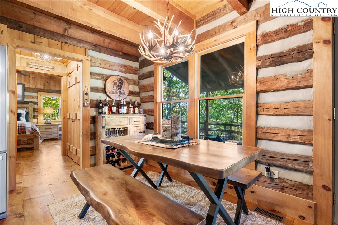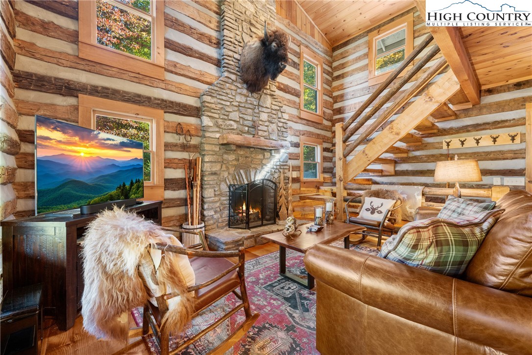 Exquisite Custom Log Home in the Prestigious Stonebridge Subdivision Discover timeless mountain elegance in this extraordinary custom log retreat, perfectly nestled within the highly sought-after Stonebridge community. Surrounded by serene natural beauty and framed by breathtaking long-range mountain vistas, this home offers the ultimate blend of craftsmanship, comfort, and sophistication. Step outside onto the freshly stained wraparound upper deck, where panoramic views stretch across the Blue Ridge horizon. A second covered lower-level deck provides an inviting space to relax, entertain, or simply savor the peaceful mountain setting. Inside, the great room welcomes you with soaring cathedral ceilings and floor to ceiling native stone fireplace, designed for gas burning. The kitchen features an oversized island with seating, new appliances, and a gas range, seamlessly connecting to an inviting dining area perfect for hosting unforgettable gatherings. The main floor master has double doors that offer fabulous views and lead out to the deck. Custom hand-hewn log stairs lead to a spacious loft, bathed in natural light, along with a beautifully appointed guest bedroom and bath. The lower level provides a versatile family room and another full bath, another bedroom and stone gas fireplace ideal for guests or extended family. Meticulous details enhance this home’s enduring quality, including a brand new divinci shake roof, tankless water heater, encapsulated crawl space with dehumidifier, radon gas filtration system, and a newly constructed retaining wall. The property is surrounded by seasonal landscaping, creating a picturesque setting year-round. This remarkable mountain sanctuary captures the essence of luxury mountain living—where impeccable design meets natural beauty in perfect harmony. A true mountain dream come true.