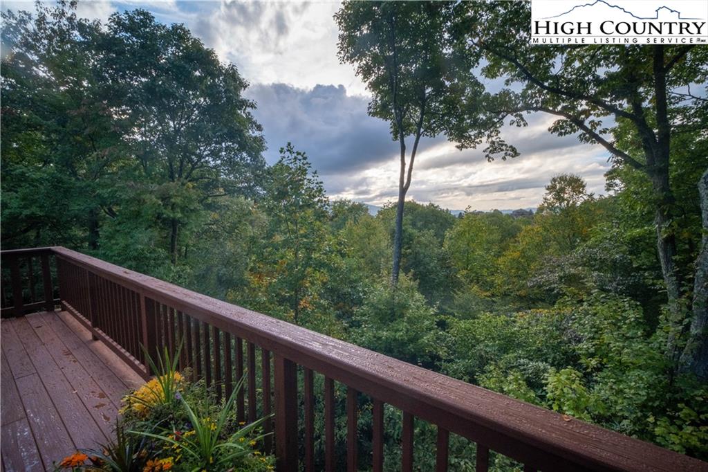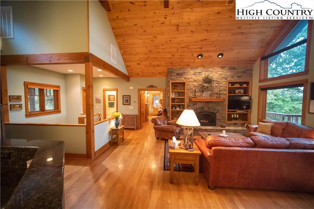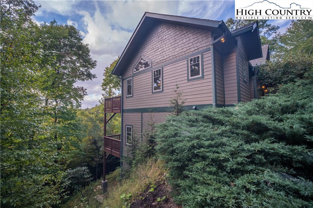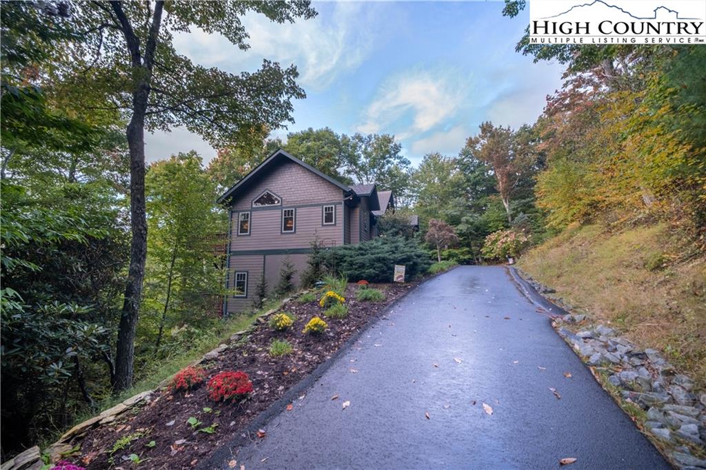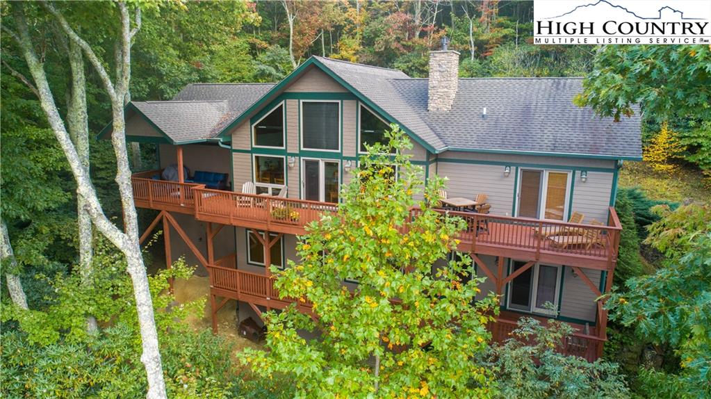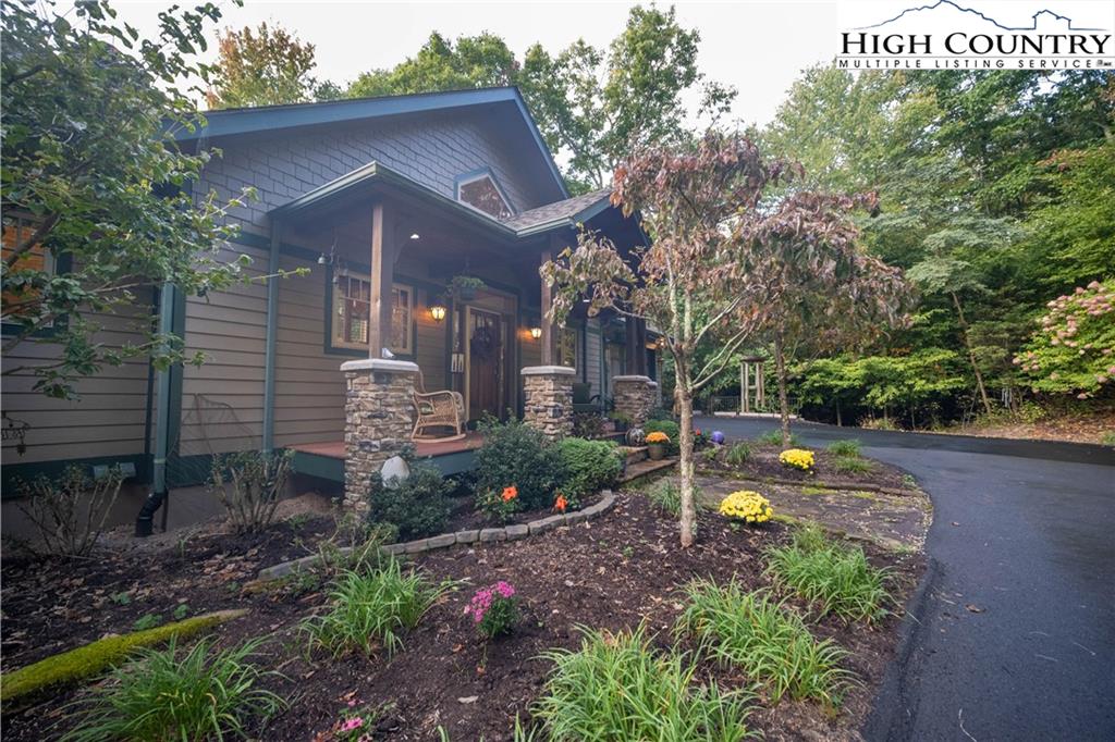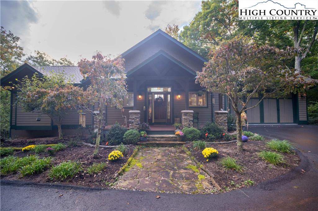Gorgeous mountain style home tucked in the trees with a beautiful long range view! This 3 bedroom home, each with an en-suite bath, has timber frame style details, vaulted tongue and grove ceilings, and upscale finishings. One level living is possible with kitchen, great room, dining, primary bedroom and laundry all on the main floor. Kitchen has granite counters, light cherry cabinets, stainless appliances, and a gas range for the chef. Floor to ceiling stone fire place and built in shelving highlight the living room with a wall of windows to take in the view. Multiple decks extend your living space, and all are newly stained. Two living spaces with an additional laundry downstairs allows room for everyone! The two car garage is on grade with entrance into the kitchen. Beautiful yet easy landscaping with nothing to mow! Easy to care for exterior has been recently painted. The doors have vanishing screens and great room windows have motorized shades. Tons of storage! Gated community and only 5 minutes to Boone!
