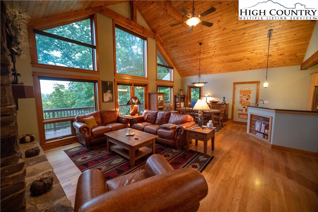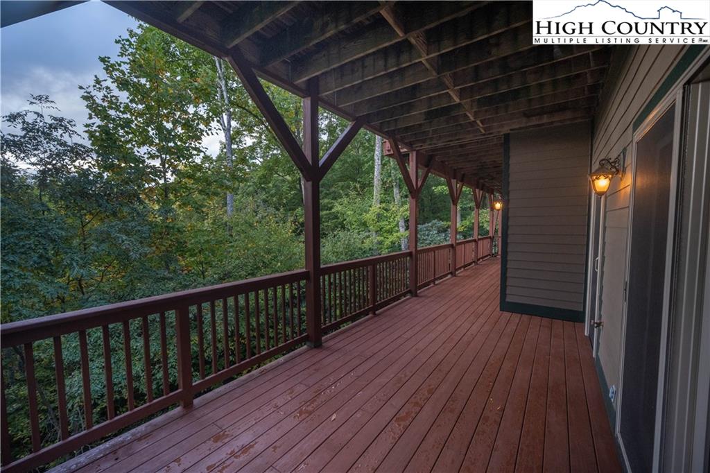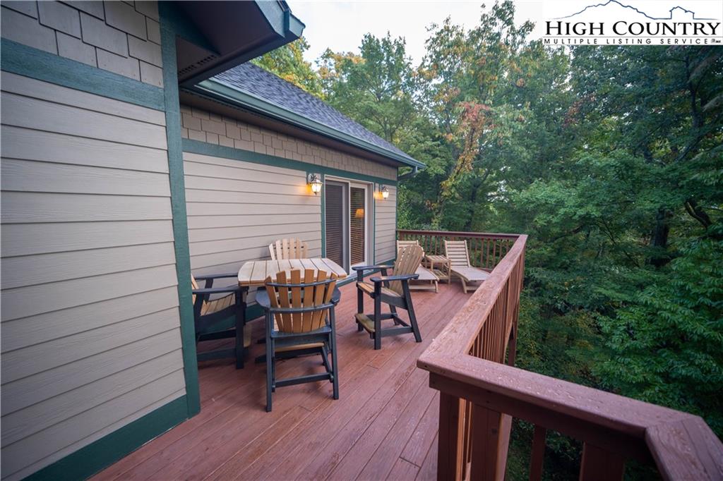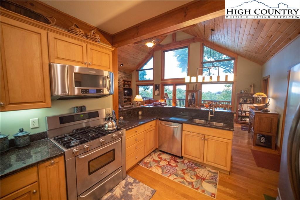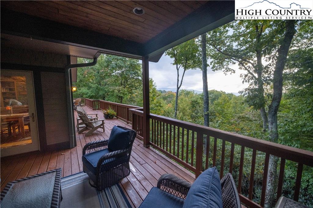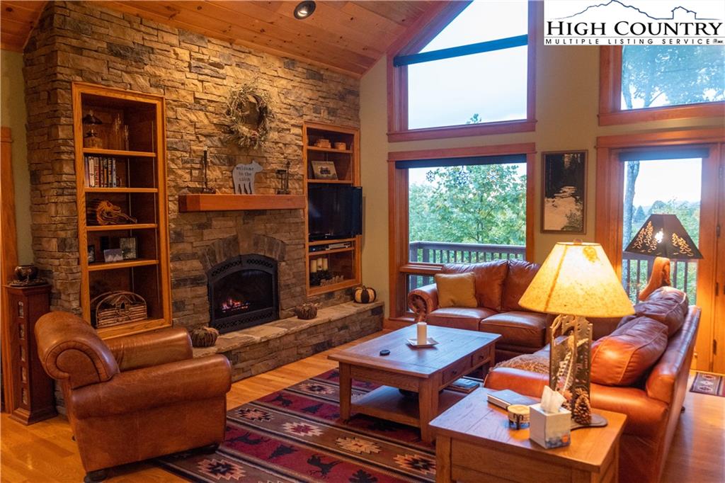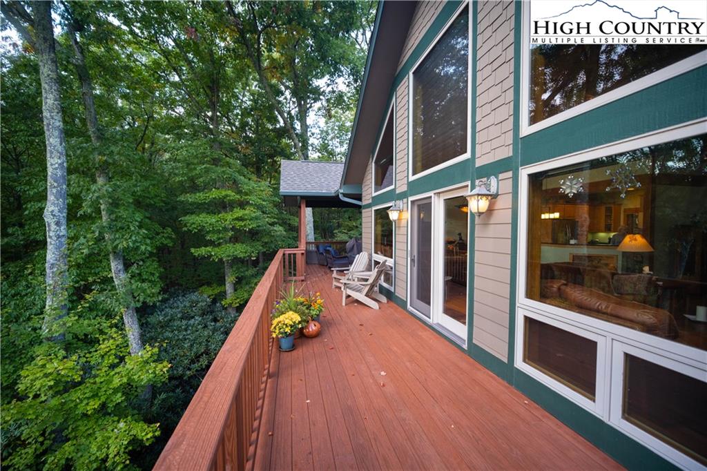 Gorgeous mountain style home tucked in the trees with a beautiful long range view! This 3 bedroom home, each with an en-suite bath, has timber frame style details, vaulted tongue and grove ceilings, and upscale finishings. One level living is possible with kitchen, great room, dining, primary bedroom and laundry all on the main floor. Kitchen has granite counters, light cherry cabinets, stainless appliances, and a gas range for the chef. Floor to ceiling stone fire place and built in shelving highlight the living room with a wall of windows to take in the view. Multiple decks extend your living space, and all are newly stained. Two living spaces with an additional laundry downstairs allows room for everyone! The two car garage is on grade with entrance into the kitchen. Beautiful yet easy landscaping with nothing to mow! Easy to care for exterior has been recently painted. The doors have vanishing screens and great room windows have motorized shades. Tons of storage! Gated community and only 5 minutes to Boone!