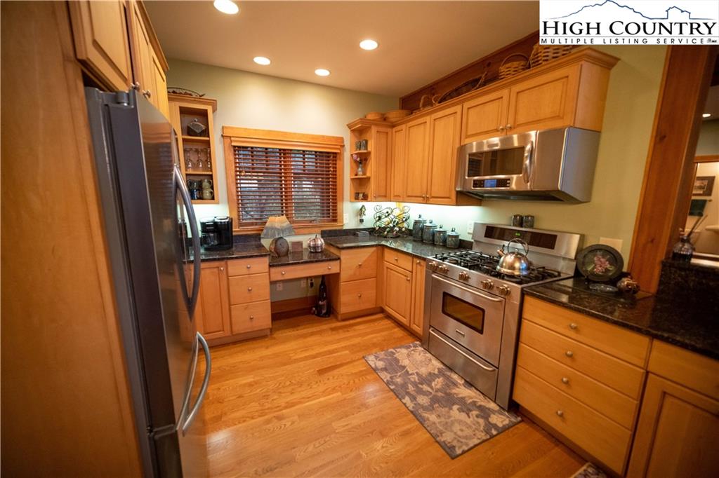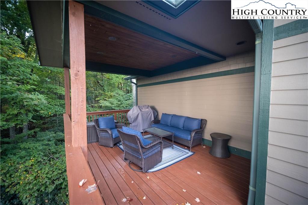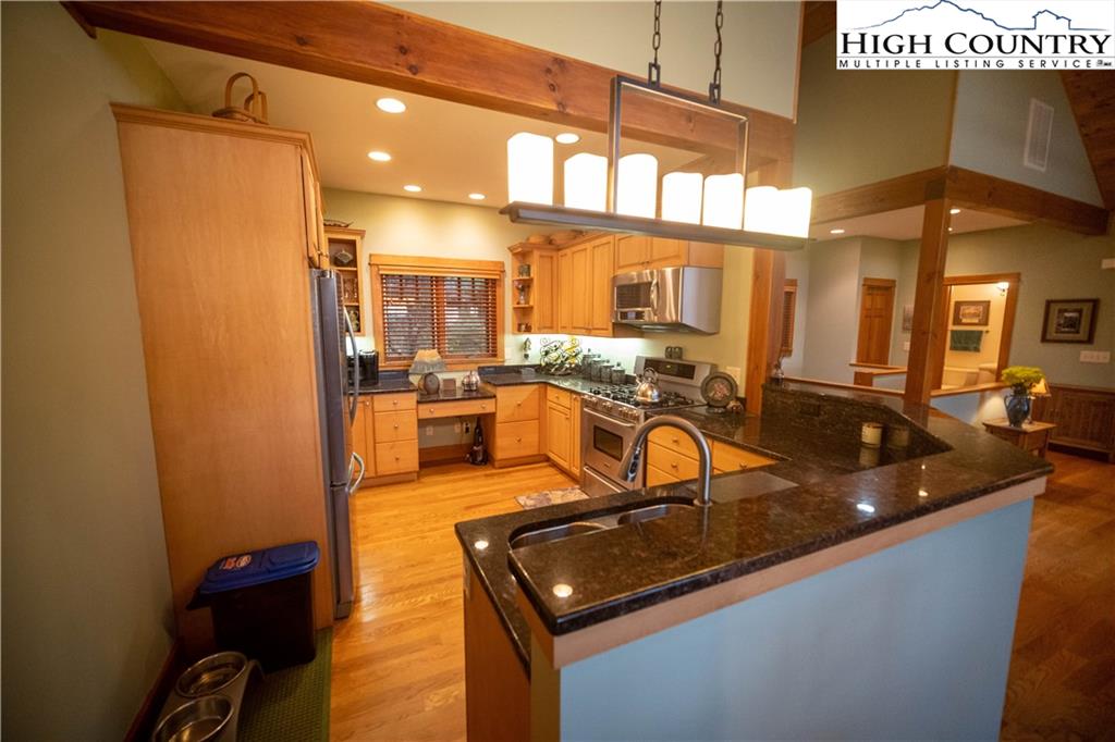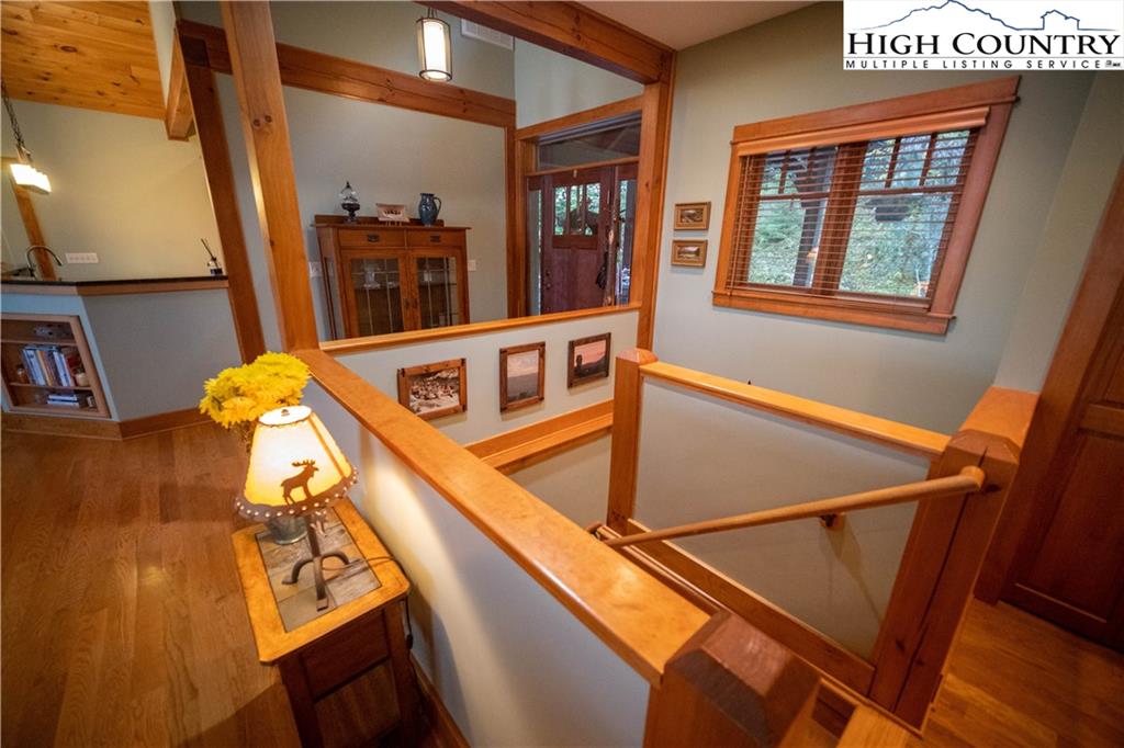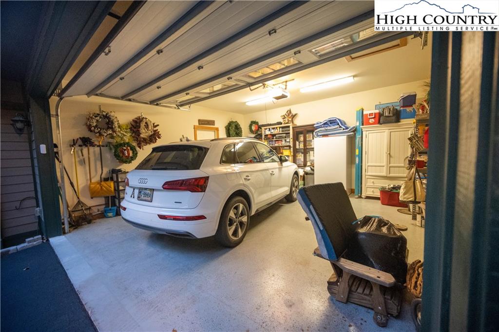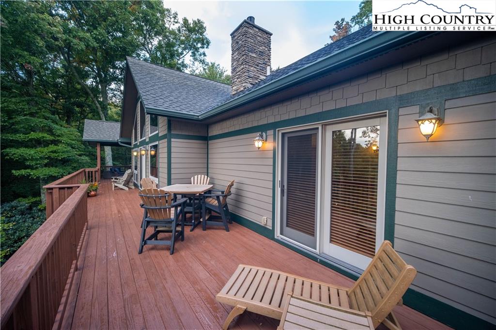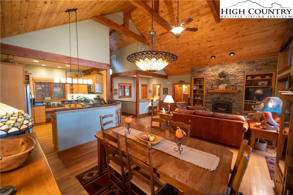 Gorgeous mountain style home tucked in the trees with a beautiful long range view! This 3 bedroom home, each with an en-suite bath, has timber frame style details, vaulted tongue and grove ceilings, and upscale finishings. One level living is possible with kitchen, great room, dining, primary bedroom and laundry all on the main floor. Kitchen has granite counters, light cherry cabinets, stainless appliances, and a gas range for the chef. Floor to ceiling stone fire place and built in shelving highlight the living room with a wall of windows to take in the view. Multiple decks extend your living space, and all are newly stained. Two living spaces with an additional laundry downstairs allows room for everyone! The two car garage is on grade with entrance into the kitchen. Beautiful yet easy landscaping with nothing to mow! Easy to care for exterior has been recently painted. The doors have vanishing screens and great room windows have motorized shades. Tons of storage! Gated community and only 5 minutes to Boone!