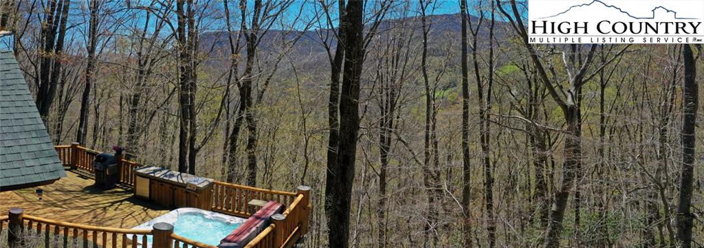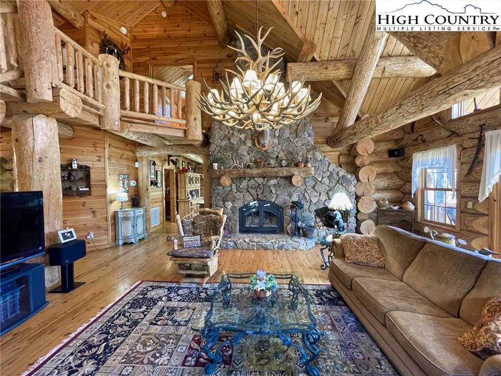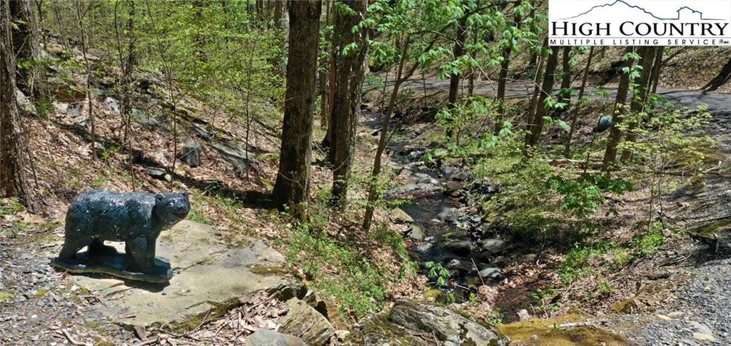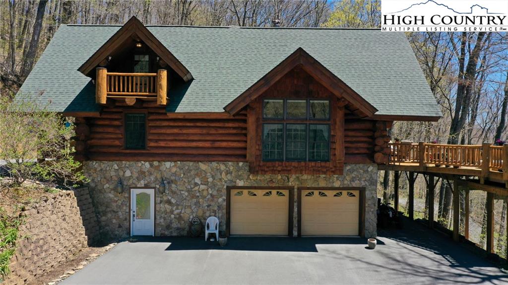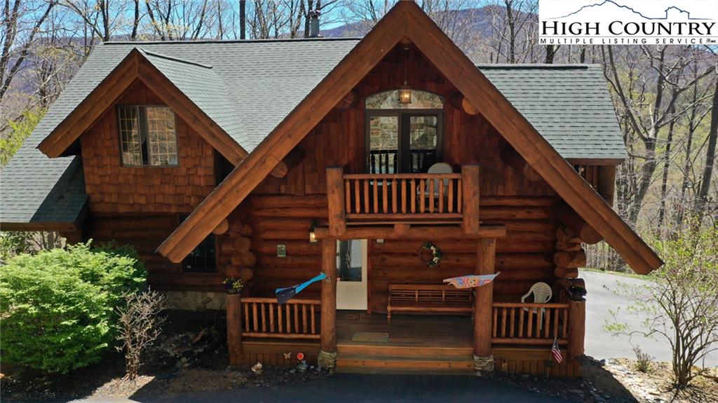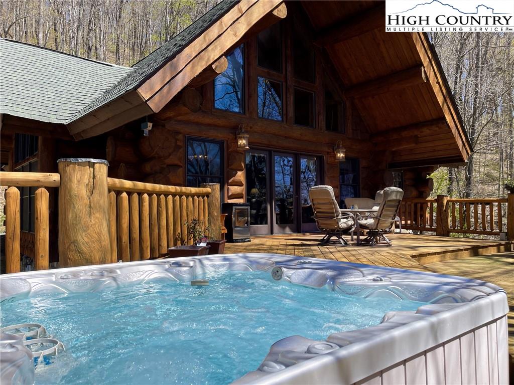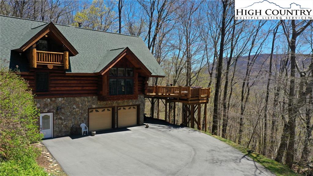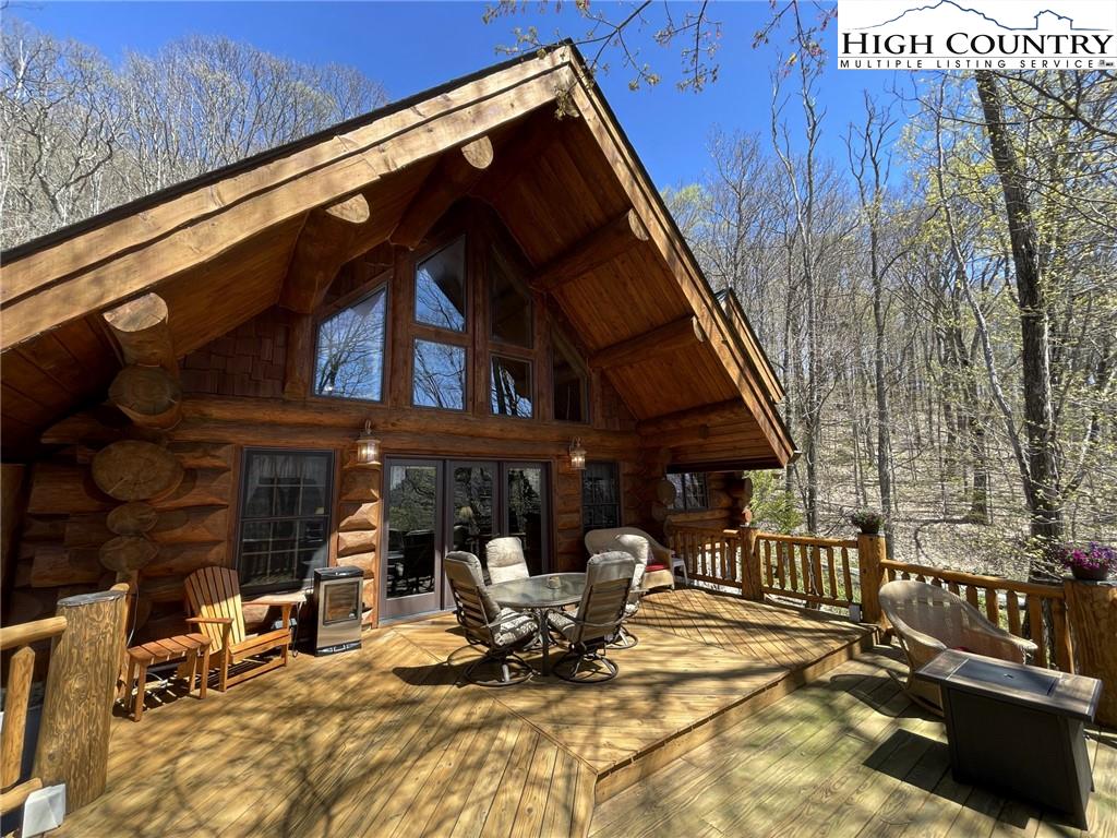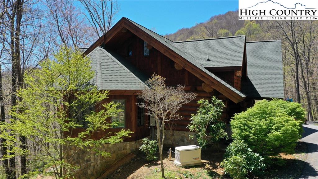 PARADISE FOUND. Just 8 miles out of West Jefferson, this majestic Colorado style log home sits on 12.25 acres bordering 4000 acres of NC state forestry land and provides a very tranquil oasis. This desirable property abounds with trees, wildlife, mountain views and a bold stream, hosting several small waterfalls. There are numerous hiking/ATV trails throughout the property. There is 3-Bedroom septic Permit but a room in the basement is currently being used as a 4th bedroom. This gorgeous home features vaulted beamed ceilings with a soaring two story fireplace, heated tile floors in the kitchen and two of the bathrooms,Cedar closets, alarm system, 7 person hot tub and an outdoor kitchen with expansive deck For entertaining. The home has been wired for integrated TV, stereo and computer. Sellers have made major improvements to this home since they purchased it in 2017. They have paved the scenic driveway to the home, installed a whole house Generator, had logs caulked and stained inside and out, installed radon mitigation system, reinforced deck for hot tub weight, rewired electrical box and so much more. This property is Being offered FURNISHED with few exceptions.