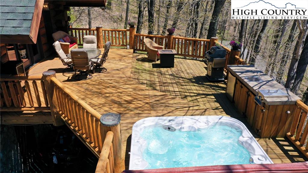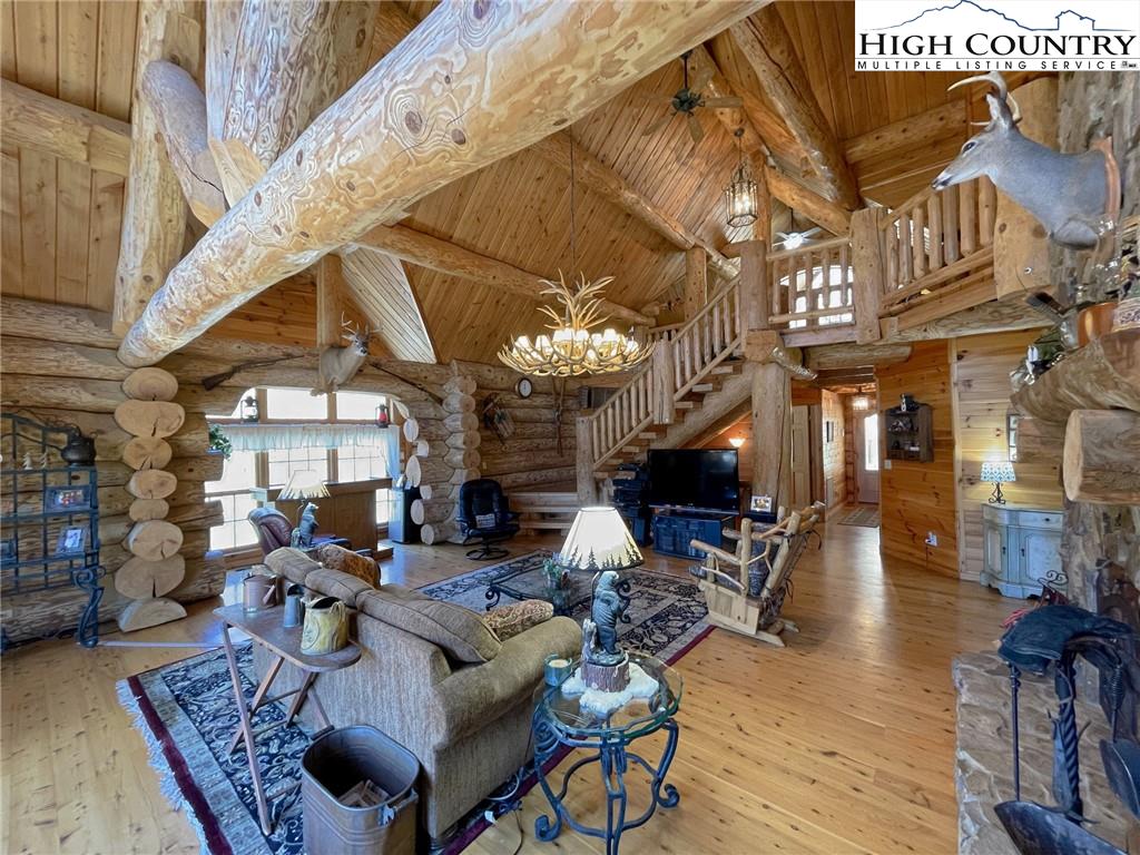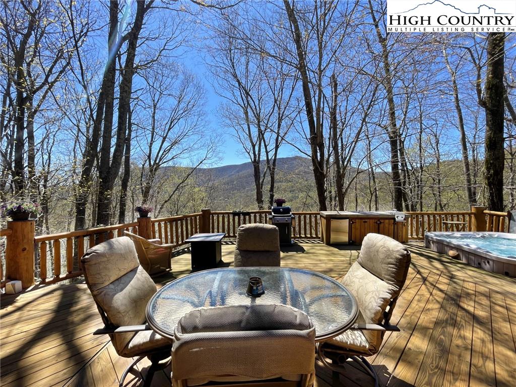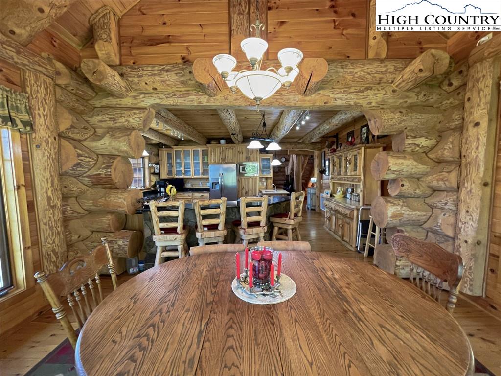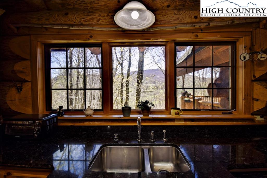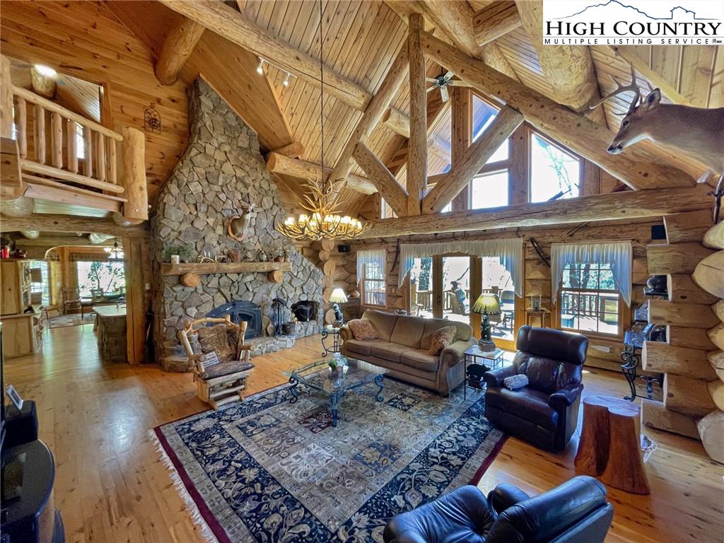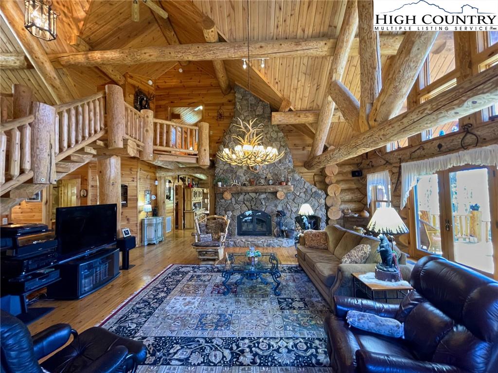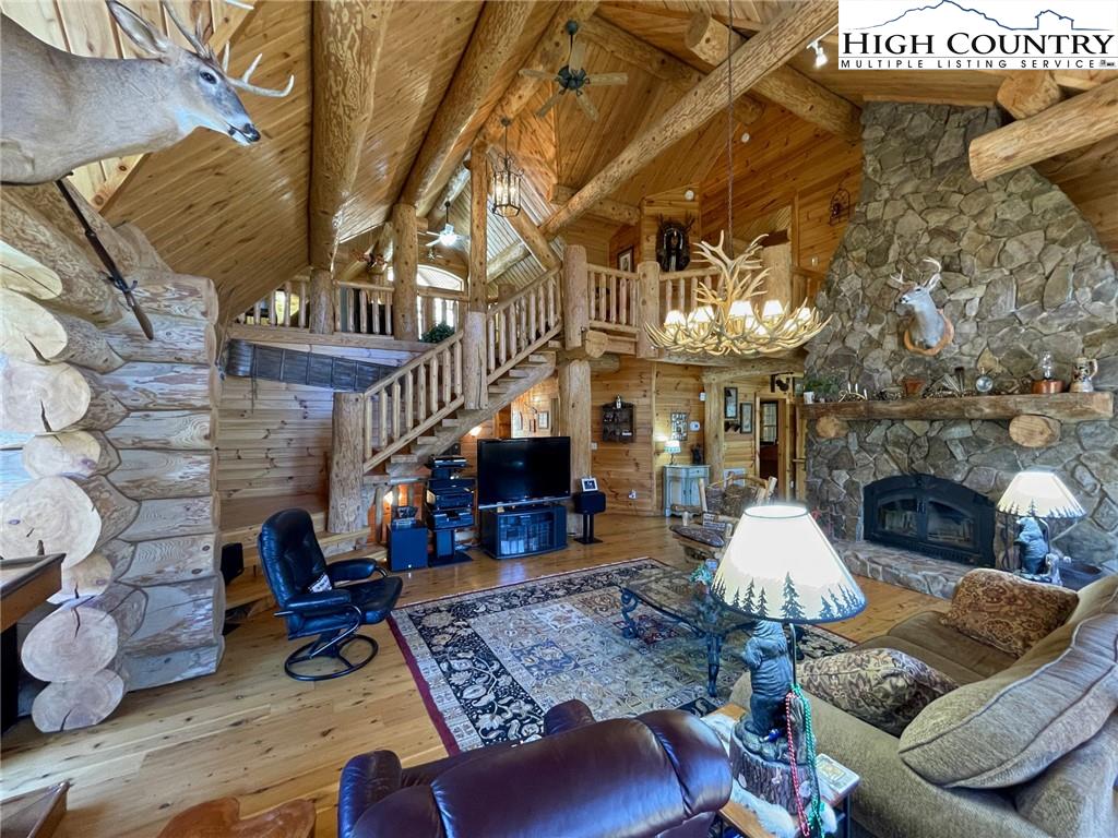 PARADISE FOUND. Just 8 miles out of West Jefferson, this majestic Colorado style log home sits on 12.25 acres bordering 4000 acres of NC state forestry land and provides a very tranquil oasis. This desirable property abounds with trees, wildlife, mountain views and a bold stream, hosting several small waterfalls. There are numerous hiking/ATV trails throughout the property. There is 3-Bedroom septic Permit but a room in the basement is currently being used as a 4th bedroom. This gorgeous home features vaulted beamed ceilings with a soaring two story fireplace, heated tile floors in the kitchen and two of the bathrooms,Cedar closets, alarm system, 7 person hot tub and an outdoor kitchen with expansive deck For entertaining. The home has been wired for integrated TV, stereo and computer. Sellers have made major improvements to this home since they purchased it in 2017. They have paved the scenic driveway to the home, installed a whole house Generator, had logs caulked and stained inside and out, installed radon mitigation system, reinforced deck for hot tub weight, rewired electrical box and so much more. This property is Being offered FURNISHED with few exceptions.
