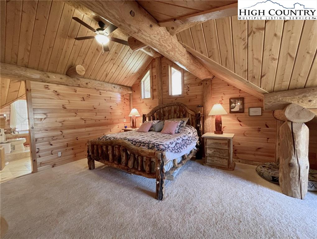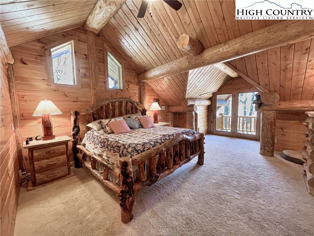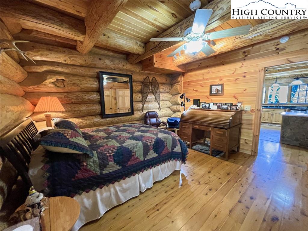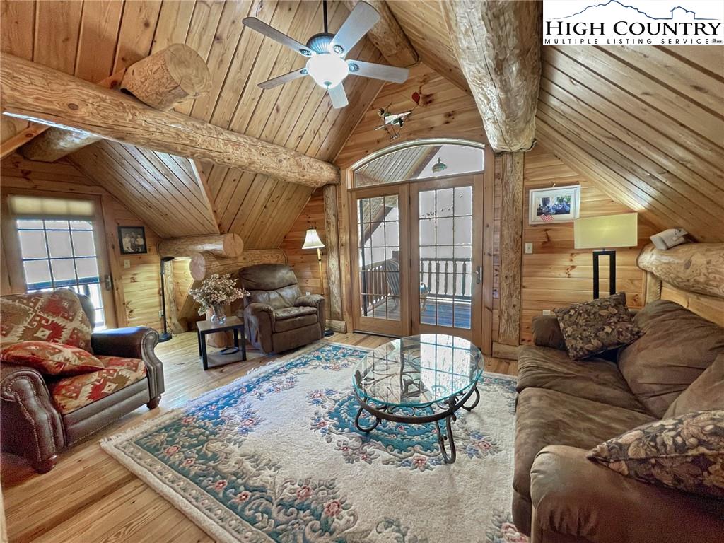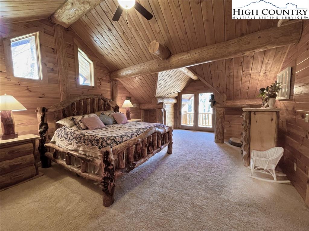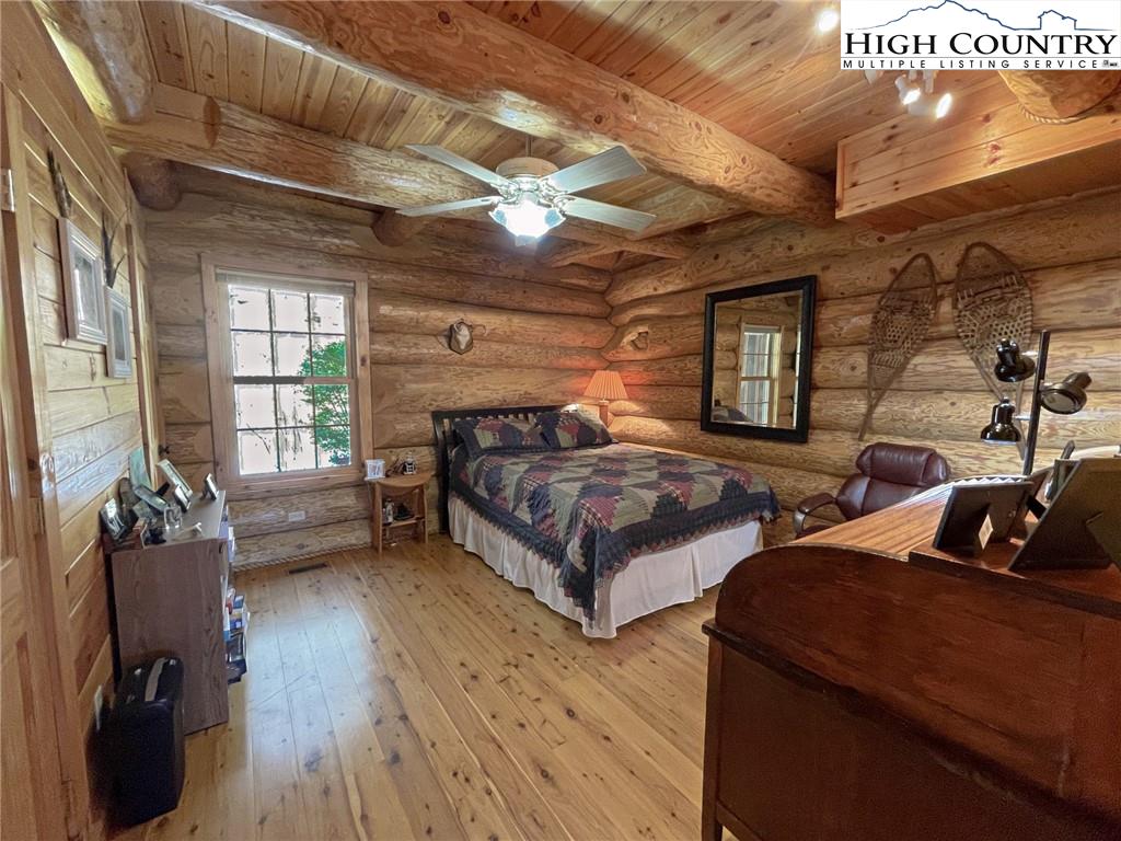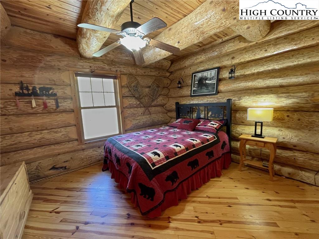 PARADISE FOUND. Just 8 miles out of West Jefferson, this majestic Colorado style log home sits on 12.25 acres bordering 4000 acres of NC state forestry land and provides a very tranquil oasis. This desirable property abounds with trees, wildlife, mountain views and a bold stream, hosting several small waterfalls. There are numerous hiking/ATV trails throughout the property. There is 3-Bedroom septic Permit but a room in the basement is currently being used as a 4th bedroom. This gorgeous home features vaulted beamed ceilings with a soaring two story fireplace, heated tile floors in the kitchen and two of the bathrooms,Cedar closets, alarm system, 7 person hot tub and an outdoor kitchen with expansive deck For entertaining. The home has been wired for integrated TV, stereo and computer. Sellers have made major improvements to this home since they purchased it in 2017. They have paved the scenic driveway to the home, installed a whole house Generator, had logs caulked and stained inside and out, installed radon mitigation system, reinforced deck for hot tub weight, rewired electrical box and so much more. This property is Being offered FURNISHED with few exceptions.