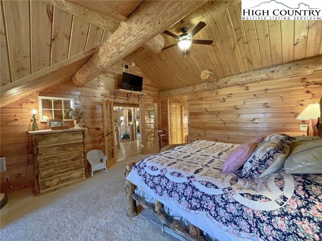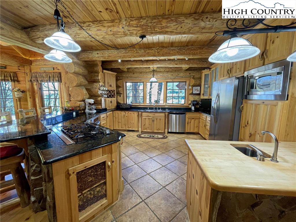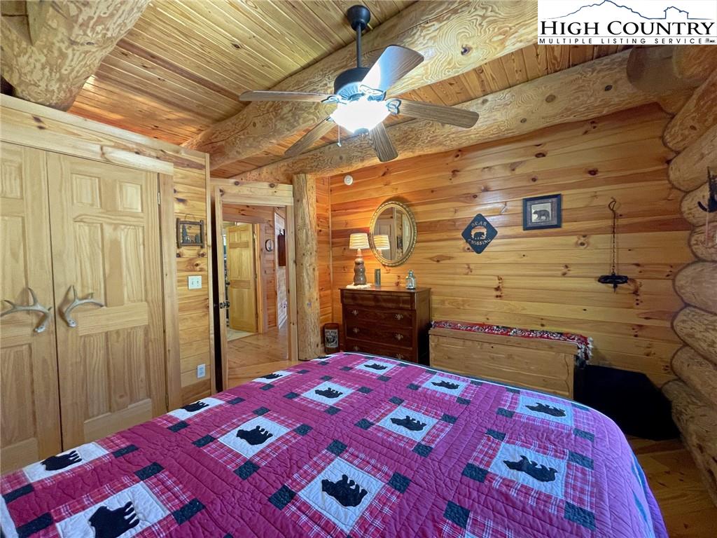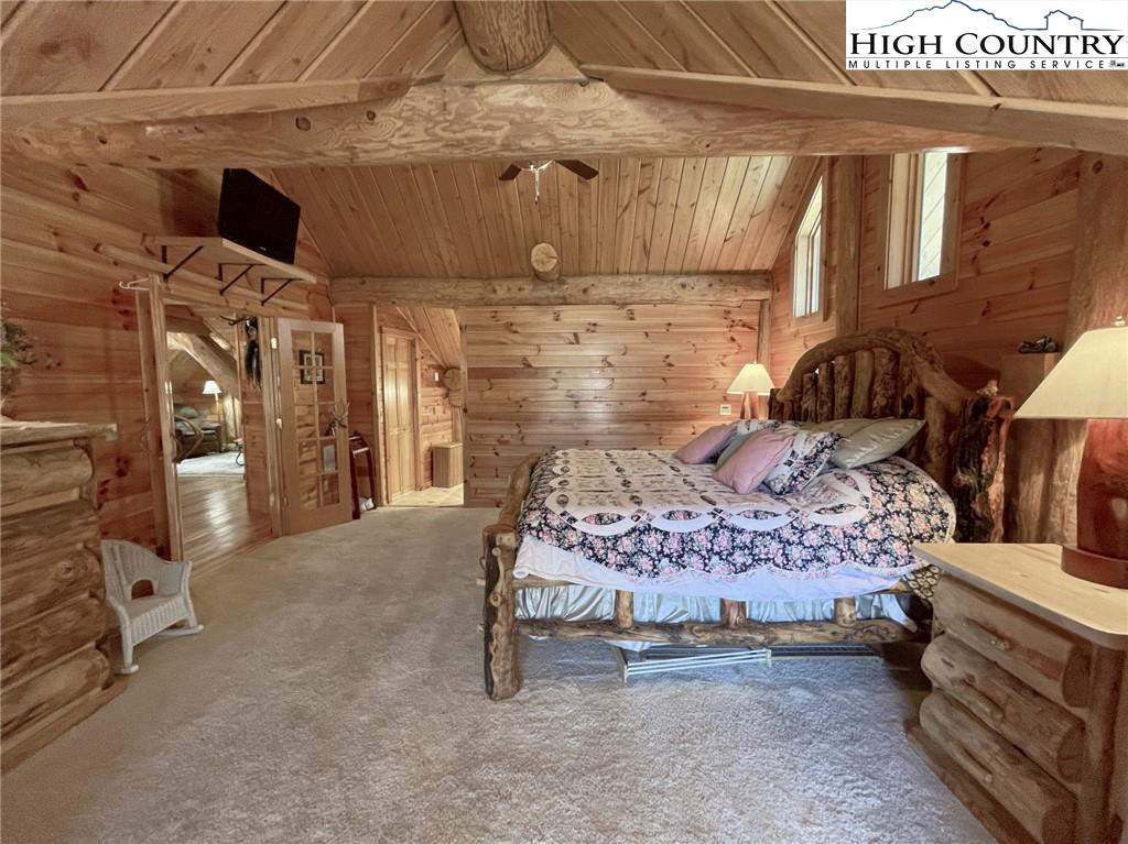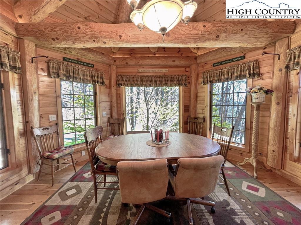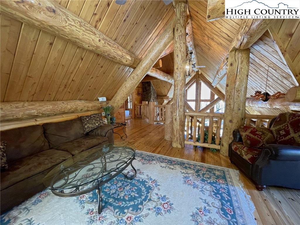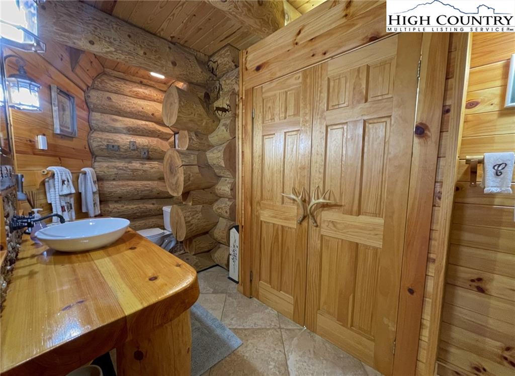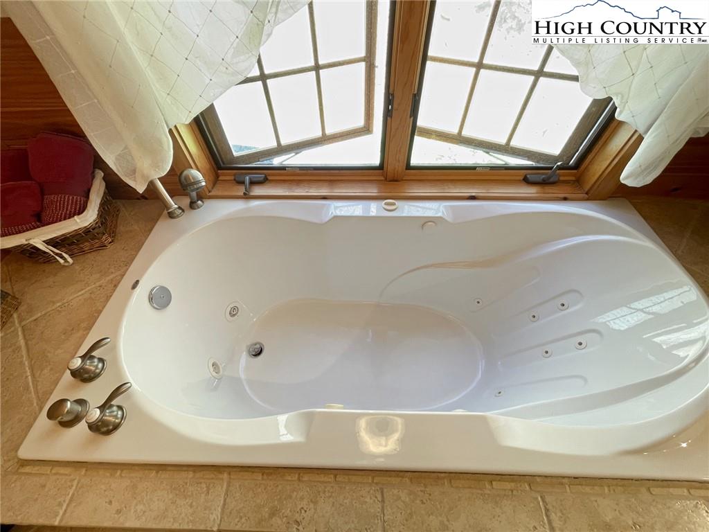 PARADISE FOUND. Just 8 miles out of West Jefferson, this majestic Colorado style log home sits on 12.25 acres bordering 4000 acres of NC state forestry land and provides a very tranquil oasis. This desirable property abounds with trees, wildlife, mountain views and a bold stream, hosting several small waterfalls. There are numerous hiking/ATV trails throughout the property. There is 3-Bedroom septic Permit but a room in the basement is currently being used as a 4th bedroom. This gorgeous home features vaulted beamed ceilings with a soaring two story fireplace, heated tile floors in the kitchen and two of the bathrooms,Cedar closets, alarm system, 7 person hot tub and an outdoor kitchen with expansive deck For entertaining. The home has been wired for integrated TV, stereo and computer. Sellers have made major improvements to this home since they purchased it in 2017. They have paved the scenic driveway to the home, installed a whole house Generator, had logs caulked and stained inside and out, installed radon mitigation system, reinforced deck for hot tub weight, rewired electrical box and so much more. This property is Being offered FURNISHED with few exceptions.