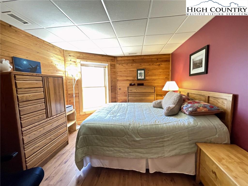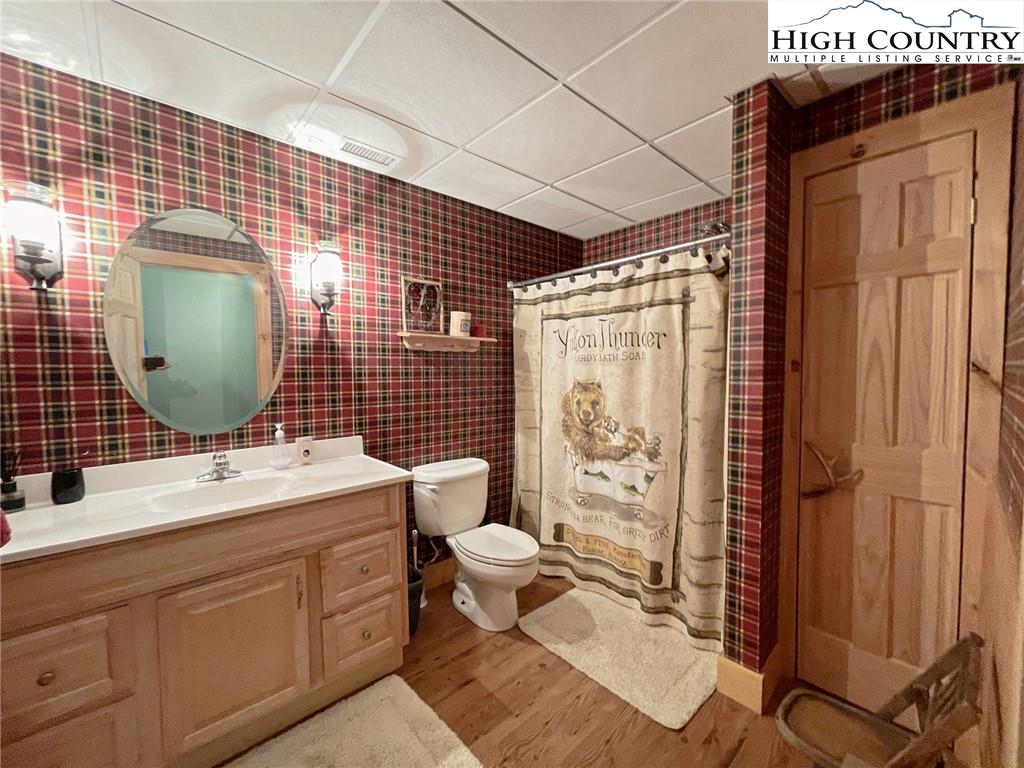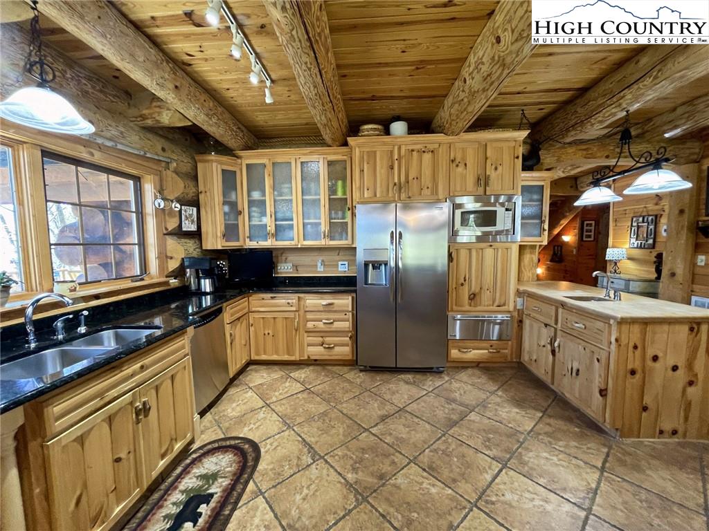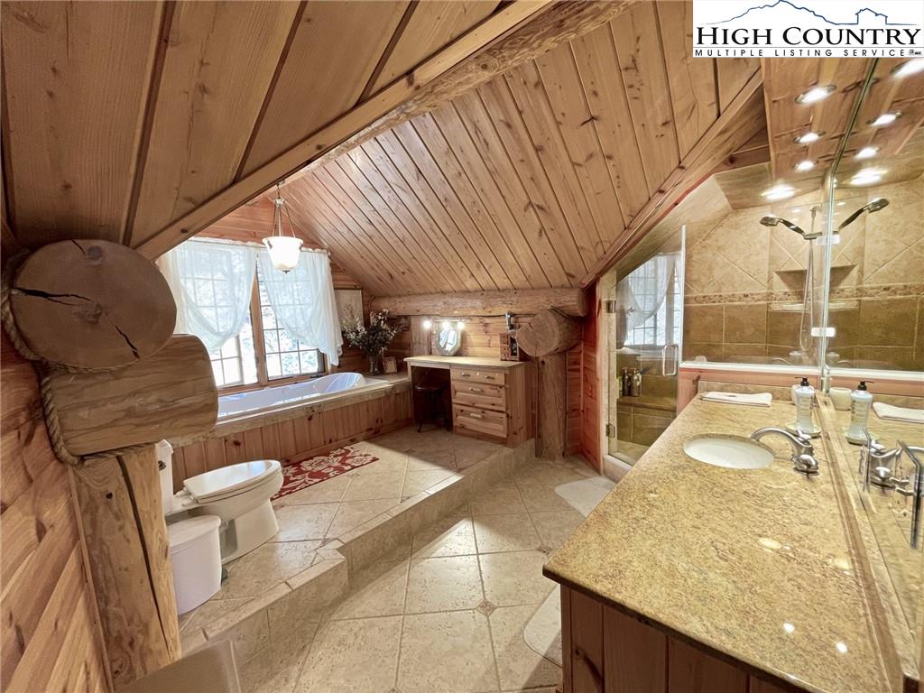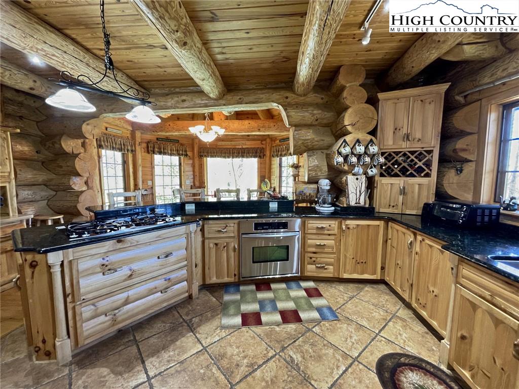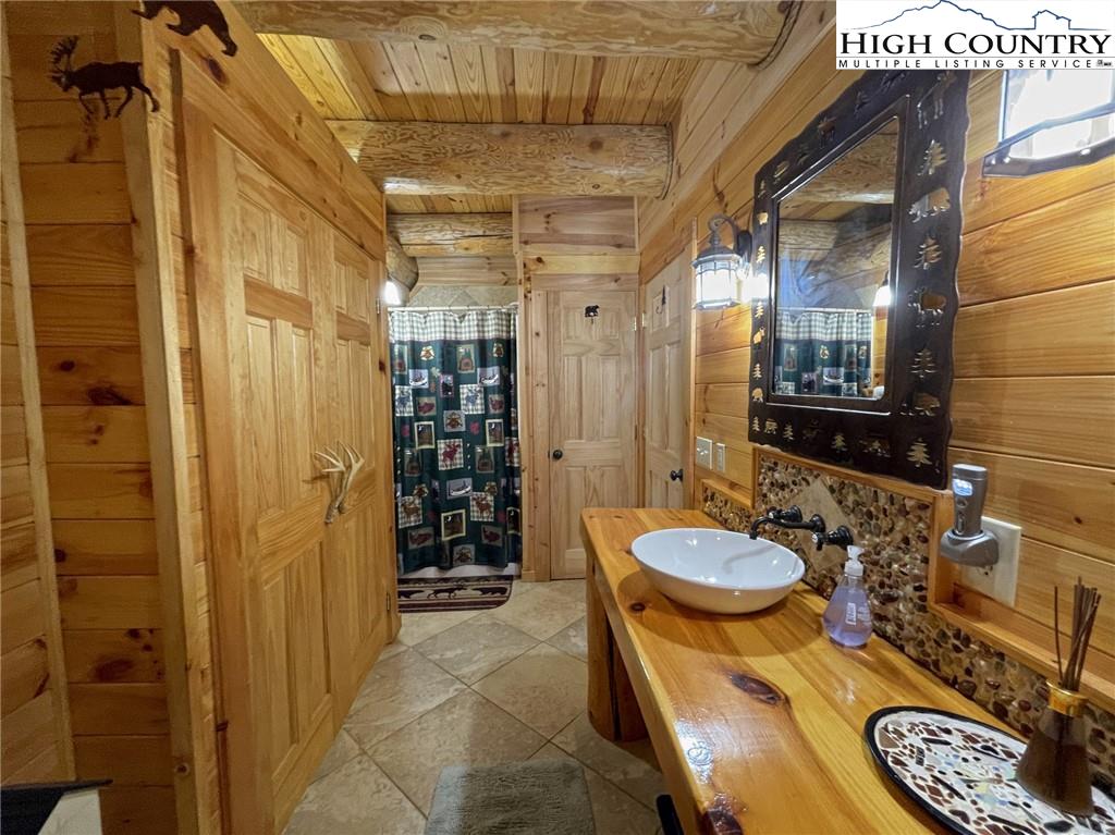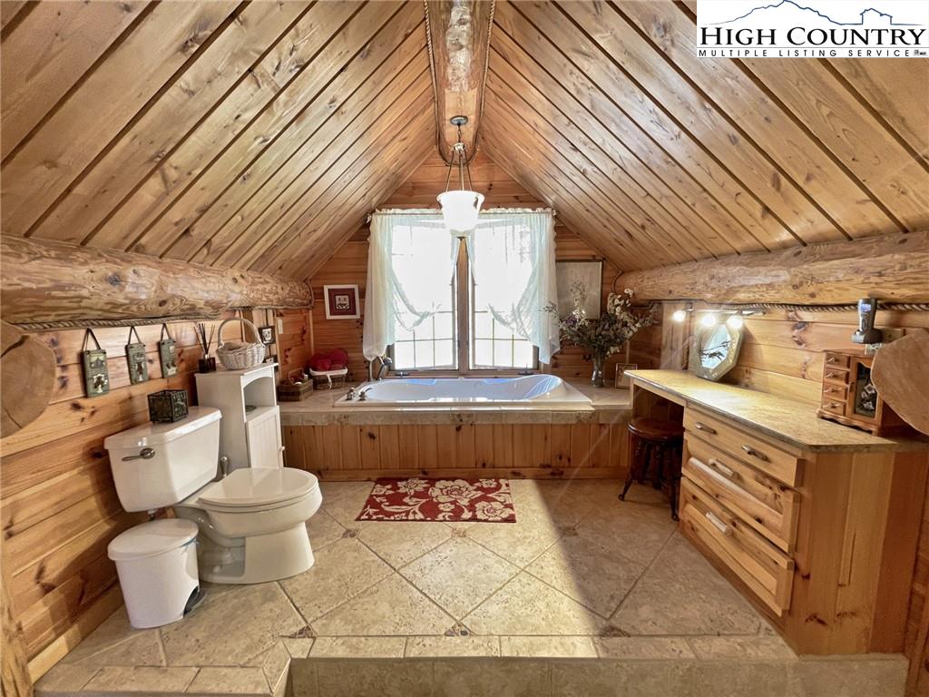 PARADISE FOUND. Just 8 miles out of West Jefferson, this majestic Colorado style log home sits on 12.25 acres bordering 4000 acres of NC state forestry land and provides a very tranquil oasis. This desirable property abounds with trees, wildlife, mountain views and a bold stream, hosting several small waterfalls. There are numerous hiking/ATV trails throughout the property. There is 3-Bedroom septic Permit but a room in the basement is currently being used as a 4th bedroom. This gorgeous home features vaulted beamed ceilings with a soaring two story fireplace, heated tile floors in the kitchen and two of the bathrooms,Cedar closets, alarm system, 7 person hot tub and an outdoor kitchen with expansive deck For entertaining. The home has been wired for integrated TV, stereo and computer. Sellers have made major improvements to this home since they purchased it in 2017. They have paved the scenic driveway to the home, installed a whole house Generator, had logs caulked and stained inside and out, installed radon mitigation system, reinforced deck for hot tub weight, rewired electrical box and so much more. This property is Being offered FURNISHED with few exceptions.