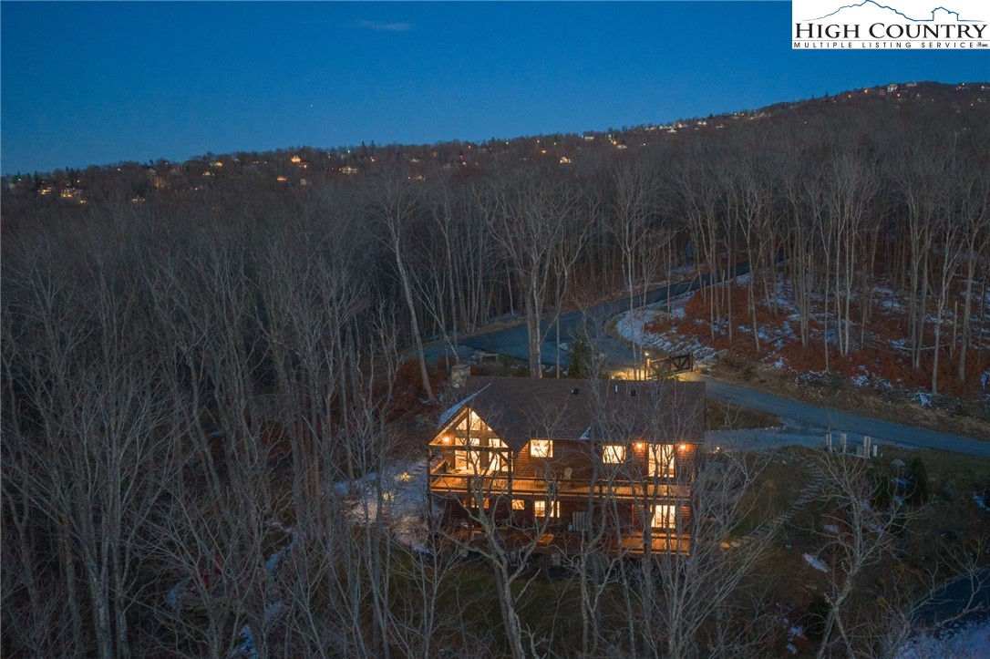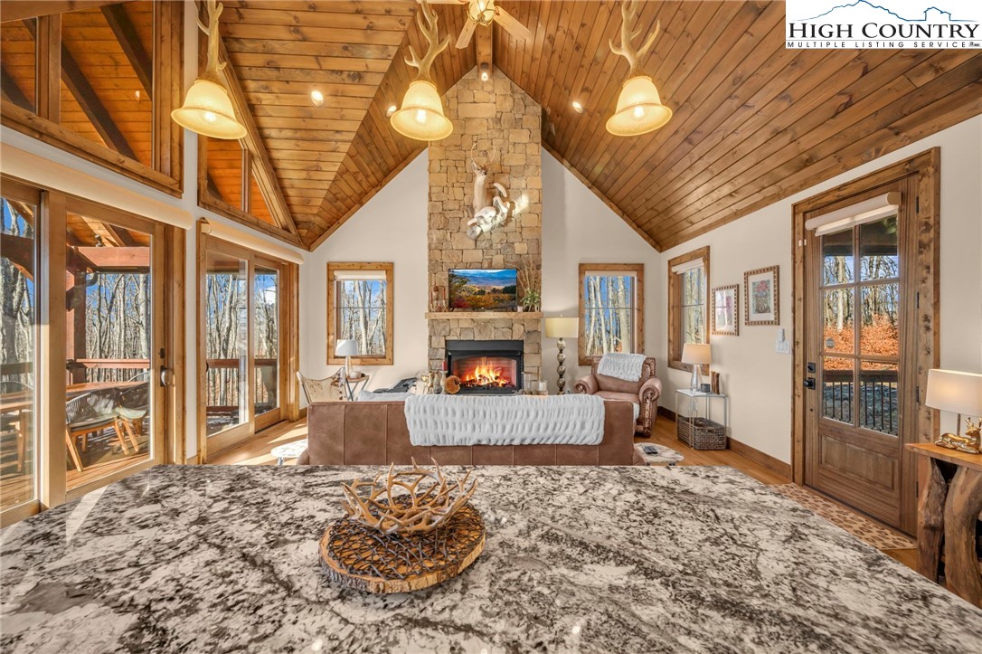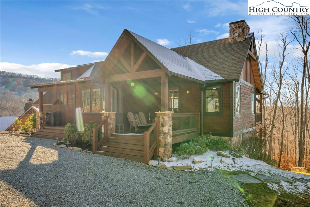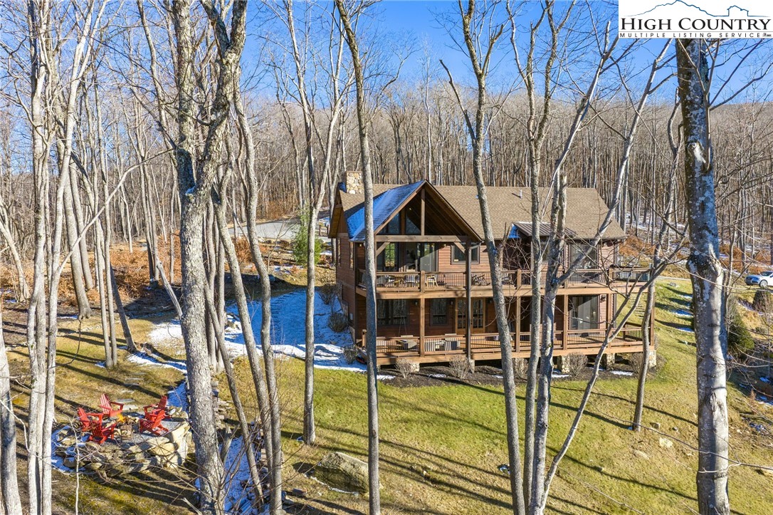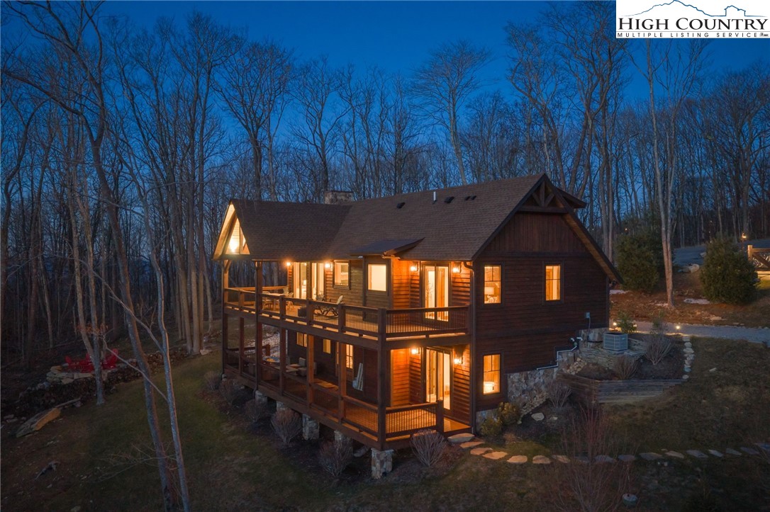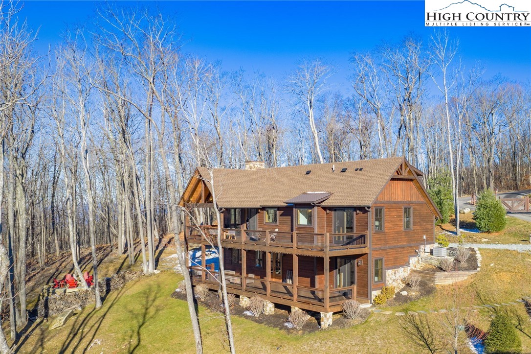 Experience exceptional mountain living in this custom-crafted retreat in The Lodges at Eagles Nest built by Vogel Builders—one of the closest homes in the community to Beech Mountain Ski Resort and just steps from the Beech Mountain gate, premier trails, and amenities. Thoughtfully designed and situated at approximately 4,300 feet of elevation, this 3-bedroom, 2-full and 2-half bath home offers seasonal long-range views, mountain views, dramatic sunsets, and the privacy of a 1.74-acre wooded setting. From the moment you arrive, the home's blend of rustic architecture and refined modern finishes sets it apart. Timber-frame beams, natural stone accents, and expansive glass highlight the surrounding mountain landscape. The main level features a vaulted great room anchored by a floor-to-ceiling stone fireplace, seamlessly connected to the dining area and a designer kitchen with custom cabinetry, premium appliances, and elegant lighting. The main-level primary suite provides a tranquil escape with vaulted ceilings, a spa-inspired bath, and direct access to the deck for enjoying the cool mountain air. The lower level is designed with comfort and hospitality in mind, featuring a spacious second living room with a wet bar and game area, a dedicated bunk room, a guest bedroom, a half bath, a full bath, and a laundry area, an ideal layout for hosting family and friends or maximizing short-term rental potential. Both levels open to expansive decks that invite year-round indoor-outdoor living. Outdoors, you’ll also enjoy a beautiful firepit area and a rare, gently sloping yard with usable space. This home offers an exceptional location within the Lodges at Eagles Nest, positioned directly beside the Beech Mountain gate. Walk or ride to Camp Eagles Nest, which features tennis courts, pickleball courts, playgrounds, and more. With Beech Mountain Ski Resort only 2.3 miles away, winter sports and summer recreation are easily accessible. At the Lodges at Eagles Nest, residents enjoy a wide range of amenities. The amphitheater hosts live summer concerts from May to October, while the Epic Chophouse offers exceptional dining nearby, along with convenient access to Dollar General for quick essentials. Outdoor enthusiasts can explore miles of hiking, biking, and ATV trails, as well as pickleball, tennis, basketball, and soccer courts. Additional activities include climbing towers, an 18-hole putt-putt course, and the popular Eagles Nest Winery, perfect for relaxing with wines and stunning views. Both short-term and long-term rentals are permitted, offering excellent investment flexibility. A stunning blend of luxury, adventure, and mountain serenity, this home stands out as one of the most desirable offerings in Eagles Nest.