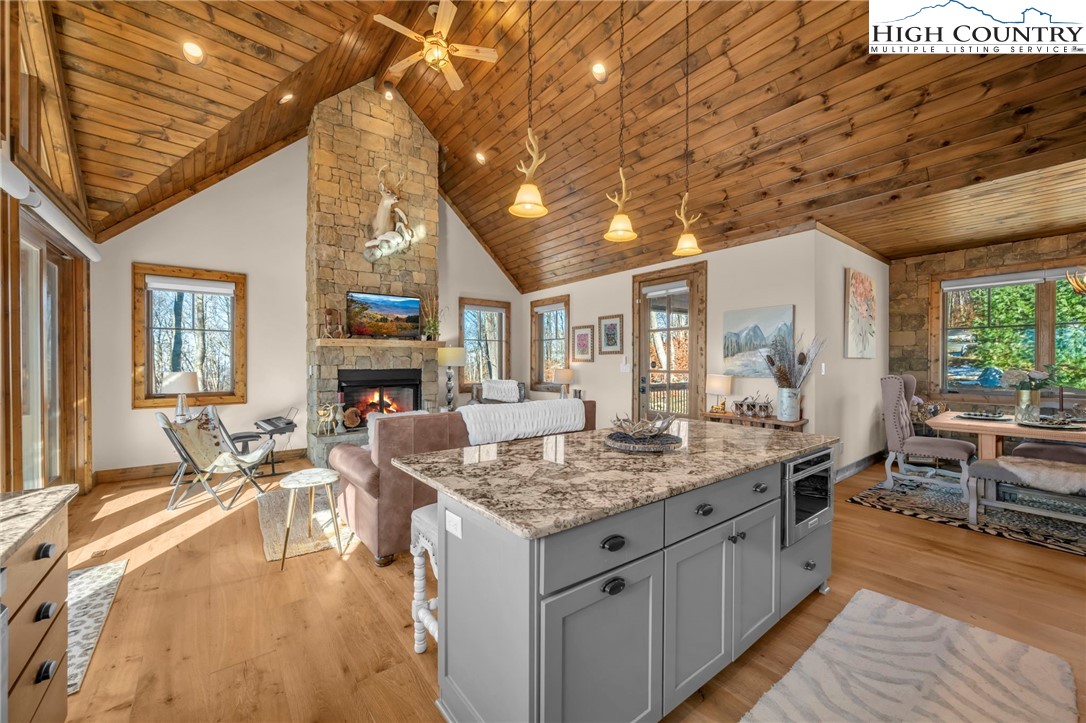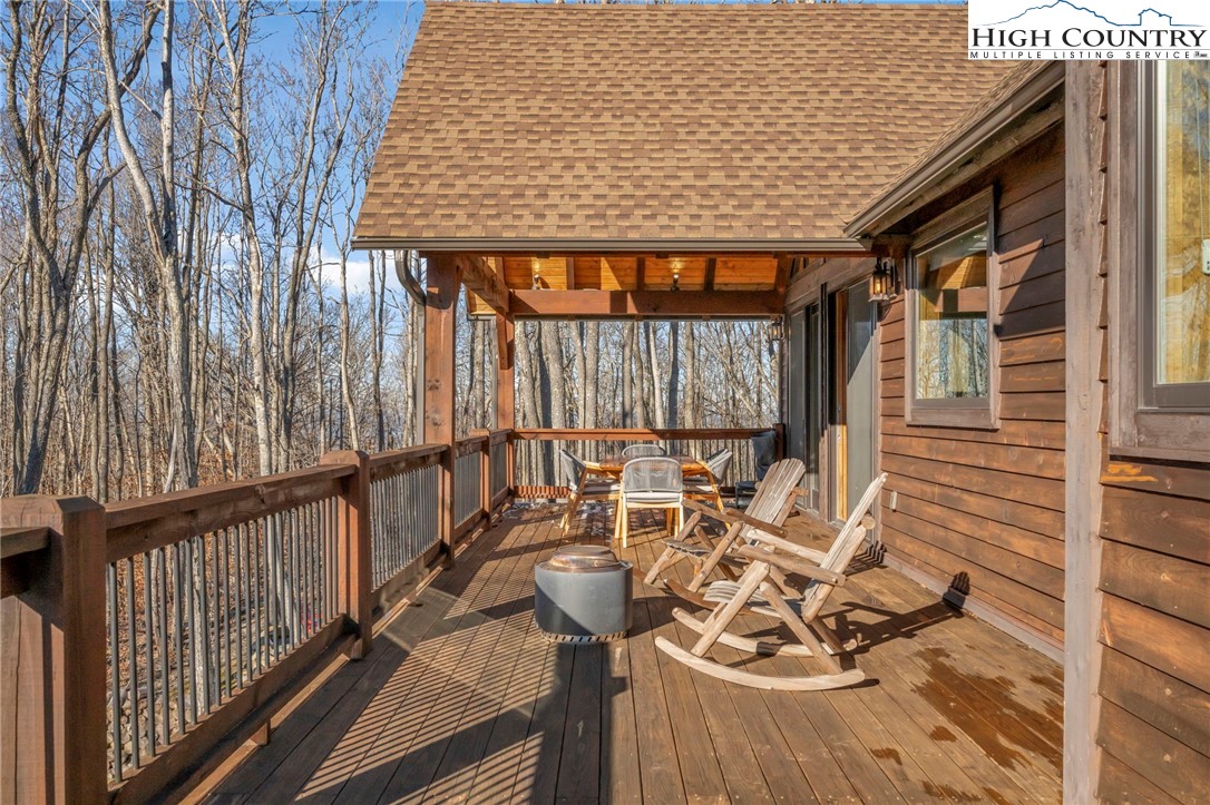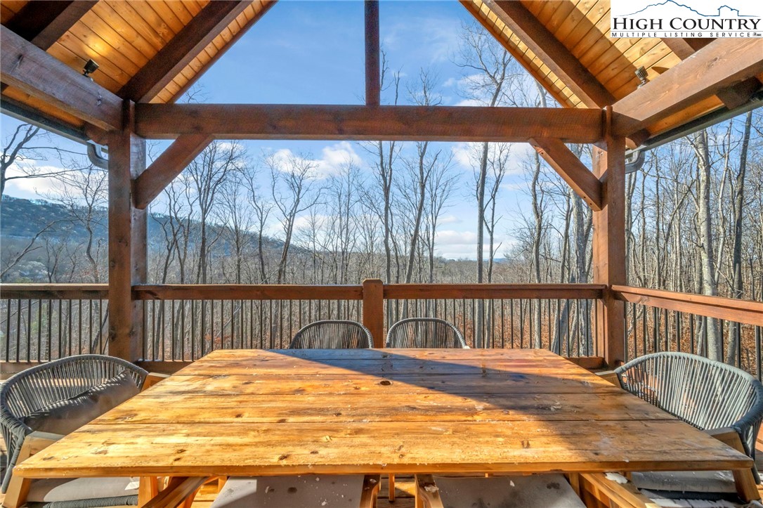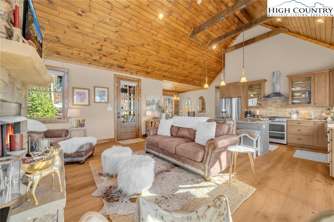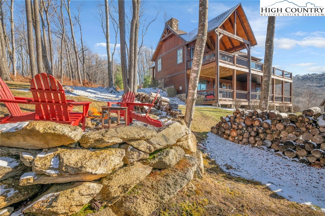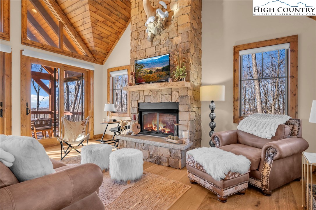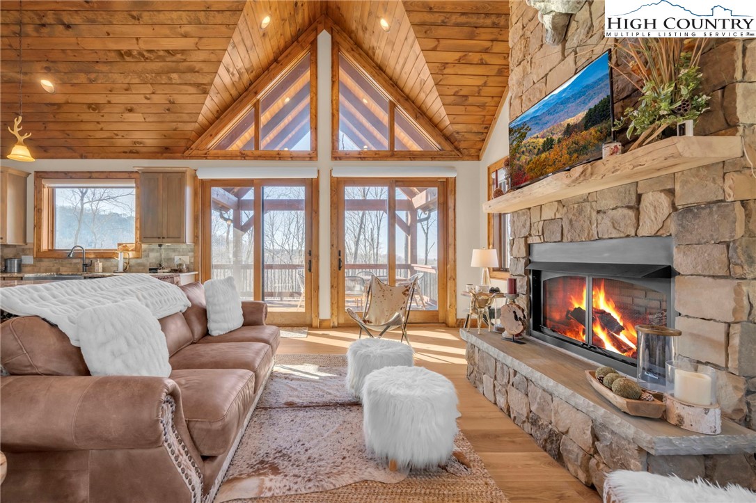 Experience exceptional mountain living in this custom-crafted retreat in The Lodges at Eagles Nest built by Vogel Builders—one of the closest homes in the community to Beech Mountain Ski Resort and just steps from the Beech Mountain gate, premier trails, and amenities. Thoughtfully designed and situated at approximately 4,300 feet of elevation, this 3-bedroom, 2-full and 2-half bath home offers seasonal long-range views, mountain views, dramatic sunsets, and the privacy of a 1.74-acre wooded setting. From the moment you arrive, the home's blend of rustic architecture and refined modern finishes sets it apart. Timber-frame beams, natural stone accents, and expansive glass highlight the surrounding mountain landscape. The main level features a vaulted great room anchored by a floor-to-ceiling stone fireplace, seamlessly connected to the dining area and a designer kitchen with custom cabinetry, premium appliances, and elegant lighting. The main-level primary suite provides a tranquil escape with vaulted ceilings, a spa-inspired bath, and direct access to the deck for enjoying the cool mountain air. The lower level is designed with comfort and hospitality in mind, featuring a spacious second living room with a wet bar and game area, a dedicated bunk room, a guest bedroom, a half bath, a full bath, and a laundry area, an ideal layout for hosting family and friends or maximizing short-term rental potential. Both levels open to expansive decks that invite year-round indoor-outdoor living. Outdoors, you’ll also enjoy a beautiful firepit area and a rare, gently sloping yard with usable space. This home offers an exceptional location within the Lodges at Eagles Nest, positioned directly beside the Beech Mountain gate. Walk or ride to Camp Eagles Nest, which features tennis courts, pickleball courts, playgrounds, and more. With Beech Mountain Ski Resort only 2.3 miles away, winter sports and summer recreation are easily accessible. At the Lodges at Eagles Nest, residents enjoy a wide range of amenities. The amphitheater hosts live summer concerts from May to October, while the Epic Chophouse offers exceptional dining nearby, along with convenient access to Dollar General for quick essentials. Outdoor enthusiasts can explore miles of hiking, biking, and ATV trails, as well as pickleball, tennis, basketball, and soccer courts. Additional activities include climbing towers, an 18-hole putt-putt course, and the popular Eagles Nest Winery, perfect for relaxing with wines and stunning views. Both short-term and long-term rentals are permitted, offering excellent investment flexibility. A stunning blend of luxury, adventure, and mountain serenity, this home stands out as one of the most desirable offerings in Eagles Nest.