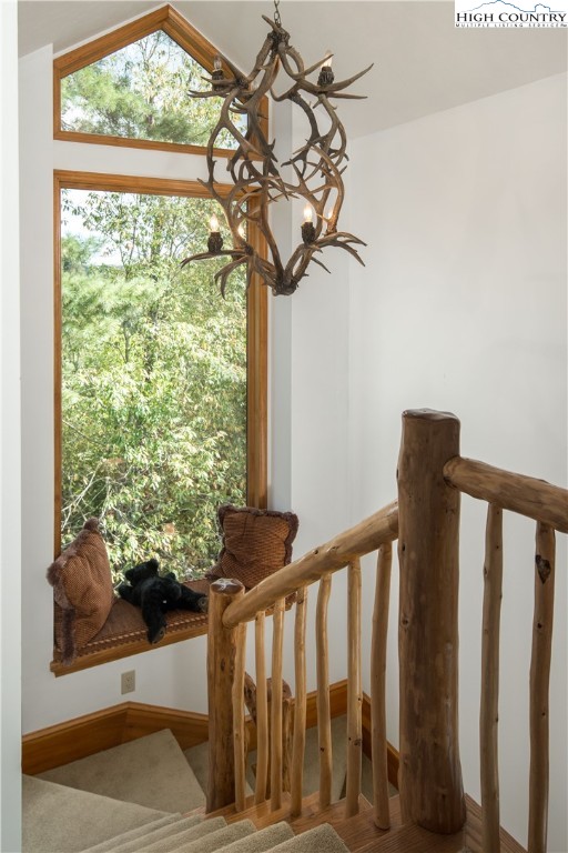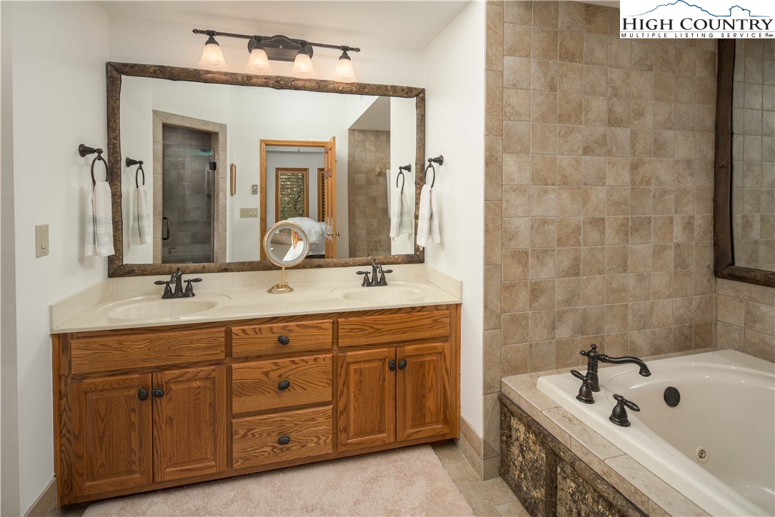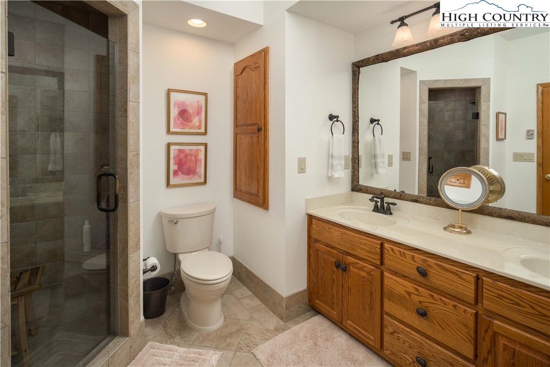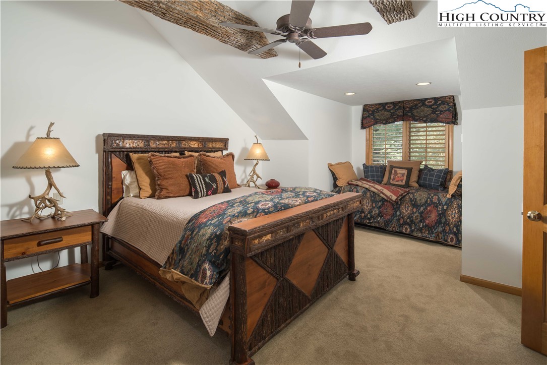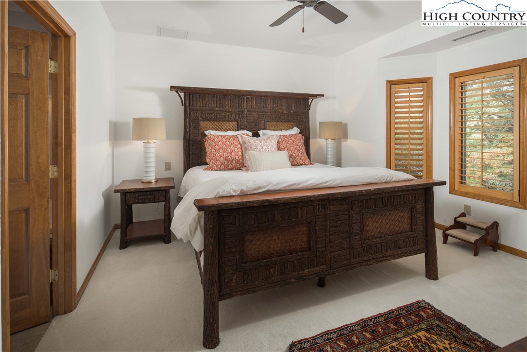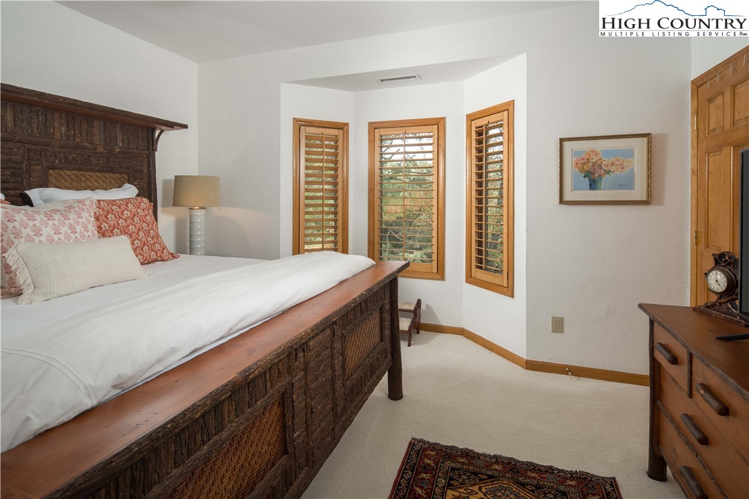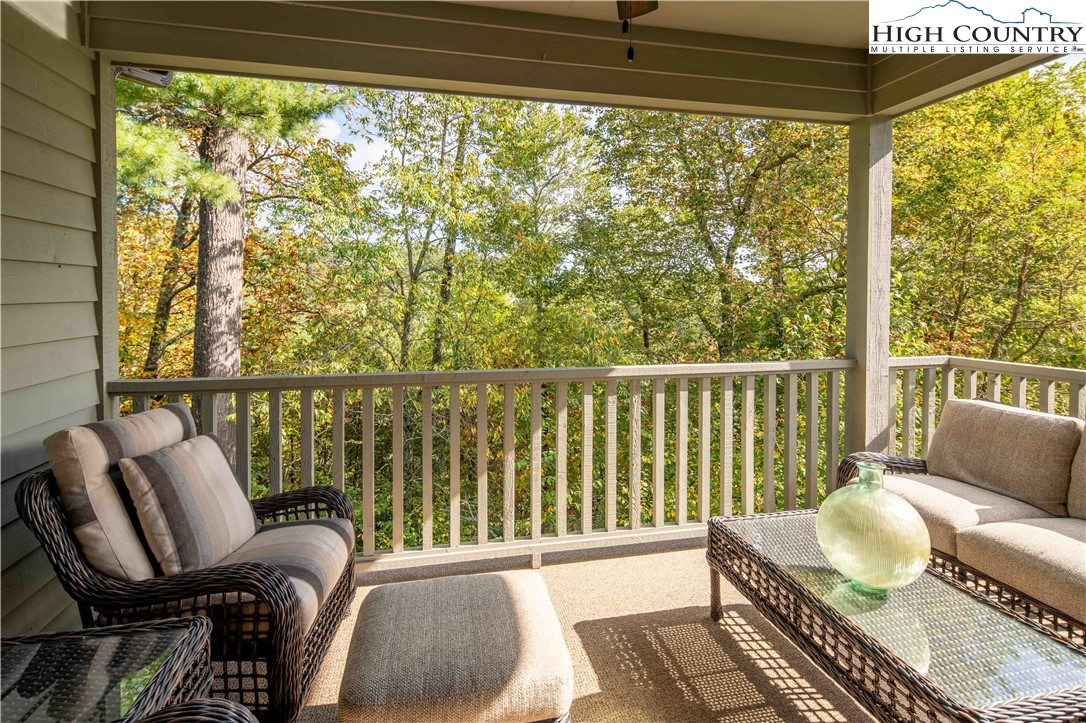 MOVE INTO THIS AMAZING CUSTON DESIGNED CONDO BY THE HOLIDAYS. Perched on the top of Chetola Resort's highest ridge, this stunning condo exudes rustic mountain elegance. This 3-bedroom, 3-bath condo with balcony loft has the touch of a master craftsman throughout. Upon entering the foyer, your spirits are lifted as you view the sweeping high beamed ceiling, the floor-to-ceiling stone fireplace and the handcrafted bannisters on the stairs and balcony above. All through the condo, there is handcrafted wood furniture-some with insets of bark, especially designed for this space. The foyer, dining and kitchen areas, guest bedroom, full bath and laundry areas are on a level two steps above the space below. A quaint banister made of rhododendron and tree limbs divides the two areas of the great room, wet bar, primary bedroom and bath and covered porch. Step down to the sitting area with its large leather sofa, end tables, coffee table and its pair of leather club chairs with pinto fur insets. Beside them is a horsehead porcelain lamp on a unique hexagonal table. Next to the propane fireplace is a tall bark armoire which holds a flat-screen TV. Across through the sliding glass doors, is a covered porch looking out into the treetops. It has a a sofa, end tables, coffee table and two comfortable chairs. A cool area for conversation and cocktails. Back in the great room , there is a well-equipped wet bar flanked by an unusual bark grandfather clock. To the right of the wet bar is the primary suite with adjacent bath with tile shower and whirlpool tub and double sinks. The bedroom is light-filled through a bay window.There is a custom king bed with special bedding and a bark-covered chest of drawers with flat-screen TV on top. There is a generous walk-in closet with shelving. Go up two steps to the dining and kitchen area. There is a large dining table with 8 upholstered chairs overhung by a interesting antler chandelier. Adjacent is the kitchen with granite-topped counters and gas stove. The cupboards and cabinets are fully equipped with dishes, flatware, pots and pans. There are two stools for enjoying snacks at the granite-topped bar. There is a generous pantry. A great kitchen for turning out festive meals! Across the foyer is a guest bedroom with bay window. It is furnished with queen bed, bedside tables, bureau, flat-screen tv and has a large closet. Just outside in the hall is a bath with tub/shower and granite topped counter and linen closet. Across from the bath is a laundry with washer/dryer. Ascend the stairs to the loft above. Stop halfway up to sit in the upholstered window seat to read a book or gaze at the treetops. The balcony loft has a tall bark secretary and there is storage at each end. Go in the third bedroom with its queen bed and a bay window trundle bed sitting and sleeping space. Adjacent is a bath with tile shower, linen storage and large closet. A great guest room for family and grandchildren. This extraordinary custom-designed condo is unique amongst the Chetola condos with its unique customization. Chetola is a famous resort throughout the southeast. It is a destination for weddings, special events and getaways. It has a bar and restaurant, spa, indoor swimming pool, lake for paddle boating and fishing, In addition there is a skeet shooting range nearby. Best of all, the location is walk-to-town to the sought-after Village of Blowing Rock with its shopping, restaurants, museums, parks and churches.