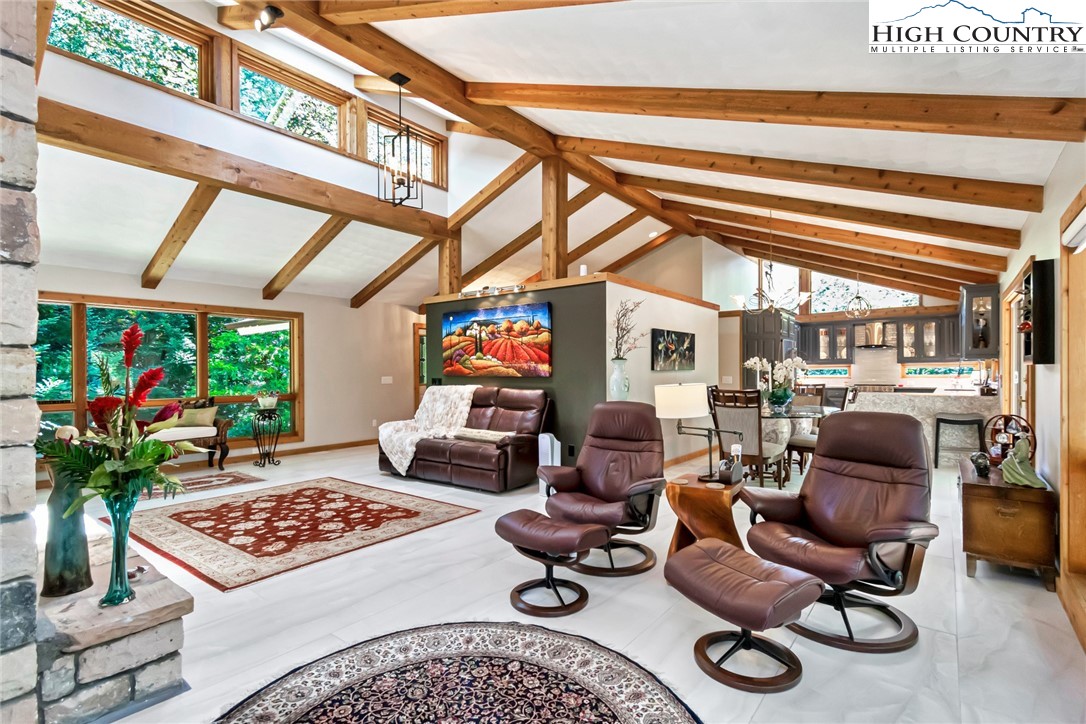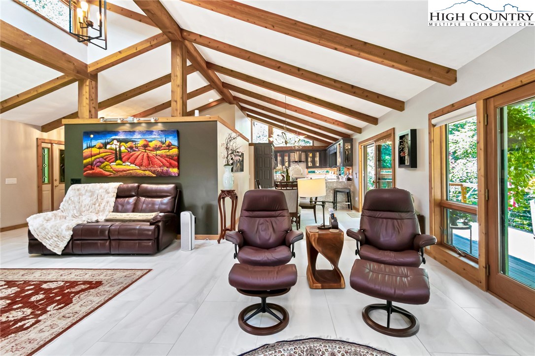 Nestled in the highly sought-after Tanglewood neighborhood of Linville, NC, this Home was architecturally designed as a three bedroom floor plan, and is nothing short of a masterpiece. Its elegant design is perfectly matched by its breathtaking surroundings. Perched on a gentle hill, this sanctuary overlooks a sprawling 1.89-acre tapestry of natural beauty, featuring 204 feet of enchanting river frontage along the Linville River, complete with picturesque waterfalls that add a touch of serenity. Every inch of this home has been painstakingly renovated, showcasing an exquisite upper level adorned with soaring cathedral ceilings. The gourmet kitchen is a chef's dream, while the expansive great room is flooded with natural light, providing calming and picturesque views through its grand windows. The master suite is a lovely oasis, complete with a luxurious ensuite bathroom. An adaptable room, currently serving as an office, can easily be transformed into a guest room, complete with its own bathroom, offering flexibility to suit your lifestyle needs. The lower level is equally captivating, featuring another inviting great room with a cozy fireplace, leading to the primary suite that opens onto a tranquil patio— enjoy the soothing ambiance of the surroundings. Peace of mind is guaranteed with a state-of-the-art whole-house generator, a charcoal-filter water system, and an advanced security system. Elevated well above the river, this home stands resilient against flooding and has gracefully withstood Hurricane Helene without a hitch. Embark on a 3D tour to truly appreciate the meticulous craftsmanship and unparalleled charm of this extraordinary residence. This is a once-in-a-lifetime opportunity to own a home that is as unique as it is stunning. Don't let this treasure slip away.