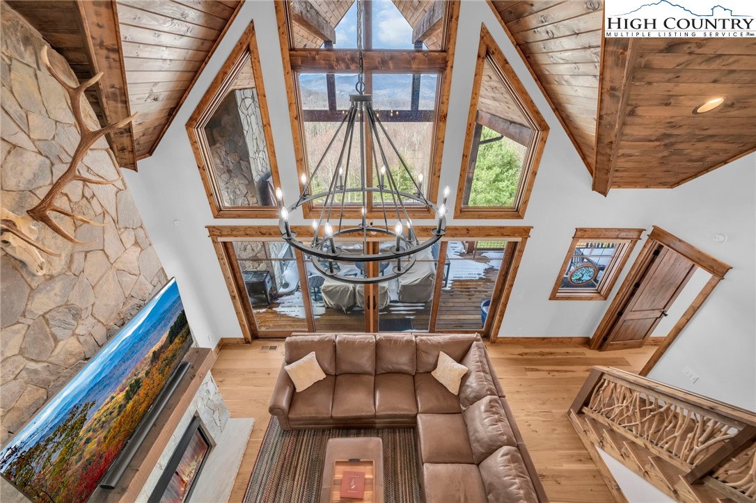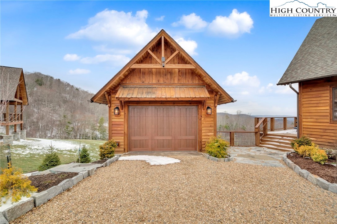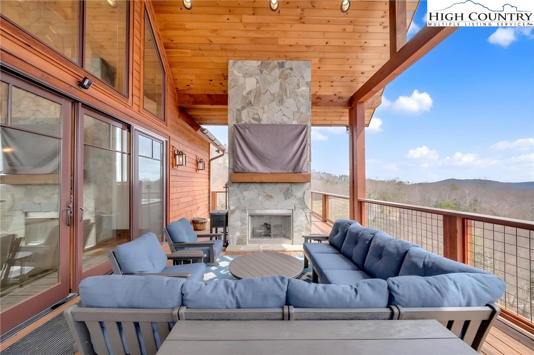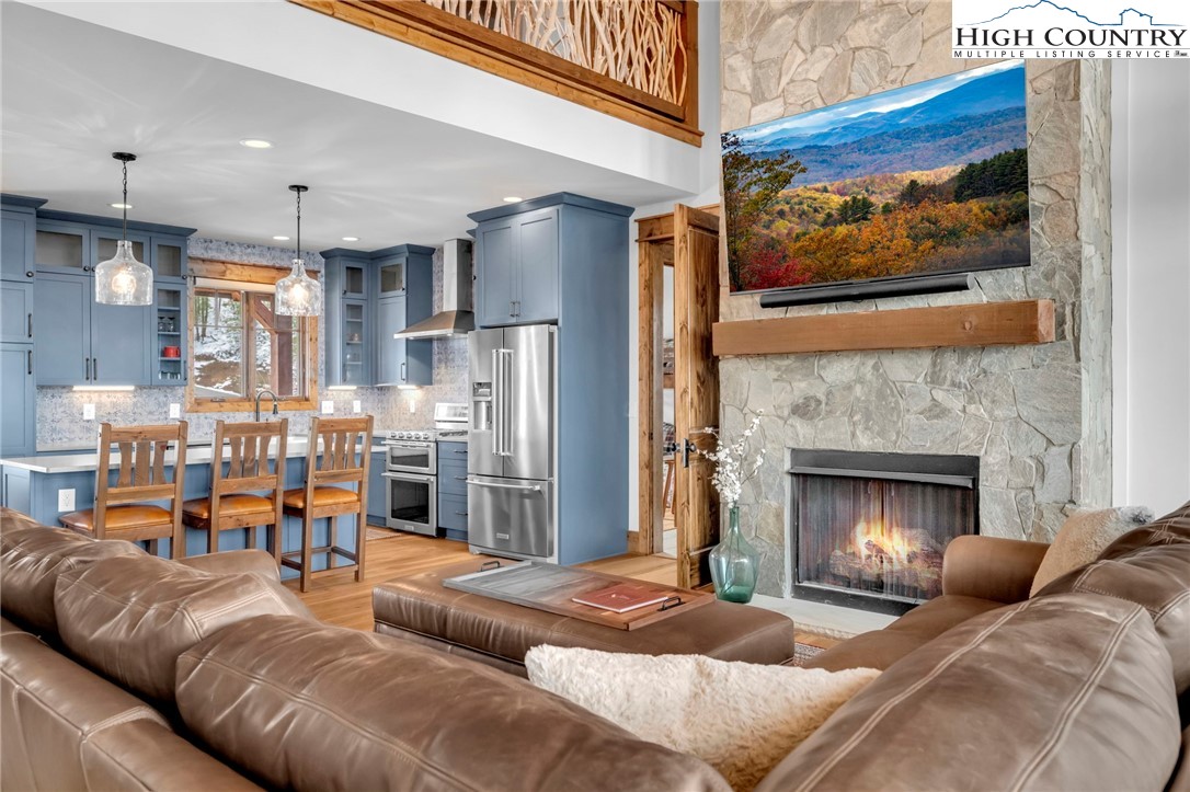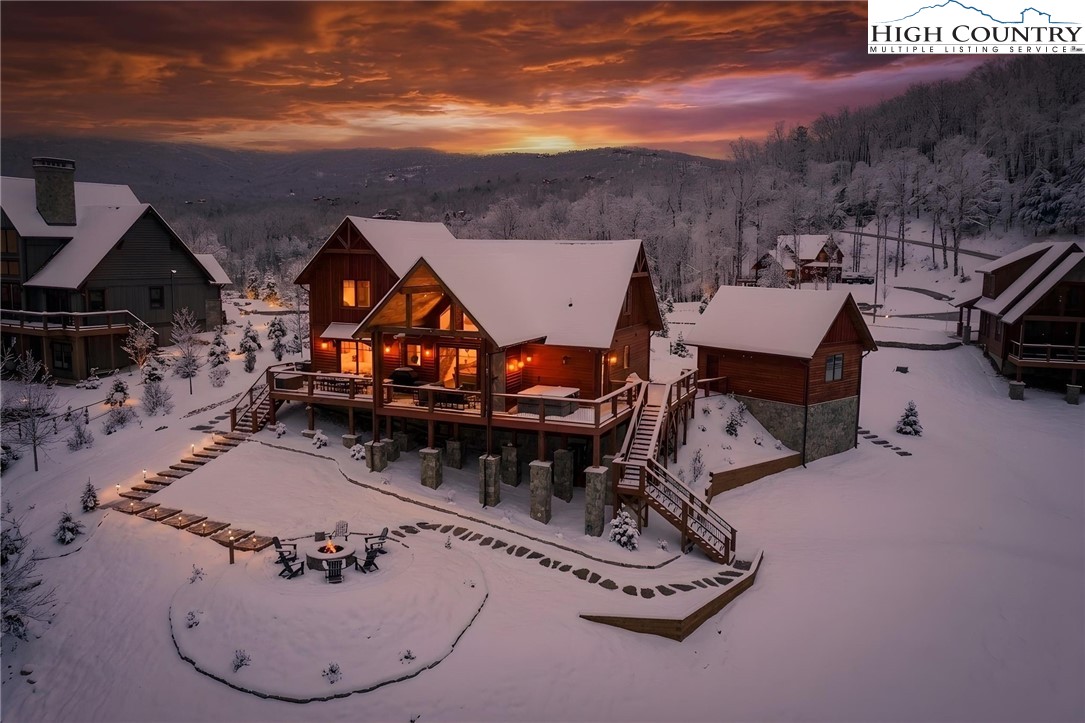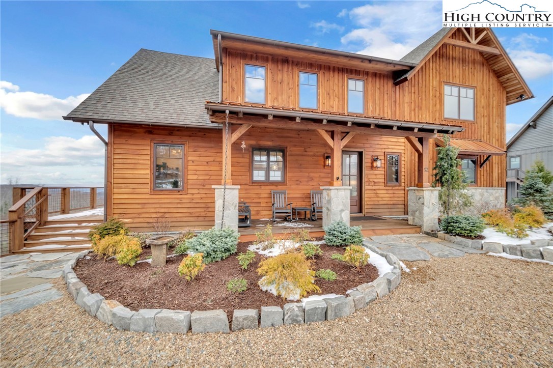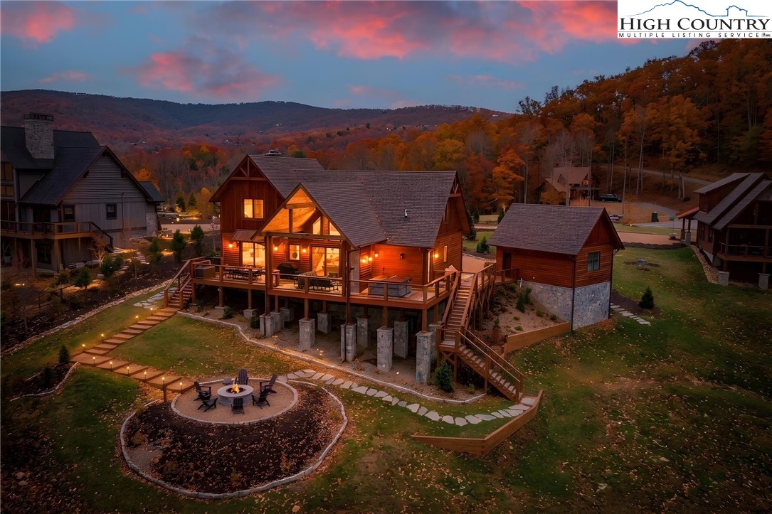 Nestled at the end of a quiet cul-de-sac in The Lodges at Eagles Nest, this beautifully crafted 4-bedroom, 4-bath mountain retreat offers privacy, long-range views, and exceptional quality on nearly 3 acres. Designed for both comfort and entertaining, the home features vaulted ceilings, wide plank hickory flooring, and a dramatic stone fireplace extending to the ceiling in the great room, creating a warm and inviting mountain atmosphere. The spacious kitchen is appointed with quartz countertops, upgraded appliances, farm sink, beverage bar with refrigerator and ice maker, and designer backsplash, making it perfectly tailored for hosting gatherings. A convenient mudroom entrance between the home and detached garage adds functionality for mountain living. Step outside to experience the true highlight of the property—expansive covered decks with a stone gas log fireplace overlooking sweeping long-range mountain views. Just below, a beautifully constructed stone fire pit patio creates the perfect setting for evening conversations under the stars. The detached garage is fully insulated and climate controlled with its own mini-split heating and cooling system, ain industrial sink with hot and cold water, and separate electric service, offering exceptional flexibility for storage, workshop space, or future conversion to additional living space. The home also features a 40kW liquid cooled whole-house Generac generator, radon mitigation system, upgraded insulation, and extensive structural enhancements for durability and efficiency. Additional highlights include level entry access, upgraded lighting, structured wiring, remote controlled retractable roller shades, and premium finishes throughout. Located within the highly sought-after Lodges at Eagles Nest community, residents enjoy access to world-class amenities including hiking and ATV trails, winery, fitness center, sports courts, and outdoor recreation areas. A rare opportunity to own a serene, luxury mountain retreat with incredible views and exceptional upgrades in one of Banner Elk’s premier communities.