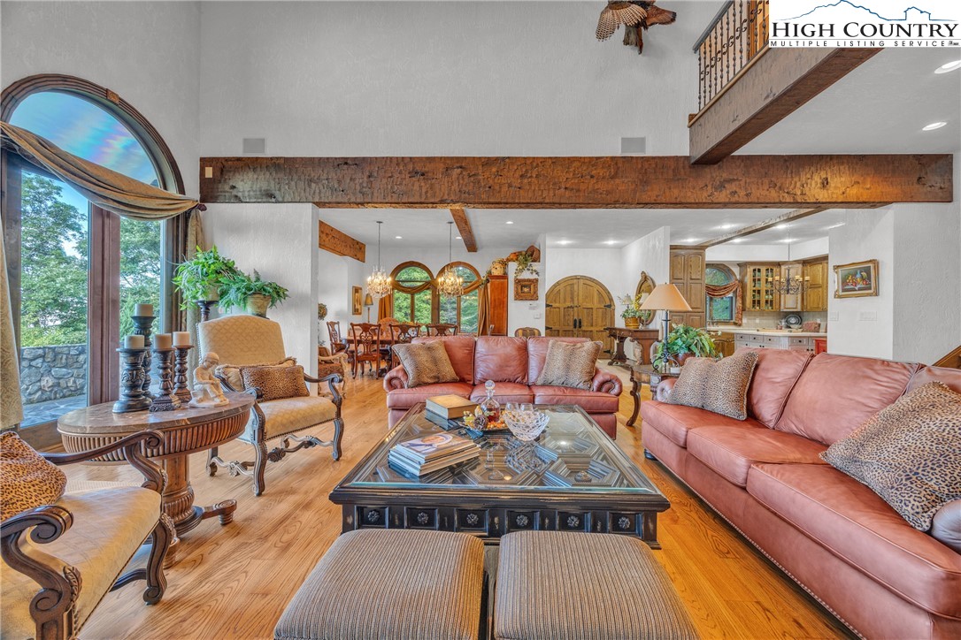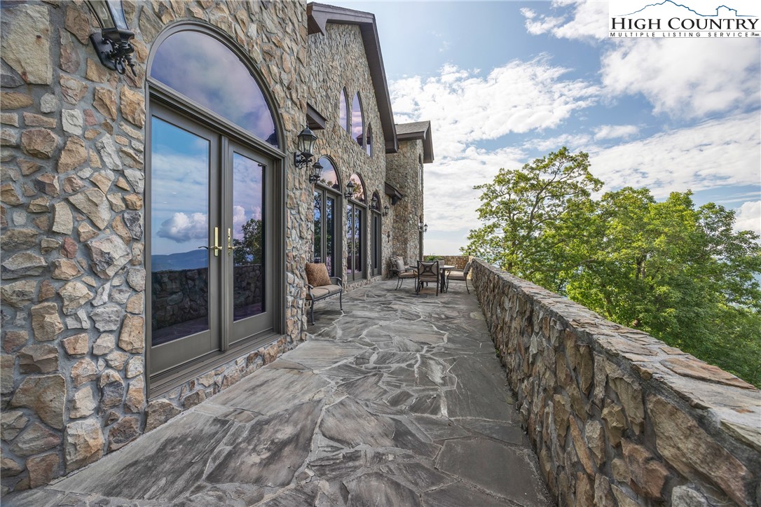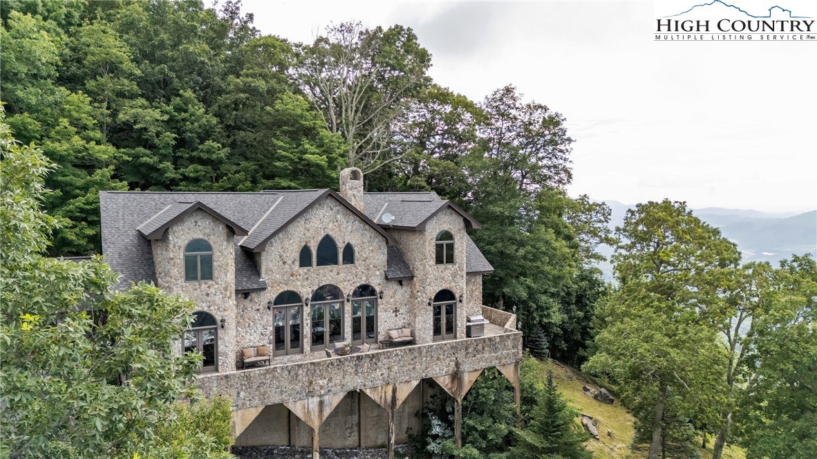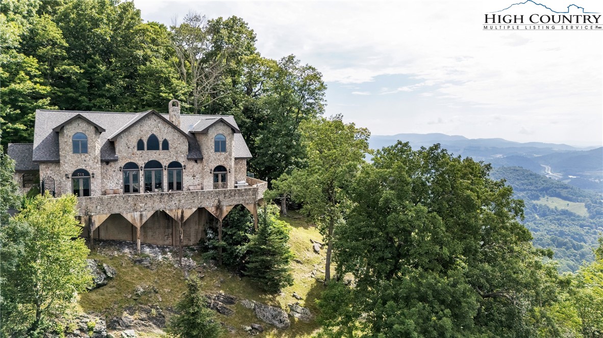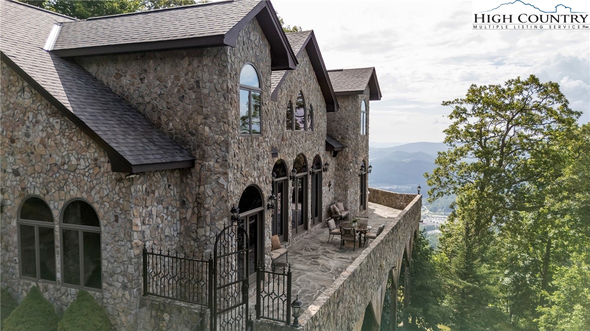 Set high above the heart of Boone, this distinctive mountain estate commands sweeping, multi-range Appalachian views overlooking the town and Appalachian State University below — with the rare assurance of adjoining land permanently protected by Blue Ridge Conservancy, preserving both privacy and view corridors for generations to come. Approached by a private drive, the home immediately establishes a sense of arrival. A covered front porch offers a quiet place to take in the elevation and setting, while the rear of the home opens to a large stone patio designed for entertaining, dining, and soaking in the expansive mountain and town views beyond. Inside, the home is rich with character and craftsmanship. Wide-planked hardwood floors, framed beams, and vaulted ceilings create warmth and scale throughout. The expansive living area is anchored by a massive stone fireplace, serving as both a focal point and gathering space, with French doors that open directly to the stone patio and views beyond. A chef’s kitchen flows seamlessly into the main living spaces, ideal for both everyday living and hosting. A formal dining area, also featuring French doors, connects indoor gatherings to the outdoor terrace, reinforcing the home’s emphasis on lifestyle and connection to its setting. Next, a stunning primary suite with a dramatic stone feature wall, private sitting nook with French doors to the patio, dual walk-in closets, and a spa-level bath featuring a large stone shower, his-and-hers vanities, and exceptional storage. Upstairs, a light-filled loft with arched windows overlooks both the living area and the surrounding mountain views, creating an ideal reading space, studio, or secondary lounge. Also on the upper level are two additional primary-style ensuites, each exceptionally well-appointed with private full baths, dedicated office or sitting areas, and four closets per suite. This rare configuration makes the home equally suited for hosting family, extended stays, or multi-generational use — without sacrificing privacy. There is no HOA, therefore no architectural restrictions, and no monthly dues, offering a level of autonomy that is increasingly difficult to find in the High Country. A detached garage or motor court can be accommodated along the private drive, providing future flexibility while preserving the home’s setting and views. The true value of this property lies in what cannot be replicated: permanently protected neighboring land, unobstructed long-range views, and a vantage point above one of North Carolina’s most vibrant mountain towns. This is a home for those who understand Boone — and who seek not just a residence, but a legacy mountain estate defined by permanence, privacy, and character. This home truly provides the best views in town.