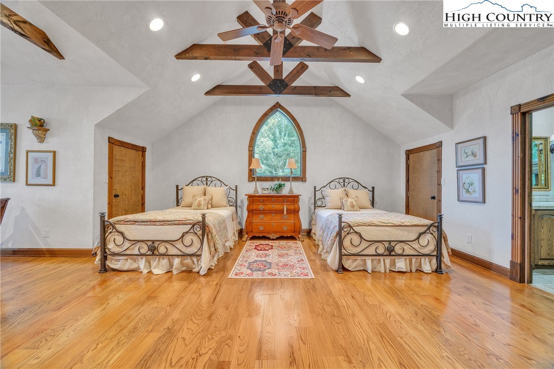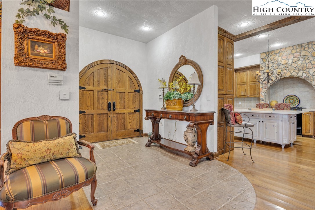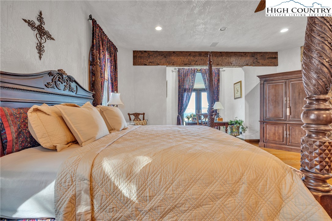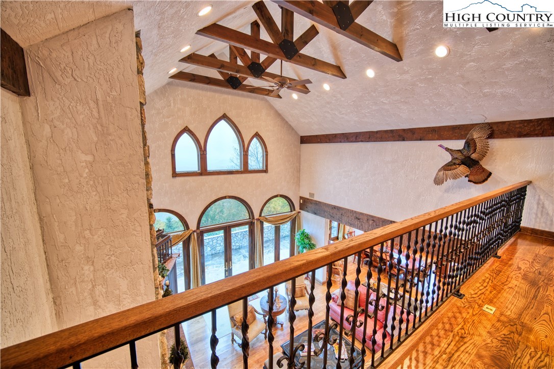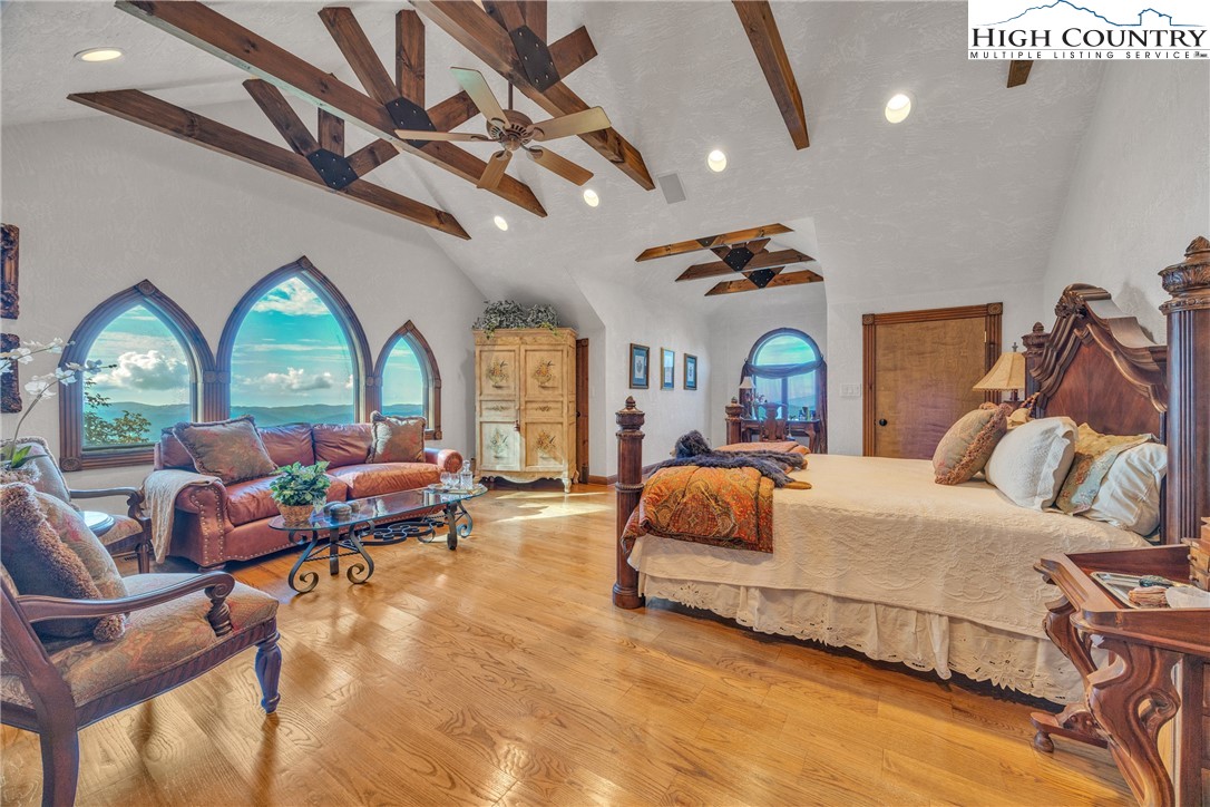 Set high above the heart of Boone, this distinctive mountain estate commands sweeping, multi-range Appalachian views overlooking the town and Appalachian State University below — with the rare assurance of adjoining land permanently protected by Blue Ridge Conservancy, preserving both privacy and view corridors for generations to come. Approached by a private drive, the home immediately establishes a sense of arrival. A covered front porch offers a quiet place to take in the elevation and setting, while the rear of the home opens to a large stone patio designed for entertaining, dining, and soaking in the expansive mountain and town views beyond. Inside, the home is rich with character and craftsmanship. Wide-planked hardwood floors, framed beams, and vaulted ceilings create warmth and scale throughout. The expansive living area is anchored by a massive stone fireplace, serving as both a focal point and gathering space, with French doors that open directly to the stone patio and views beyond. A chef’s kitchen flows seamlessly into the main living spaces, ideal for both everyday living and hosting. A formal dining area, also featuring French doors, connects indoor gatherings to the outdoor terrace, reinforcing the home’s emphasis on lifestyle and connection to its setting. Next, a stunning primary suite with a dramatic stone feature wall, private sitting nook with French doors to the patio, dual walk-in closets, and a spa-level bath featuring a large stone shower, his-and-hers vanities, and exceptional storage. Upstairs, a light-filled loft with arched windows overlooks both the living area and the surrounding mountain views, creating an ideal reading space, studio, or secondary lounge. Also on the upper level are two additional primary-style ensuites, each exceptionally well-appointed with private full baths, dedicated office or sitting areas, and four closets per suite. This rare configuration makes the home equally suited for hosting family, extended stays, or multi-generational use — without sacrificing privacy. There is no HOA, therefore no architectural restrictions, and no monthly dues, offering a level of autonomy that is increasingly difficult to find in the High Country. A detached garage or motor court can be accommodated along the private drive, providing future flexibility while preserving the home’s setting and views. The true value of this property lies in what cannot be replicated: permanently protected neighboring land, unobstructed long-range views, and a vantage point above one of North Carolina’s most vibrant mountain towns. This is a home for those who understand Boone — and who seek not just a residence, but a legacy mountain estate defined by permanence, privacy, and character. This home truly provides the best views in town.