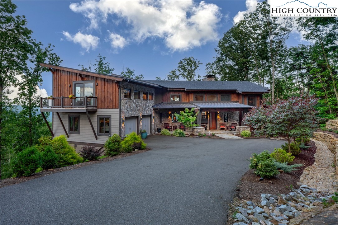 A rare opportunity to own 12 acres in the Blue Ridge Mountain Club with panoramic, breathtaking long-range mountain views. This upscale mountain retreat offers the perfect blend of luxury and comfort, in a private setting with the comfort of access through a gated community. With a wall of eastern windows, the morning sunrises over the mountains are amazing, and the wooded lot has a seasonal creek and waterfall that run though the property. Showcasing the sweeping views, the home blends the rustic elegance of soaring wood cathedral ceilings, a stone fireplace, and wood floors. The gourmet kitchen features Wolf/Sub Zero appliances including a 6 burner/griddle cooktop, double oven, microwave drawer, warming drawer and built in Wolf coffee machine. Accordion glass doors open to the outdoor covered living/dining area with a wood burning fireplace that blends seamlessly with your indoor space. A lower deck has a hot tub and additional sitting area. The home has 5 bedrooms and 5 ½ baths, providing ample space for guests and family. Each bedroom has its own en-suite bathroom with tile showers. The master suite is located on the main level, complete with a fireplace and heated floors in the bathroom. There is a second primary suite on the lower level, with another en-suite bath with heated floors. The upper level has an efficiency apartment, complete with a full kitchen, sitting area, private balcony, washer/dryer hook ups, king size bedroom and full bath. The lower level, in addition to two bedrooms, has an entertaining area with another fireplace, sitting/TV area, built in bar with ice maker, cooling beverage drawers and dishwasher, and a temperature-controlled wine cellar. Three garage spaces (one with mini split for heating/cooling), an elevator, solar shades and a generator finish off the amenities of this amazing home. As part of the Blue Ridge Mountain Club, you will have access to a variety of world-class amenities including a wellness/fitness center, pool, restaurant, pickleball courts, and miles of hiking/UTV trails across over 6000 acres. There are freshwater ponds and creeks for fishing, social clubs and activities scheduled throughout the year. Located conveniently between Blowing Rock and Boone, this estate epitomizes luxury mountain living.
