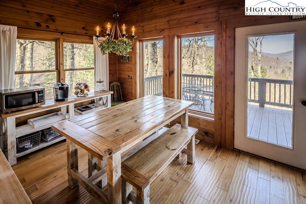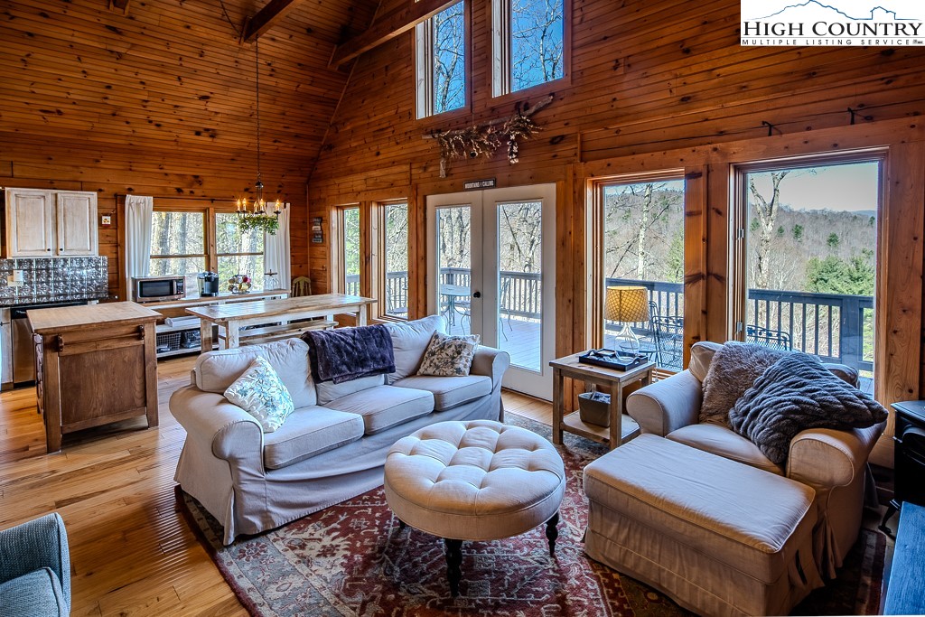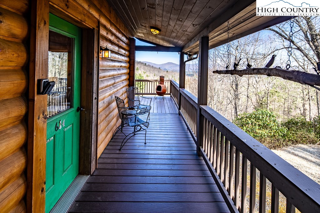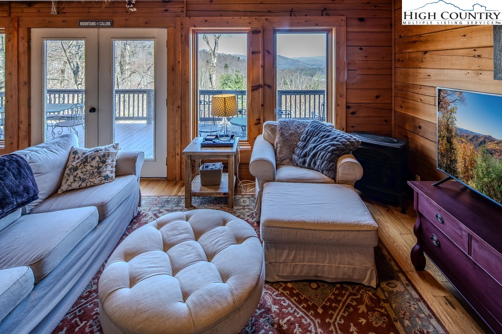 This log home offers stunning layered mountain views of Howard’s Knob, Elk Knob, and Rich Mountain. Conveniently located only five minutes or less to Boone Golf Course, Blue Ridge Parkway, the Greenway, Samaritan’s Purse, and the hospital. The great room features hickory wood floors and a dramatic wall of floor-to-ceiling windows showcasing long-range mountain views, with access to covered and uncovered decks. The home has 2 bedrooms, 3 baths, an additional room that is currently used as a bedroom, and a lower-level family/media room. An outbuilding with electricity provides added flexibility for storage or workspace. Offered fully furnished with both short- and long-term rentals allowed, this property is ideal as a primary home, mountain getaway, or investment opportunity. Road maintenance agreement is $500 annually.