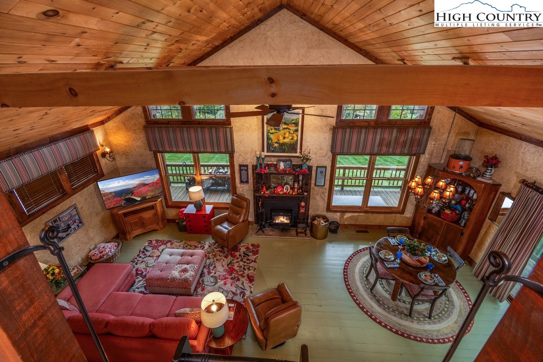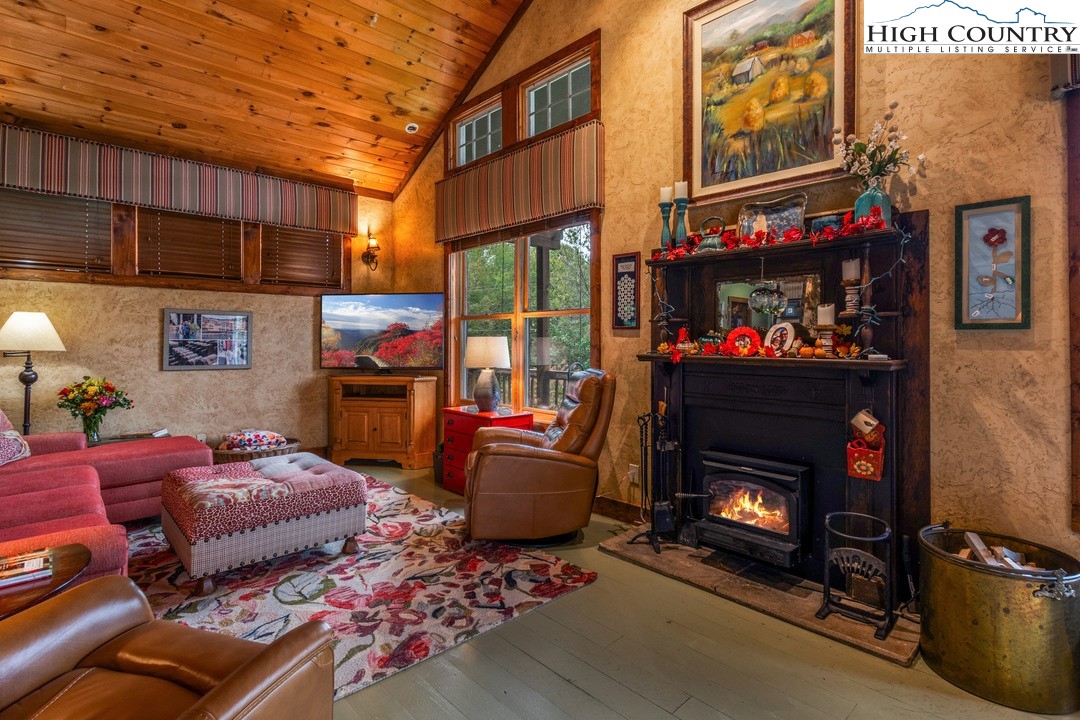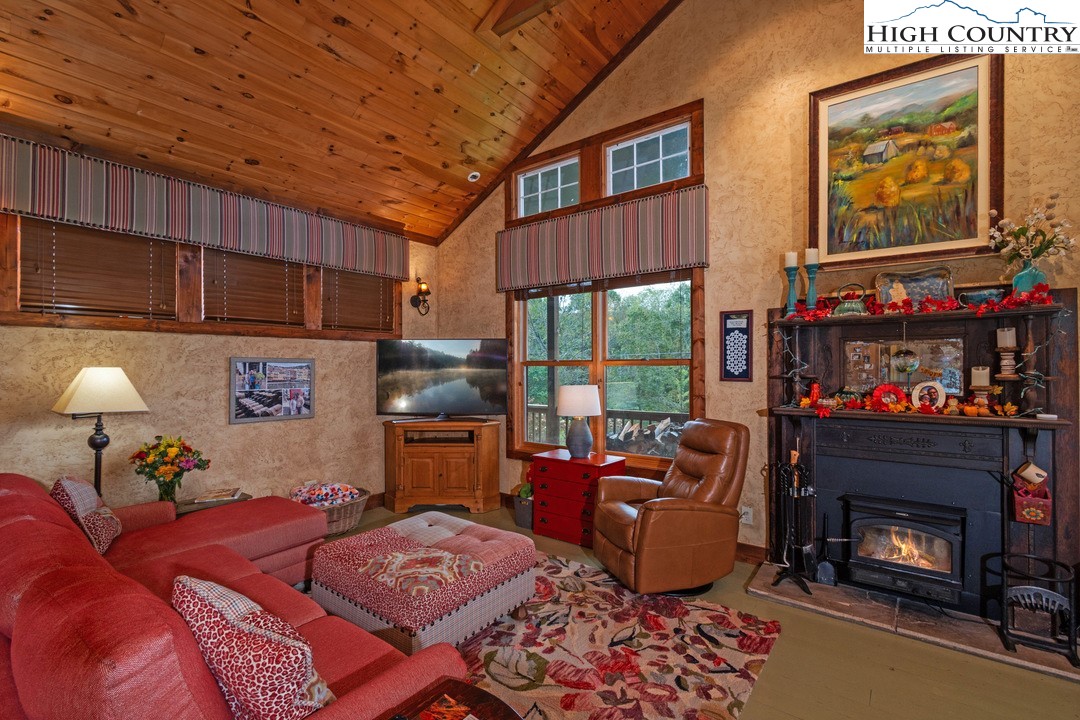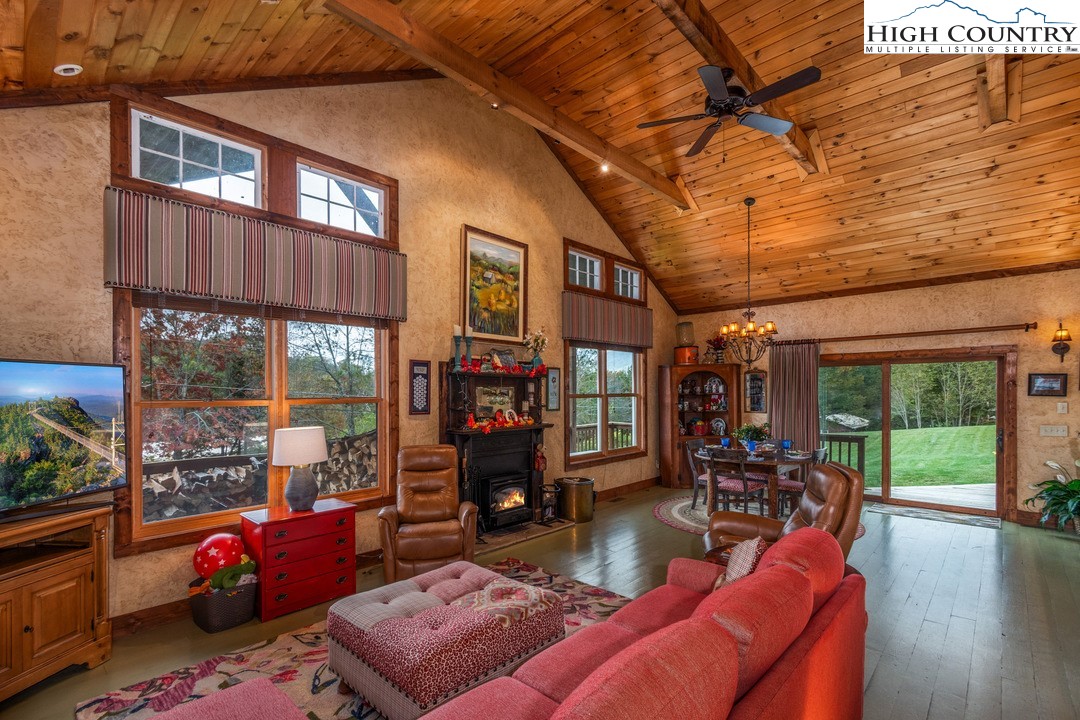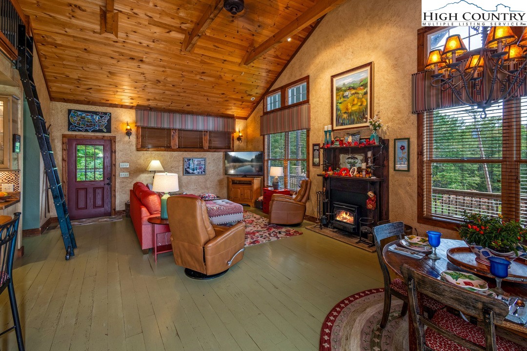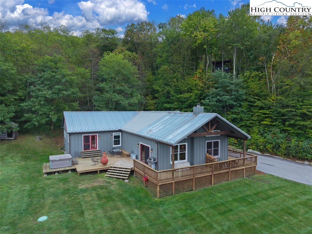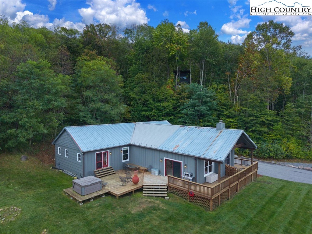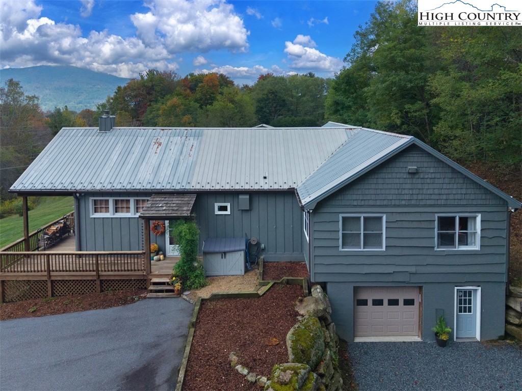 Mountain charm abounds from this stunning retreat! This home exudes rustic elegance with modern conveniences. Step inside to soaring cathedral tongue-and-groove ceilings and stunning painted hardwood floors, that frame the open-concept living area, with a touch of alpine charm. A cozy wood-burning fireplace with a stove insert invites relaxing evenings or gathering with friends and family. Oversized windows flood the room with natural light and offer serene views, enhancing the open, airy feel. Overlooking the main living area is a versatile loft that could be used as a children's retreat, office or additional storage. The heart of the home is the spacious gourmet kitchen, designed to impress even the most discerning chef. Featuring an antique farm sink, a 5-burner gas range with a commercial-grade vented hood crowned with antique molding, and granite counters, this kitchen seamlessly blends function and beauty. You'll love the large center island and the abundance of custom cabinetry offering generous storage. Double ovens make hosting a breeze, while high-end finishes throughout complete the picture. The home includes three spacious bedrooms and 2.5 baths with vaulted ceilings throughout. The primary suite includes jetted tub, step in shower, and spacious walk-in closet with dressers, shelving and built in ironing board. Also features French doors leading to an extensive wrap around deck. All bedrooms have walk in closets. The family room features striking vaulted wood ceilings with double fans and painted wood floors. An unfinished basement provides excellent storage or expansion potential and includes an oversized one-car garage. You'll enjoy beautiful Beech Mountain views from the expansive deck, complete with a relaxing hot tub for unwinding after a long day. This outdoor setting offers ample space for dining, lounging, and soaking in the serene surroundings year-round. Features not to overlook-new heat pump in August 2025, 2022 hot tub, exterior caulked and painted in 2022, underground fence installed keeping pets safe!