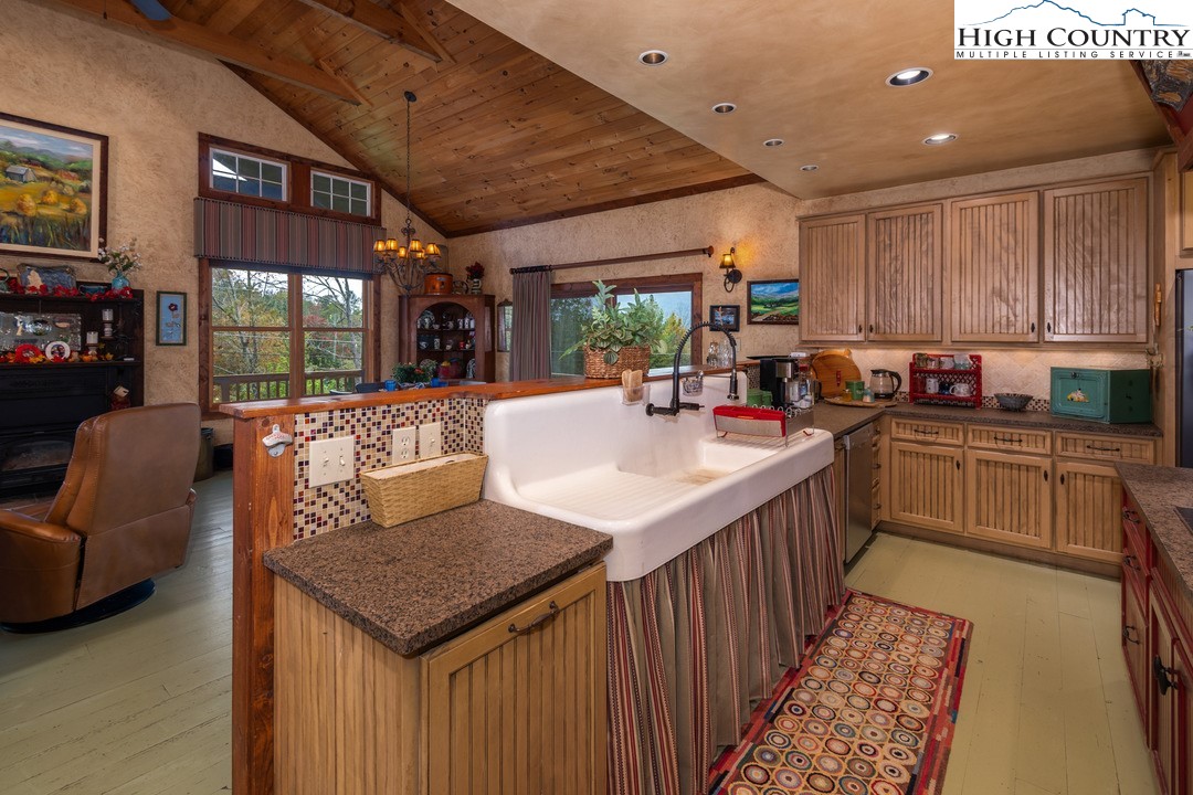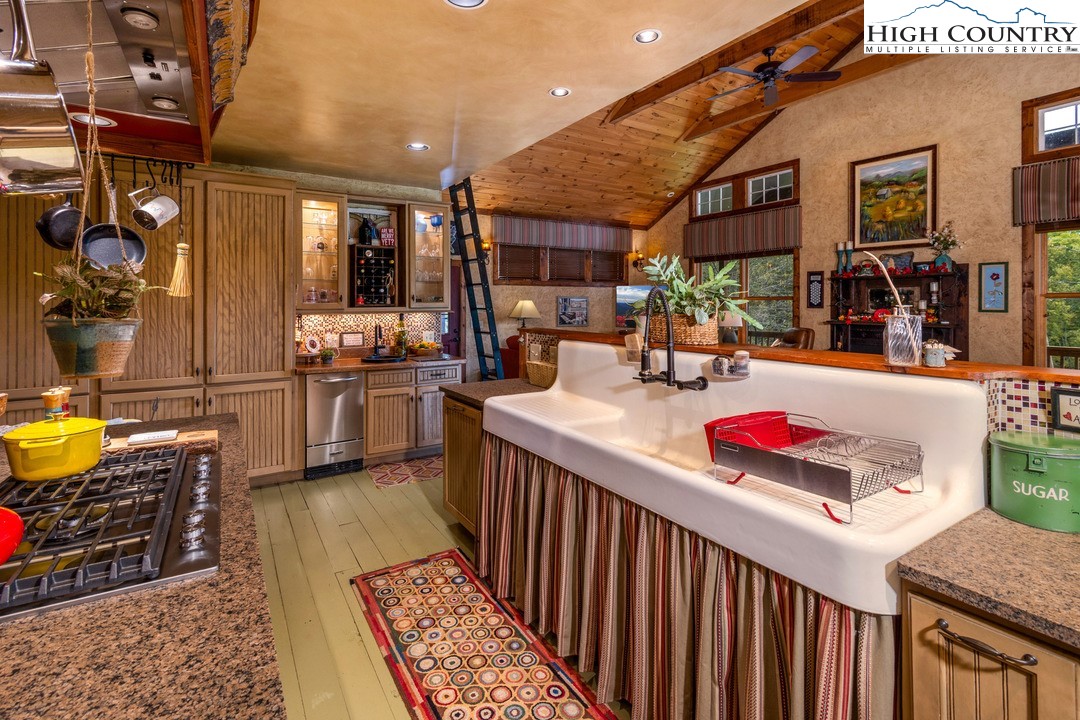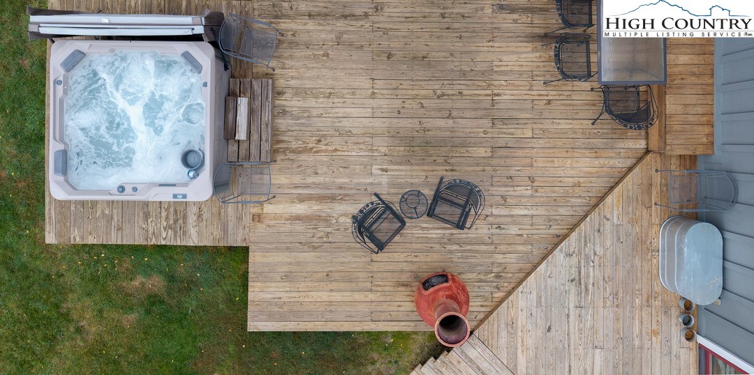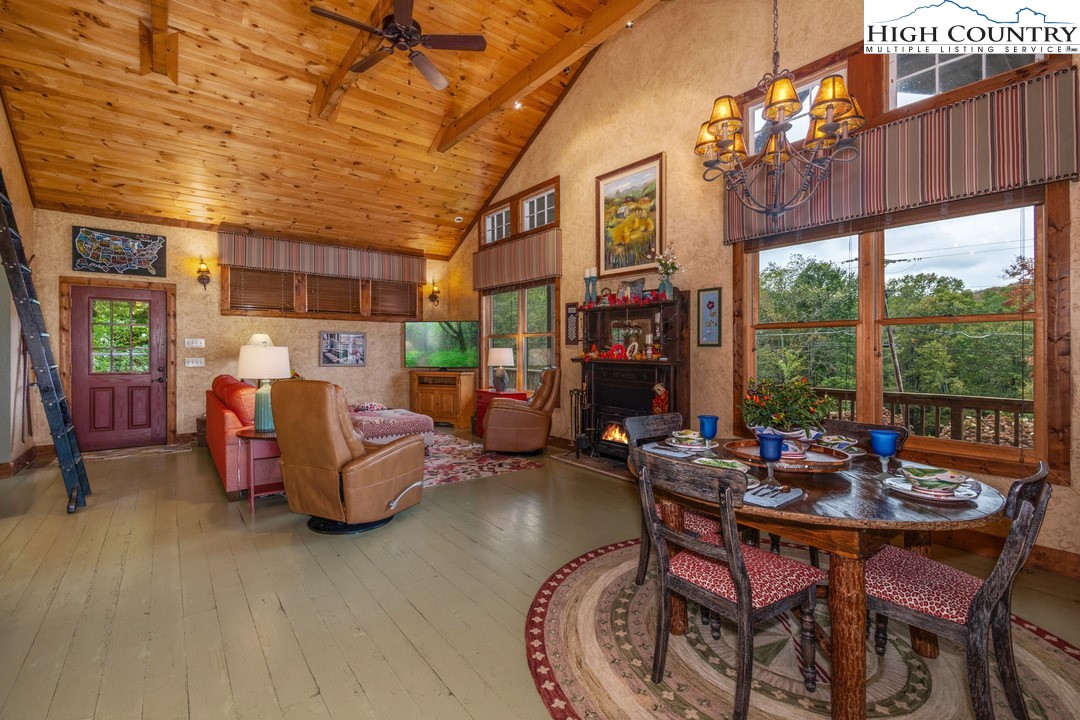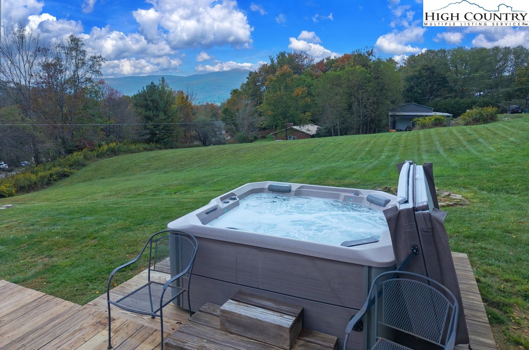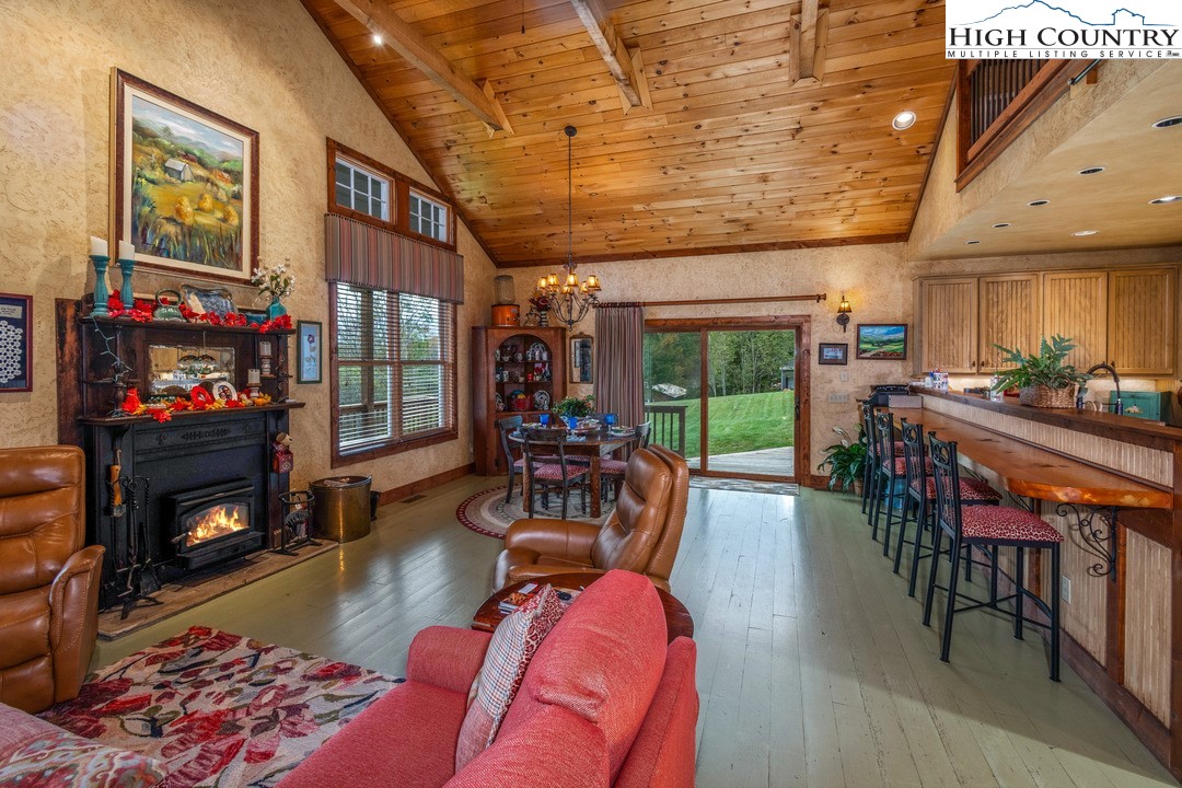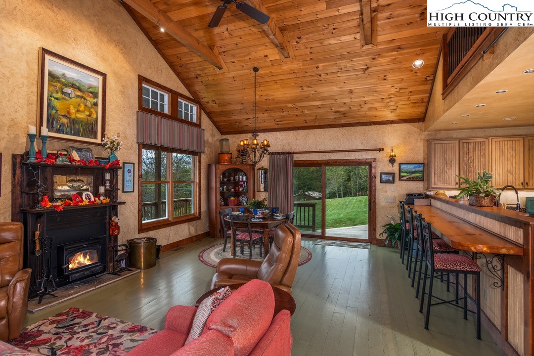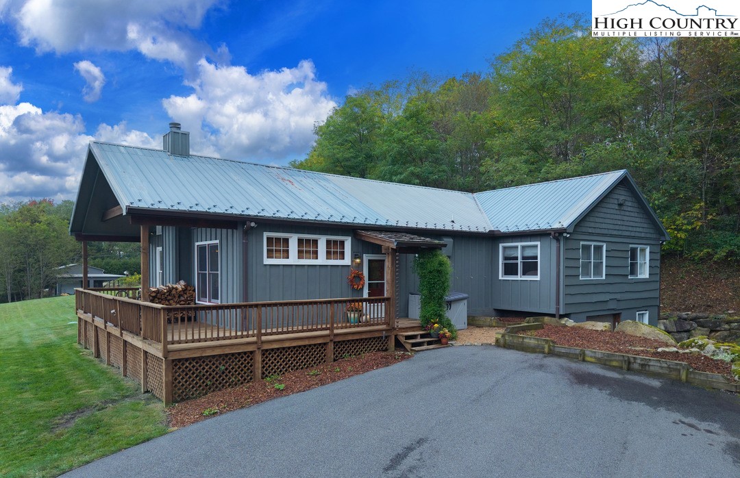 Mountain charm abounds from this stunning retreat! This home exudes rustic elegance with modern conveniences. Step inside to soaring cathedral tongue-and-groove ceilings and stunning painted hardwood floors, that frame the open-concept living area, with a touch of alpine charm. A cozy wood-burning fireplace with a stove insert invites relaxing evenings or gathering with friends and family. Oversized windows flood the room with natural light and offer serene views, enhancing the open, airy feel. Overlooking the main living area is a versatile loft that could be used as a children's retreat, office or additional storage. The heart of the home is the spacious gourmet kitchen, designed to impress even the most discerning chef. Featuring an antique farm sink, a 5-burner gas range with a commercial-grade vented hood crowned with antique molding, and granite counters, this kitchen seamlessly blends function and beauty. You'll love the large center island and the abundance of custom cabinetry offering generous storage. Double ovens make hosting a breeze, while high-end finishes throughout complete the picture. The home includes three spacious bedrooms and 2.5 baths with vaulted ceilings throughout. The primary suite includes jetted tub, step in shower, and spacious walk-in closet with dressers, shelving and built in ironing board. Also features French doors leading to an extensive wrap around deck. All bedrooms have walk in closets. The family room features striking vaulted wood ceilings with double fans and painted wood floors. An unfinished basement provides excellent storage or expansion potential and includes an oversized one-car garage. You'll enjoy beautiful Beech Mountain views from the expansive deck, complete with a relaxing hot tub for unwinding after a long day. This outdoor setting offers ample space for dining, lounging, and soaking in the serene surroundings year-round. Features not to overlook-new heat pump in August 2025, 2022 hot tub, exterior caulked and painted in 2022, underground fence installed keeping pets safe!
