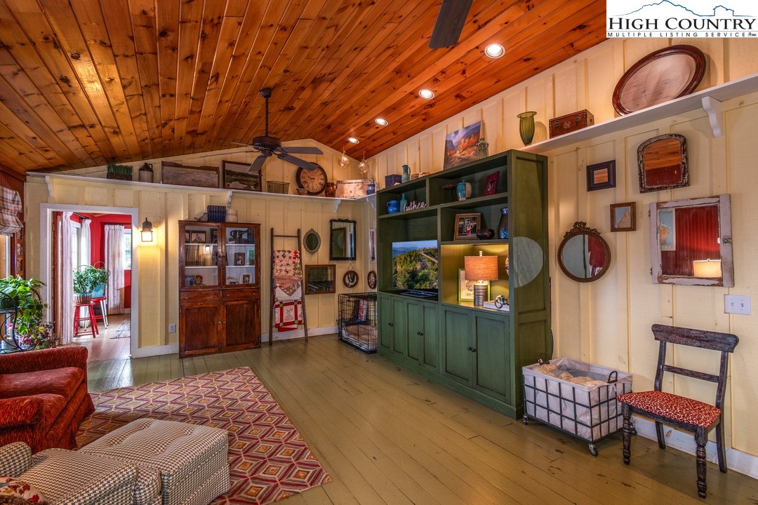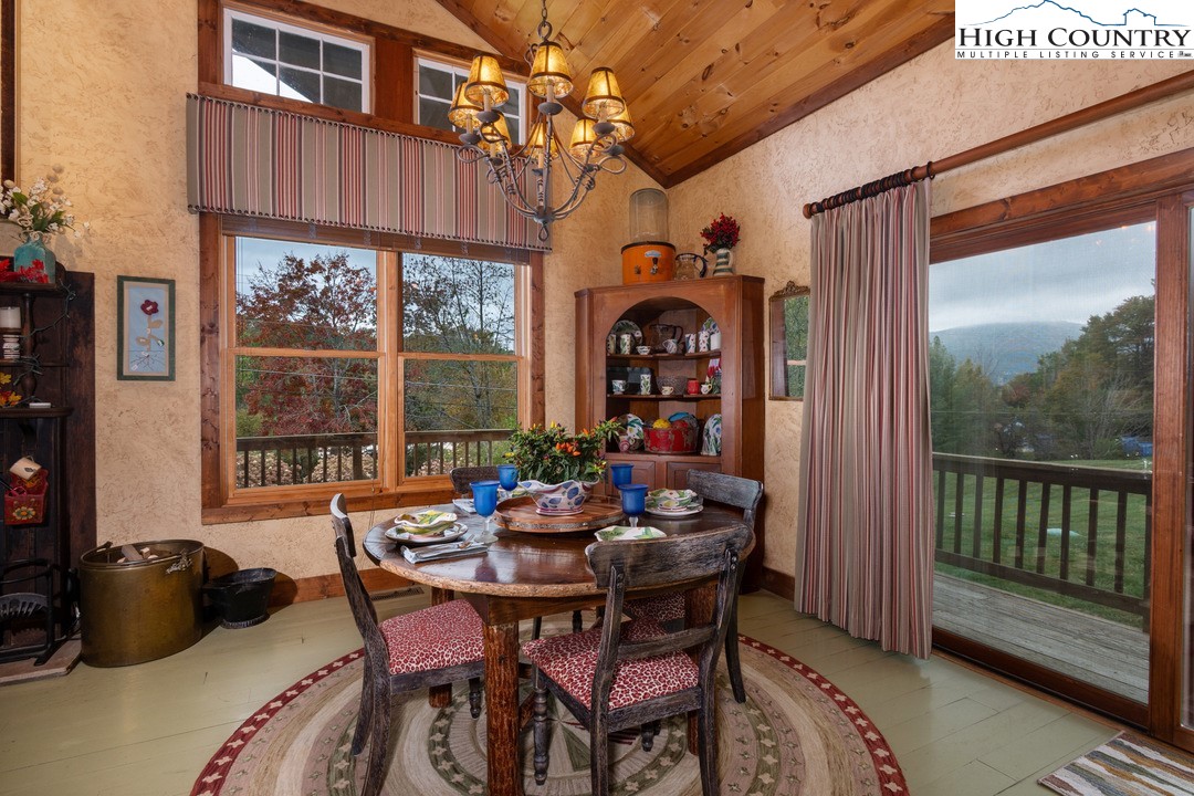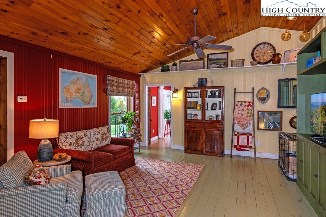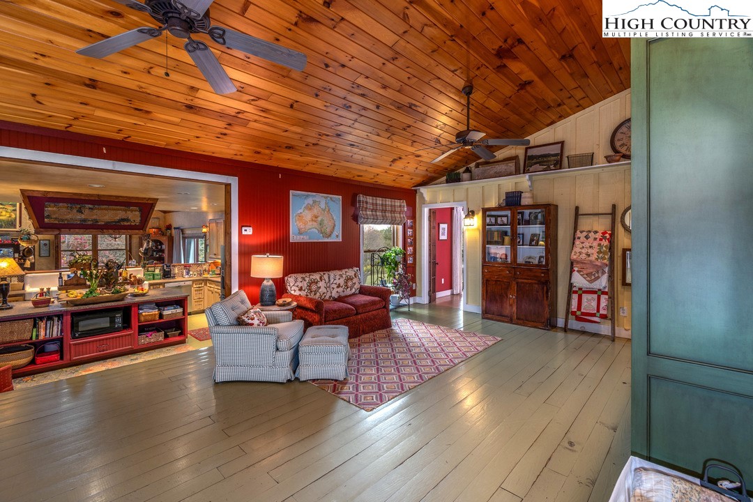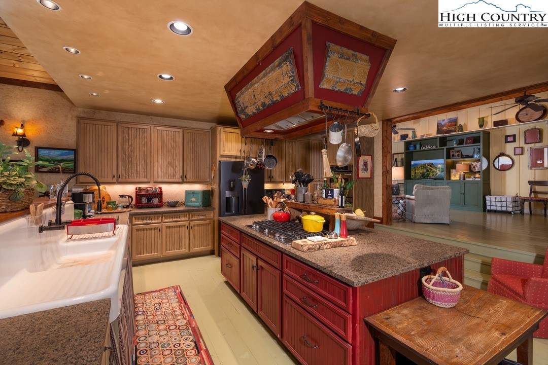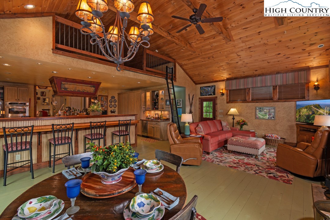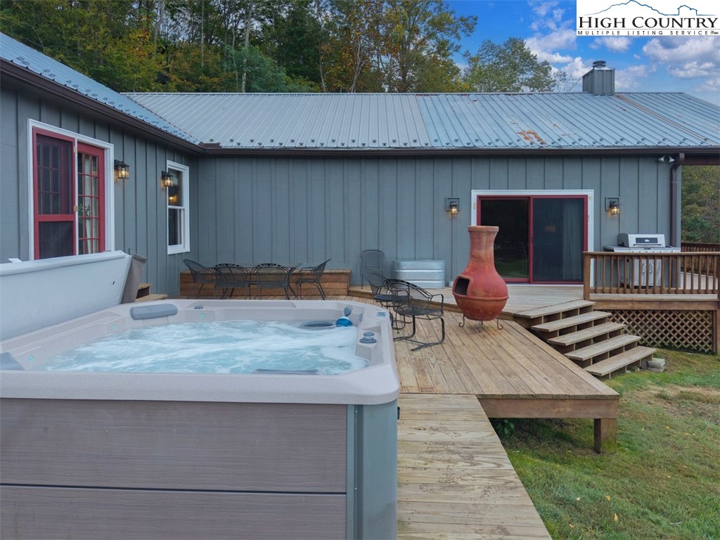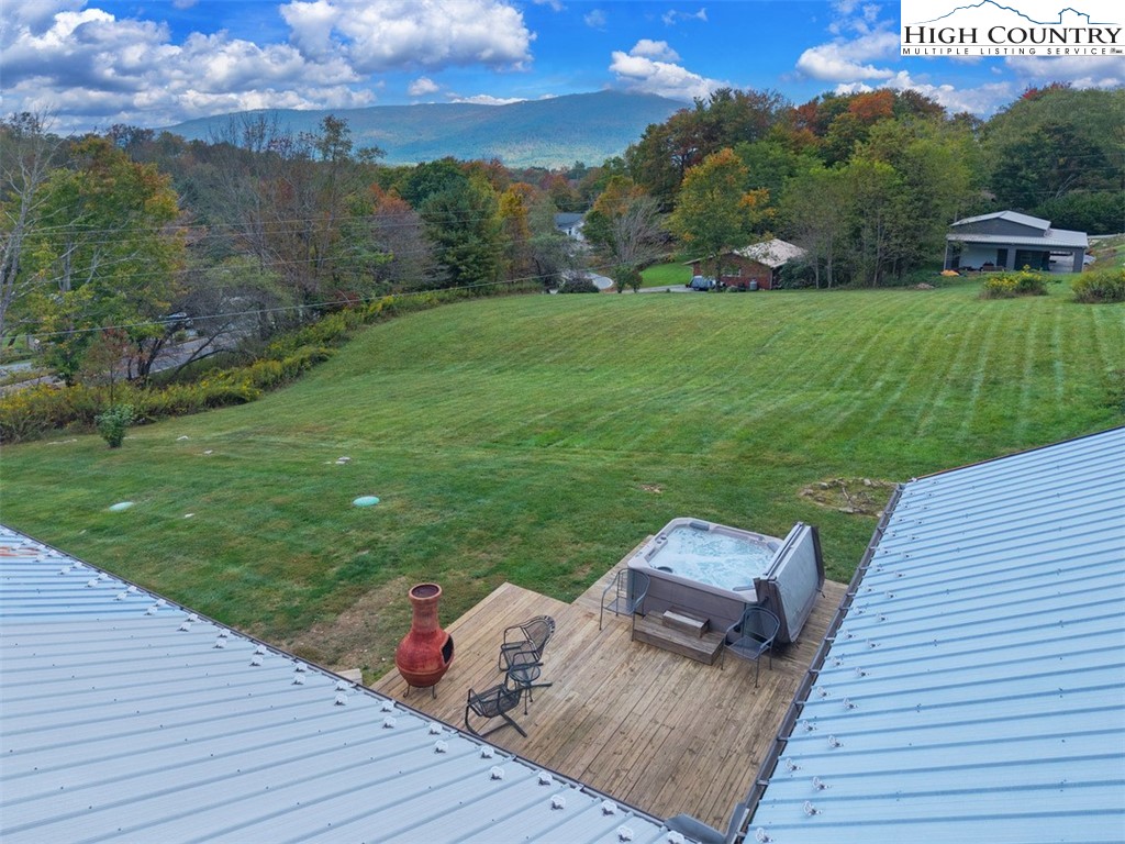 Mountain charm abounds from this stunning retreat! This home exudes rustic elegance with modern conveniences. Step inside to soaring cathedral tongue-and-groove ceilings and stunning painted hardwood floors, that frame the open-concept living area, with a touch of alpine charm. A cozy wood-burning fireplace with a stove insert invites relaxing evenings or gathering with friends and family. Oversized windows flood the room with natural light and offer serene views, enhancing the open, airy feel. Overlooking the main living area is a versatile loft that could be used as a children's retreat, office or additional storage. The heart of the home is the spacious gourmet kitchen, designed to impress even the most discerning chef. Featuring an antique farm sink, a 5-burner gas range with a commercial-grade vented hood crowned with antique molding, and granite counters, this kitchen seamlessly blends function and beauty. You'll love the large center island and the abundance of custom cabinetry offering generous storage. Double ovens make hosting a breeze, while high-end finishes throughout complete the picture. The home includes three spacious bedrooms and 2.5 baths with vaulted ceilings throughout. The primary suite includes jetted tub, step in shower, and spacious walk-in closet with dressers, shelving and built in ironing board. Also features French doors leading to an extensive wrap around deck. All bedrooms have walk in closets. The family room features striking vaulted wood ceilings with double fans and painted wood floors. An unfinished basement provides excellent storage or expansion potential and includes an oversized one-car garage. You'll enjoy beautiful Beech Mountain views from the expansive deck, complete with a relaxing hot tub for unwinding after a long day. This outdoor setting offers ample space for dining, lounging, and soaking in the serene surroundings year-round. Features not to overlook-new heat pump in August 2025, 2022 hot tub, exterior caulked and painted in 2022, underground fence installed keeping pets safe!