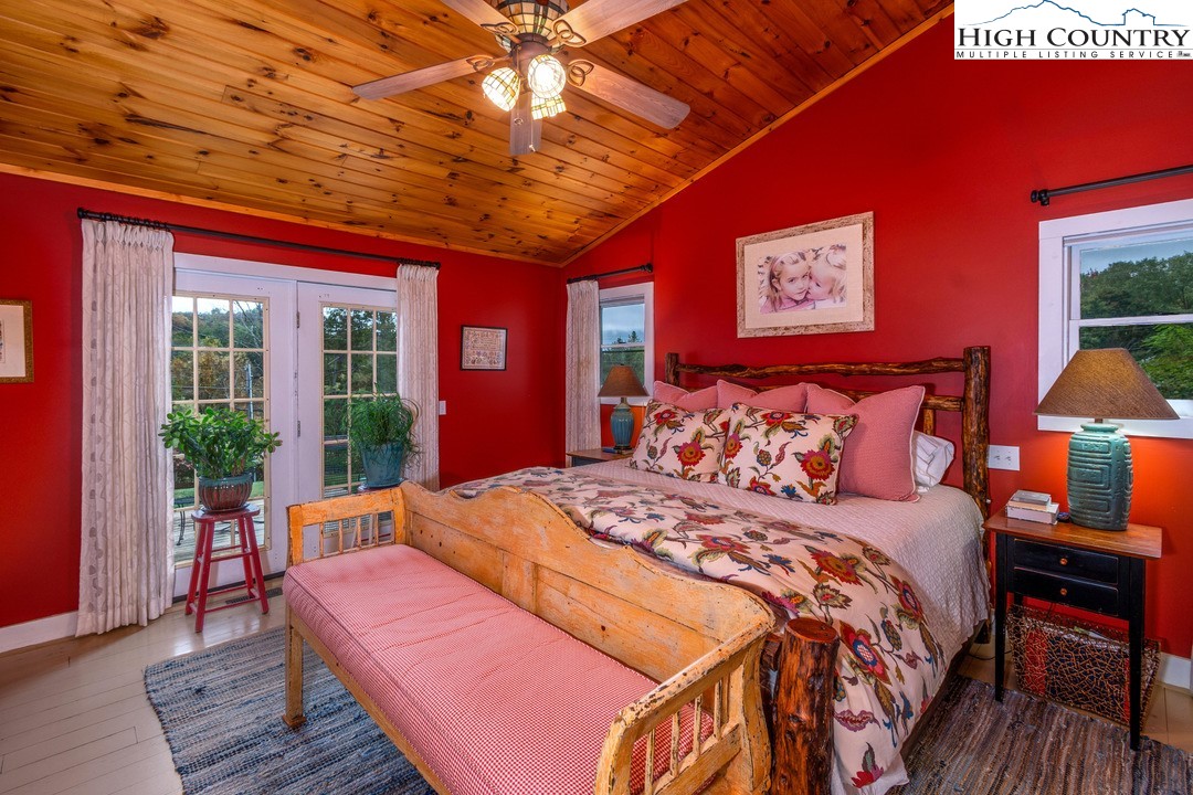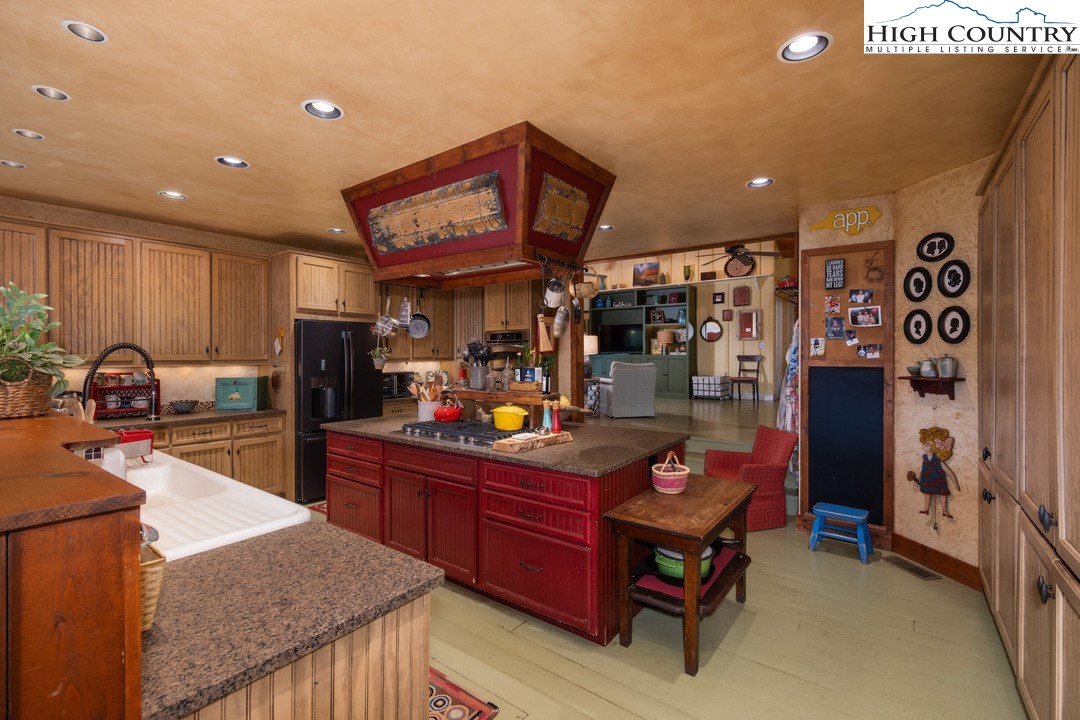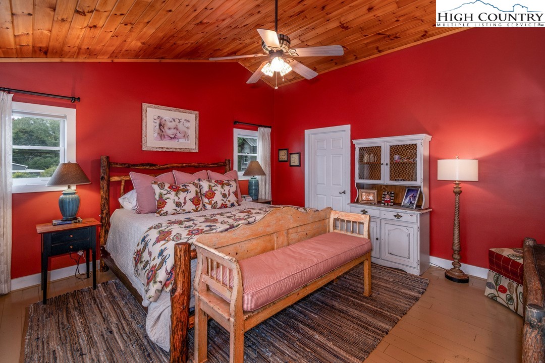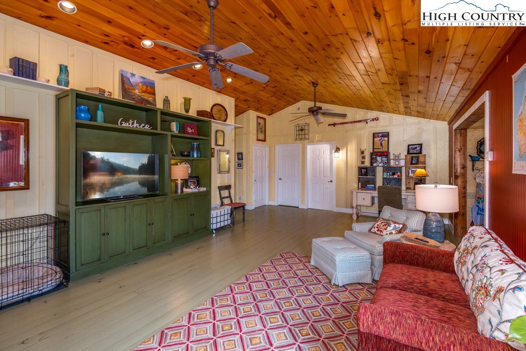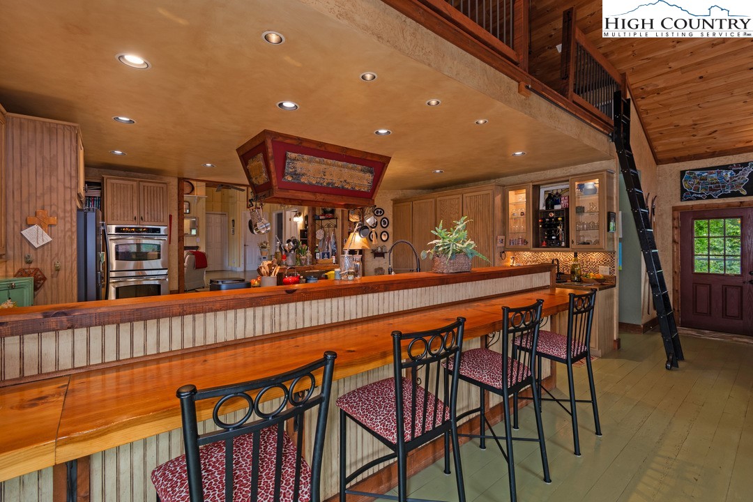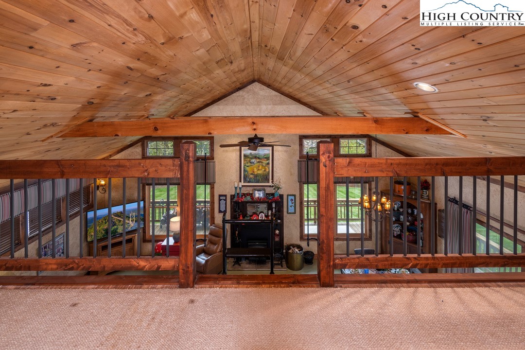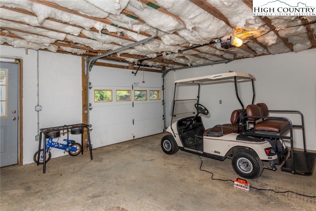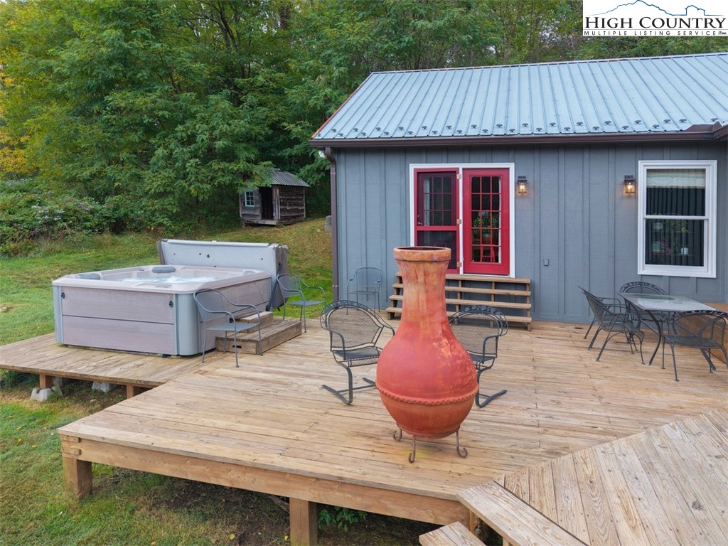Mountain charm abounds from this stunning retreat! This home exudes rustic elegance with modern conveniences. Step inside to soaring cathedral tongue-and-groove ceilings and stunning painted hardwood floors, that frame the open-concept living area, with a touch of alpine charm. A cozy wood-burning fireplace with a stove insert invites relaxing evenings or gathering with friends and family. Oversized windows flood the room with natural light and offer serene views, enhancing the open, airy feel. Overlooking the main living area is a versatile loft that could be used as a children's retreat, office or additional storage. The heart of the home is the spacious gourmet kitchen, designed to impress even the most discerning chef. Featuring an antique farm sink, a 5-burner gas range with a commercial-grade vented hood crowned with antique molding, and granite counters, this kitchen seamlessly blends function and beauty. You'll love the large center island and the abundance of custom cabinetry offering generous storage. Double ovens make hosting a breeze, while high-end finishes throughout complete the picture. The home includes three spacious bedrooms and 2.5 baths with vaulted ceilings throughout. The primary suite includes jetted tub, step in shower, and spacious walk-in closet with dressers, shelving and built in ironing board. Also features French doors leading to an extensive wrap around deck. All bedrooms have walk in closets. The family room features striking vaulted wood ceilings with double fans and painted wood floors. An unfinished basement provides excellent storage or expansion potential and includes an oversized one-car garage. You'll enjoy beautiful Beech Mountain views from the expansive deck, complete with a relaxing hot tub for unwinding after a long day. This outdoor setting offers ample space for dining, lounging, and soaking in the serene surroundings year-round. Features not to overlook-new heat pump in August 2025, 2022 hot tub, exterior caulked and painted in 2022, underground fence installed keeping pets safe!