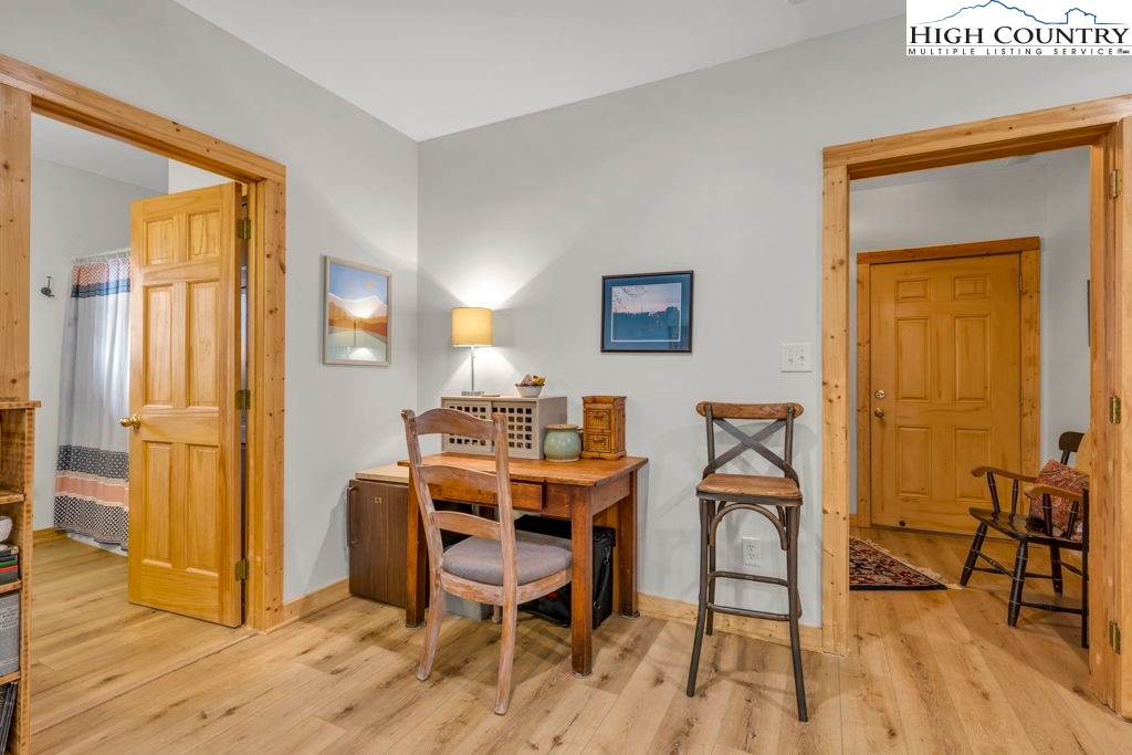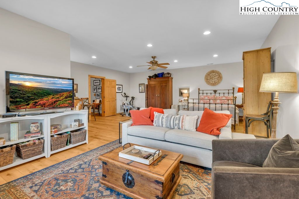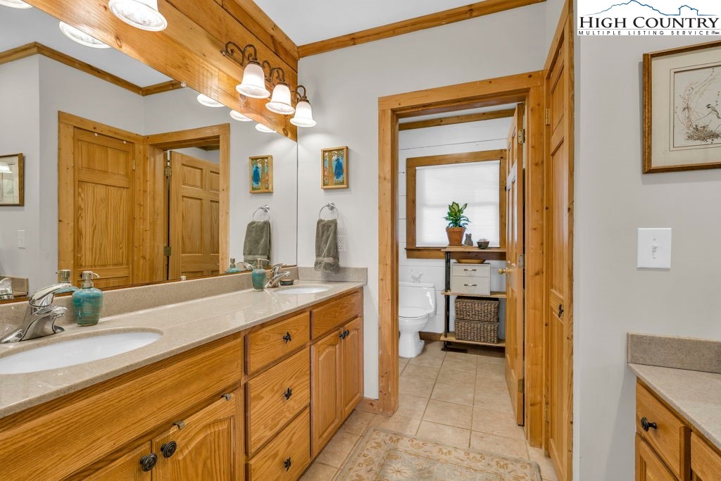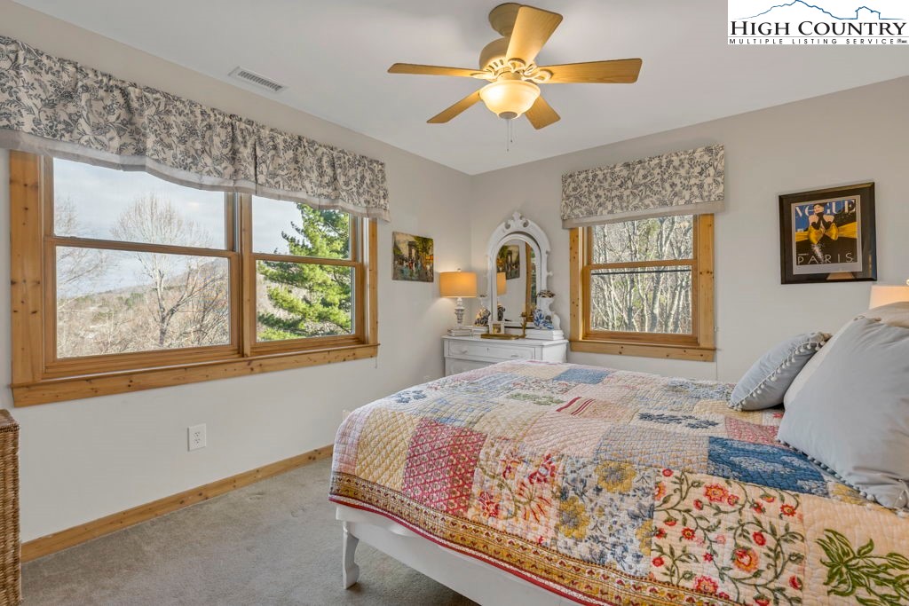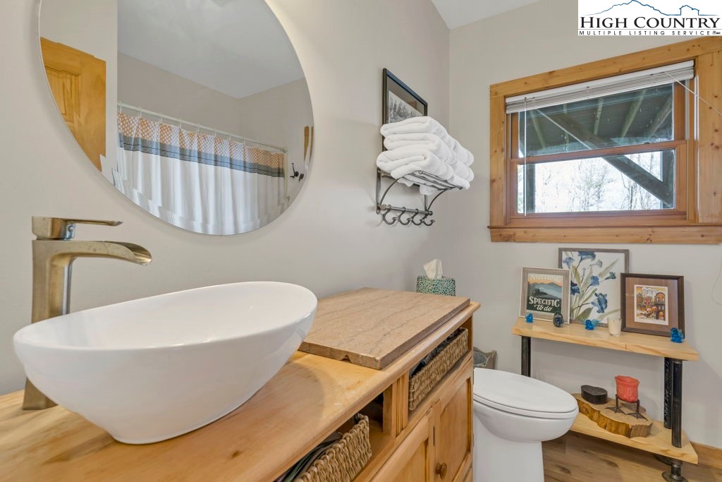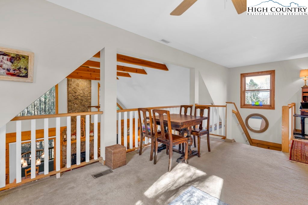 What a find is this three-bedroom, 3.5 bath log home that expertly marries rustic and modern elements creating a warm, elevated, and dynamic home. Though located in close proximity to Appalachian State University and within Kalmia Acres, this home enjoys a private mountain setting with Beech Mountain views, coupled with easy access to all things Boone. How great is that? At the entrance to the home, soaring exposed beams, a floor-to-ceiling stone wood-burning fireplace, and rich hardwood flooring welcome you. The great room is striking yet warm, filled with natural light. The kitchen was thoughtfully updated in 2017 with concrete countertops, a new sink, lighting, and GE appliances. The comfortable and spacious main-level primary suite offers private access to the covered deck and is roomy enough for a reading nook and large furniture. Also on the main level is a convenient half bath and laundry closet. Upstairs, you’ll appreciate a loft that functions perfectly as a second living space, office, and game area, along with two additional bedrooms and a full bath. The lowest level provides over 800 square feet of highly functional, flexible space that the sellers have thoughtfully updated. A third full bath is on this floor, and the balance of space is currently used as extra sleeping space, a den, and a workout area. The possibilities are many. You’ll love the expansive wrap-around TREX deck with over 1,200 square feet of covered and open space accessed right from the main level. It’s the perfect spot to enjoy the mountain views, watch the clouds roll in, or relax with a good book, with plenty of room for family and friends to spread out. The oversized two-car garage provides excellent additional utility space with a built-in mud sink for convenience and storage. The sellers have kept this home in excellent shape with thoughtful recent updates including freshly resealed logs and fresh interior paint. If you’re looking for that perfect blend of mountain character and modern comfort in a location that can’t be beat, you've found it.