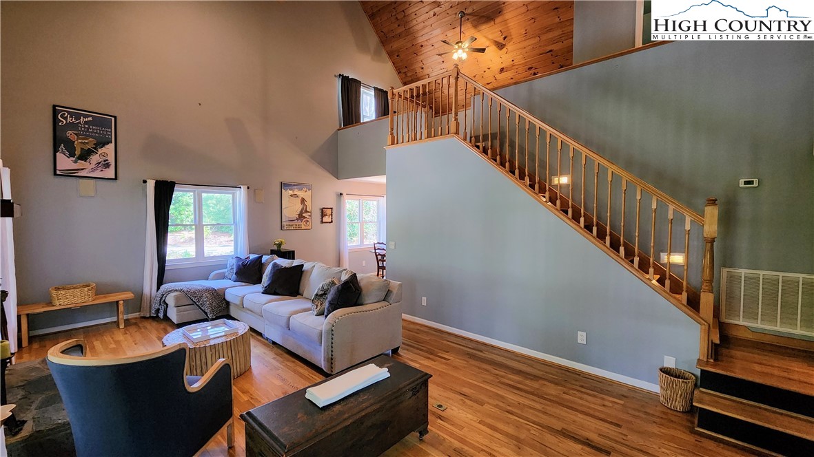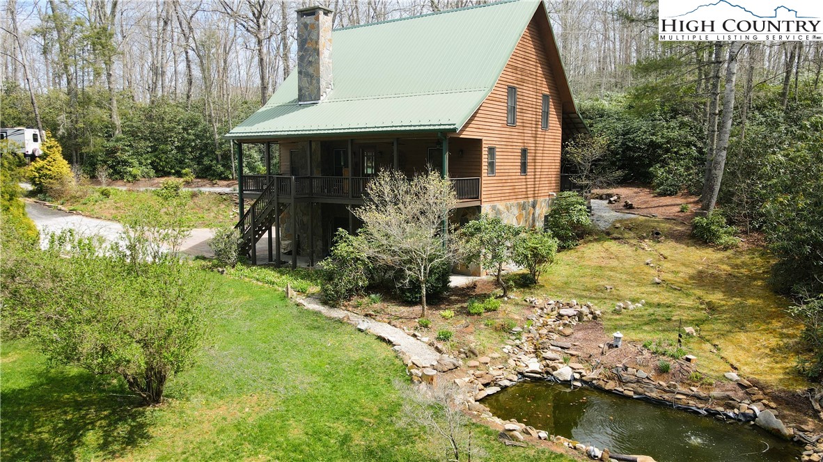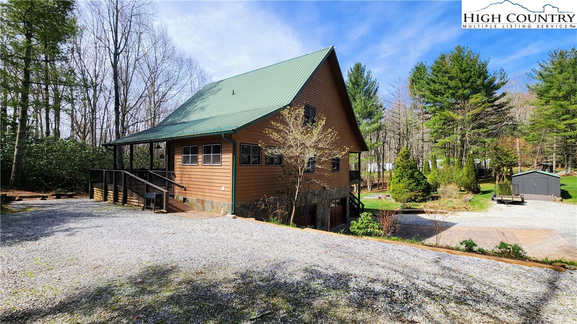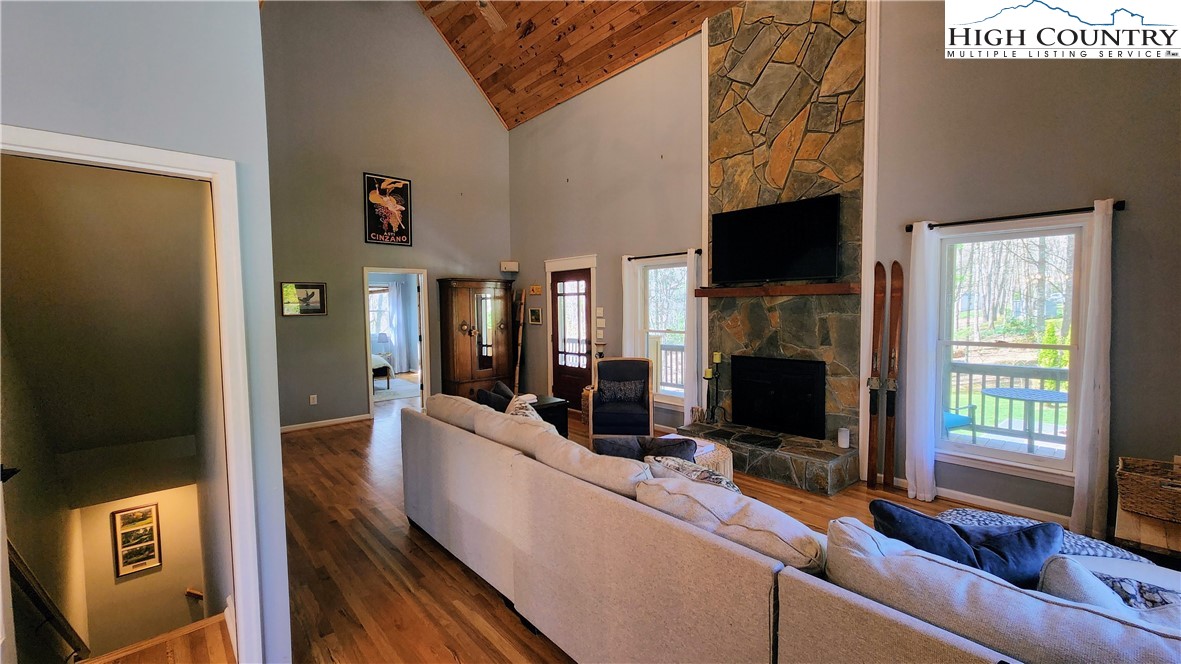 No HOA, No covenants, No restrictions. This beautifully maintained home offers the rare combination of usable acreage and a convenient location. With level entry, expansive outdoor living spaces, and a thoughtfully designed layout, this property is ideal for both full time living and a mountain retreat. The main level features an open living area centered around a stunning stone fireplace, flowing seamlessly into a well appointed kitchen with custom cherry cabinetry, high end appliances, a butlers pantry, under cabinet refrigerator, and wine cooler. Hardwood floors run throughout the main living spaces, adding warmth and character. The home offers two primary suites, one on the main level and one on the lower level, both with private baths featuring heated floors, tiled showers, heated towel racks, and upgraded finishes. The main level suite also includes a free-standing tub, double vanities with granite counters, and a spacious walk in closet. The upper level overlooks the living room and provides flexible space for an office, guest bedroom, bonus room, and full bath. The recently remodeled lower level adds even more functional living space, perfect for guests, entertaining, or a private retreat. Outdoor living is where this property truly shines, with two covered porches, a lower level patio, large usable yard, fire pit, and pond. The property also includes a two car garage with custom cedar doors, a storage shed, and an additional RV site with power and water hookups. A rare opportunity to own a home with usable land, modern updates, and close proximity to everything Linville and the High Country have to offer.