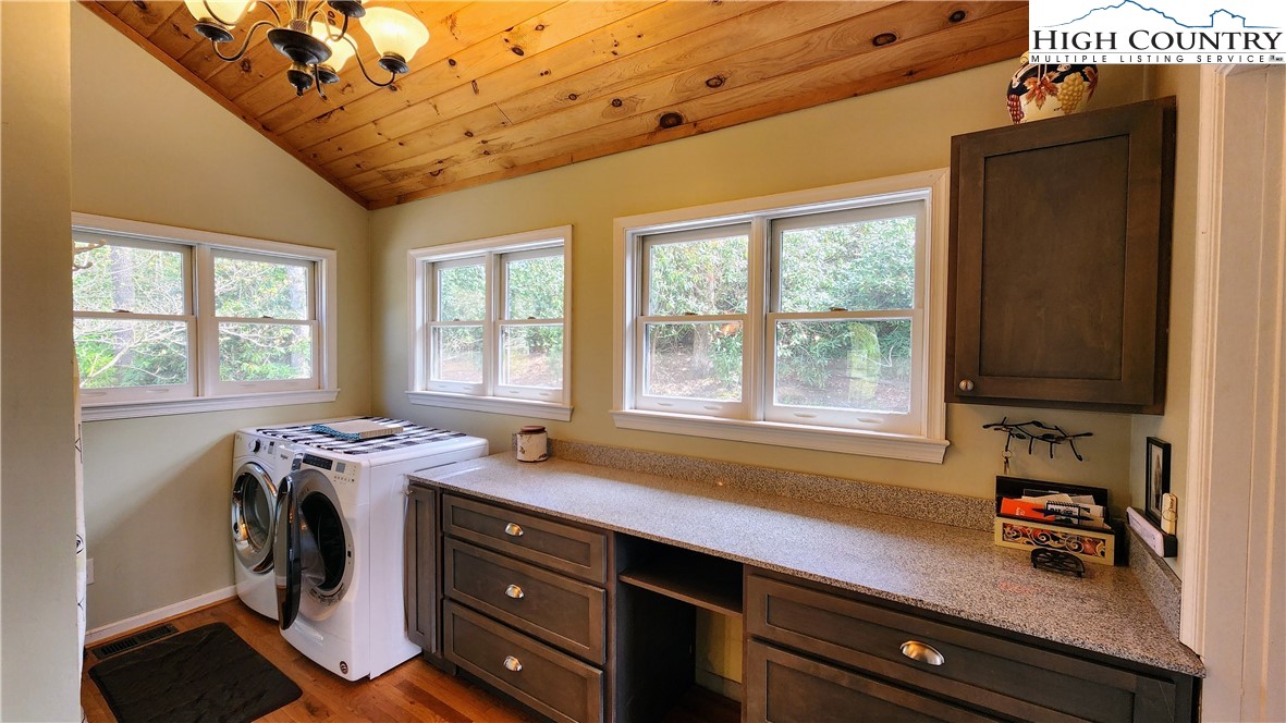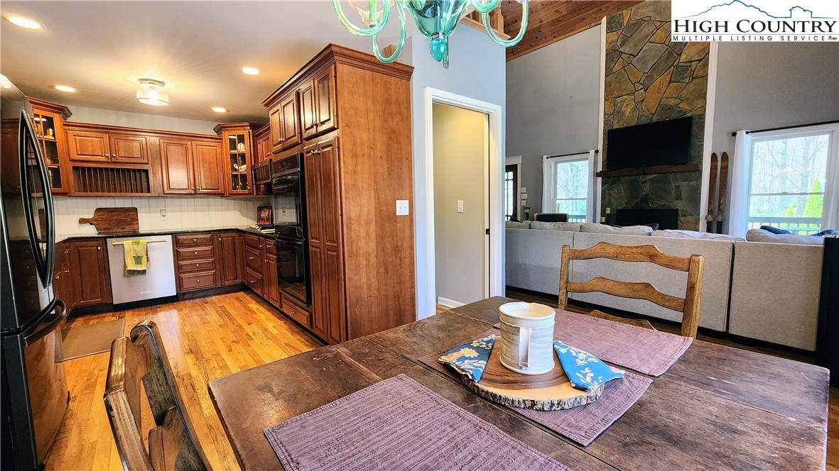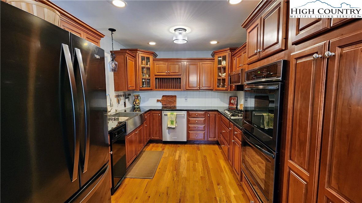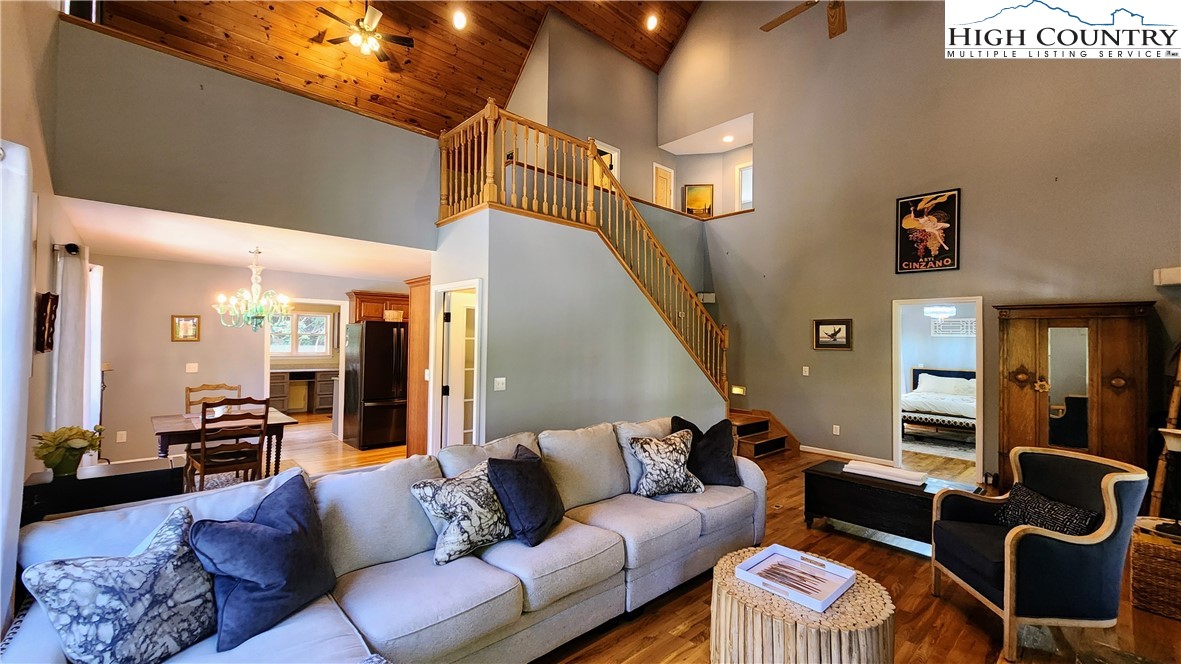 No HOA, No covenants, No restrictions. This beautifully maintained home offers the rare combination of usable acreage and a convenient location. With level entry, expansive outdoor living spaces, and a thoughtfully designed layout, this property is ideal for both full time living and a mountain retreat. The main level features an open living area centered around a stunning stone fireplace, flowing seamlessly into a well appointed kitchen with custom cherry cabinetry, high end appliances, a butlers pantry, under cabinet refrigerator, and wine cooler. Hardwood floors run throughout the main living spaces, adding warmth and character. The home offers two primary suites, one on the main level and one on the lower level, both with private baths featuring heated floors, tiled showers, heated towel racks, and upgraded finishes. The main level suite also includes a free-standing tub, double vanities with granite counters, and a spacious walk in closet. The upper level overlooks the living room and provides flexible space for an office, guest bedroom, bonus room, and full bath. The recently remodeled lower level adds even more functional living space, perfect for guests, entertaining, or a private retreat. Outdoor living is where this property truly shines, with two covered porches, a lower level patio, large usable yard, fire pit, and pond. The property also includes a two car garage with custom cedar doors, a storage shed, and an additional RV site with power and water hookups. A rare opportunity to own a home with usable land, modern updates, and close proximity to everything Linville and the High Country have to offer.