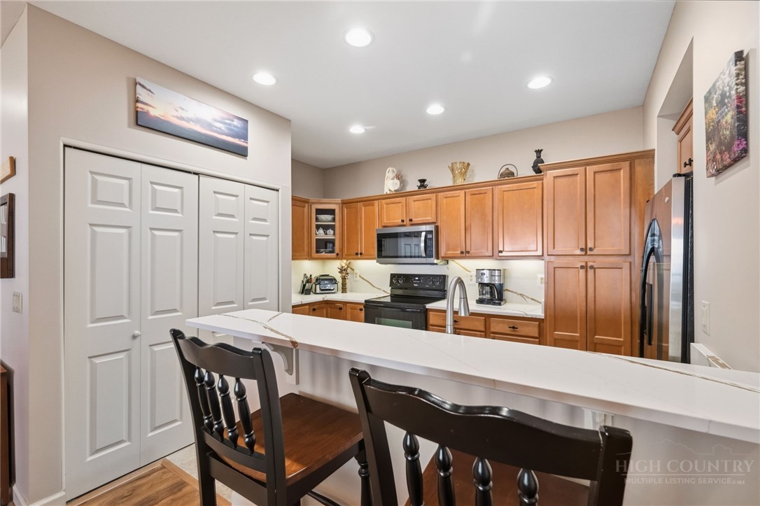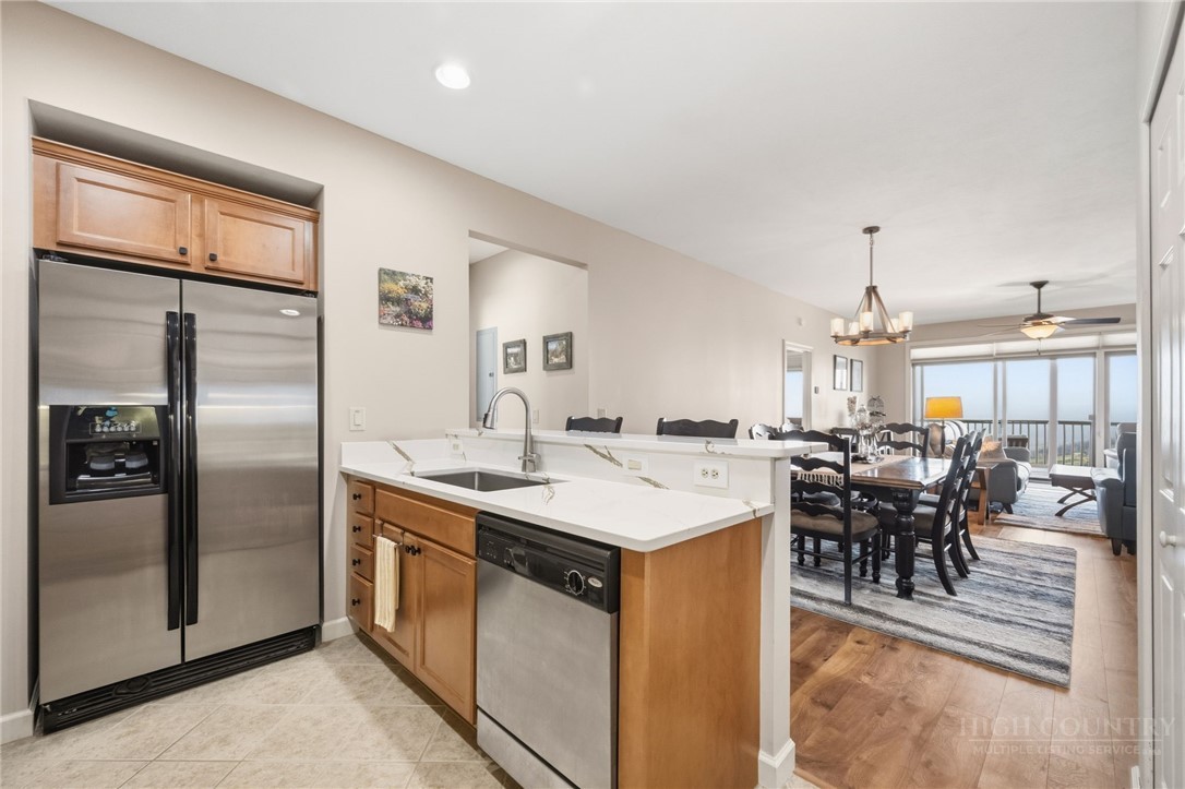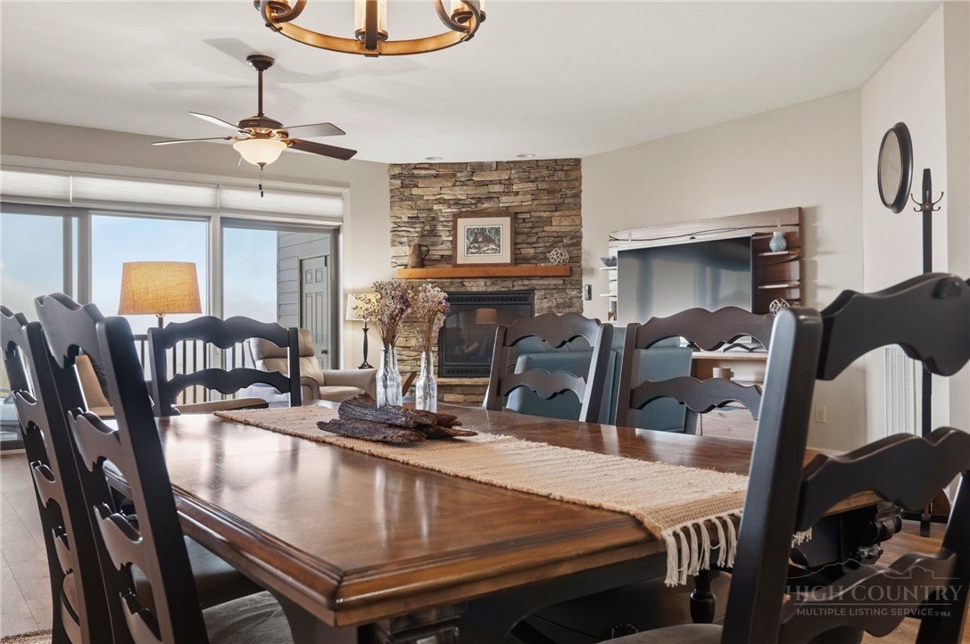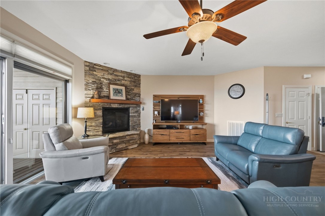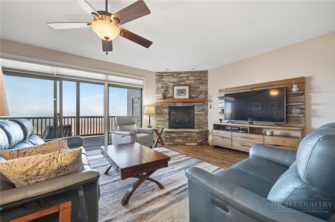 Escape to Cool Summers, Mountain Winters, Unbeatable Views! This turnkey 2BR/2BA luxury condo at the highly sought-after Reserve at Sugar Mountain delivers the mountain lifestyle you've been dreaming about. Perched at a refreshing 5,100' with sweeping westerly views, this beautifully updated unit features an open-concept layout, stacked stone gas fireplace, quartz kitchen countertops, new Pergo flooring, Hunter Douglas window treatments and a spacious primary suite with deep soaking tub and shower. Recent upgrades include a 2024 HVAC system, 2026 water heater, and new stacking LG washer/dryer. Step outside to a stunning 1,300 sq ft covered deck with teak furniture — your front-row seat to mountain sunsets year-round. A gentle grass-and-stone path from the road makes arrival effortless, and the pet-friendly, walkable community is beautiful professionally managed landscaped. Grocery stores, restaurants, and shopping are all within 10 minutes via wide, well-maintained roads that make mountain driving comfortable and stress-free. Added bonus, wiithin 30 minutes: Banner Elk, Blowing Rock, Boone, and Grandfather Mountain for dining, shopping, and entertainment of every kind. On the mountain itself: skiing, ice skating, public golf course, free tennis, and pickleball. This cherished unit has never been rented but short-term rentals are allowed — live it, love it, or invest and sleep with the windows open.