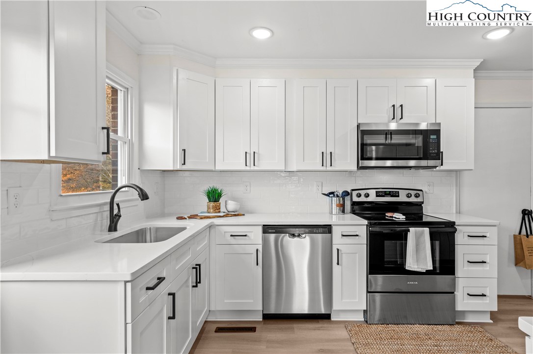 This beautifully renovated home offers 3 bedrooms and 2 baths. It features stunning wood floors, designer inspired SW Alabaster paint, new carpet and a completely remodeled kitchen with granite countertops & new stainless steel appliances. The floorplan offers a formal dining room, living room and a den featuring a wood burning fireplace and built-ins. The primary suite boasts an ensuite bath with a tile walk-in shower and new vanity with black hardware. The hall bath has also been nicely updated with a stylish vanity and designer finishes. Outside, you'll benefit from a new deck, new vinyl replacement windows, new septic tank, and a recent roof. Just steps away you will love the oversized detached garage great for car enthusiasts or anyone looking for a workshop space. The location is near dining, shopping and highways. Hurry this won't last long.