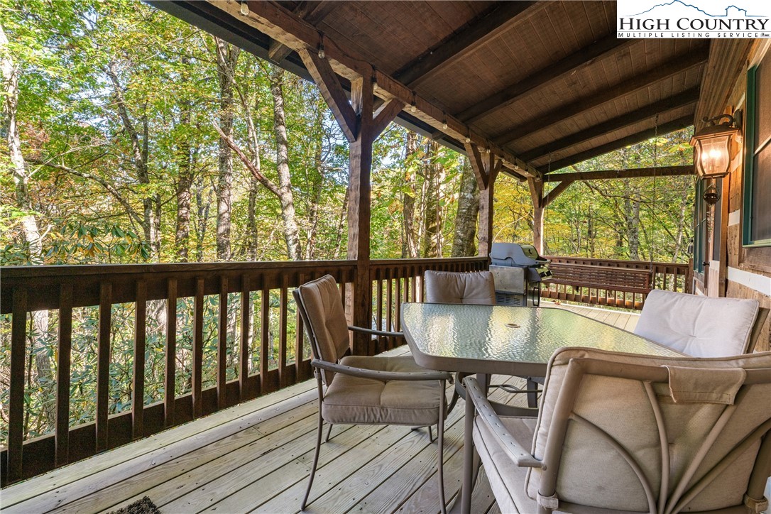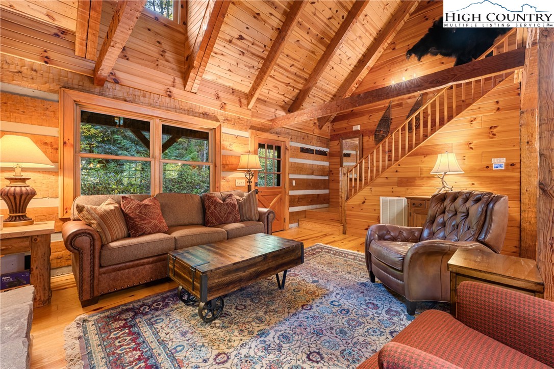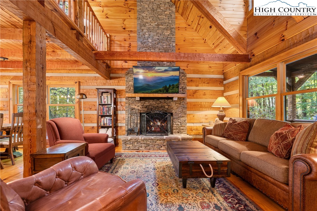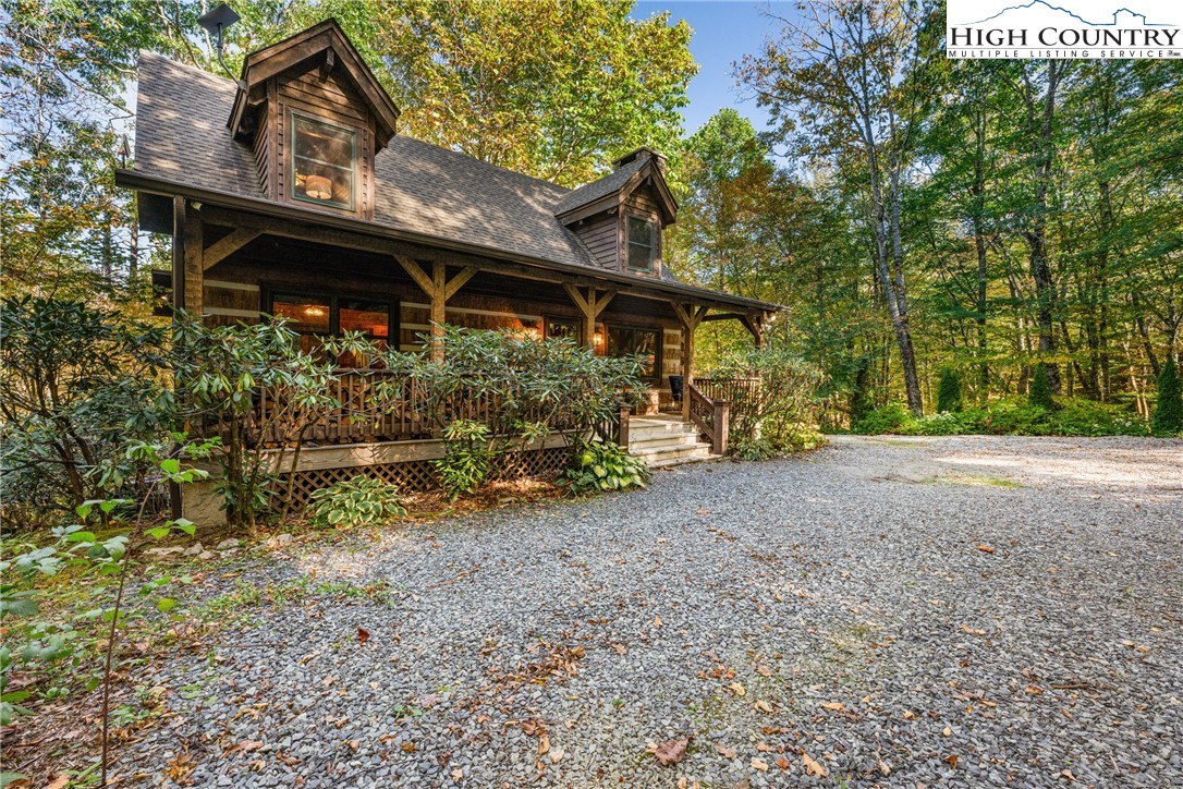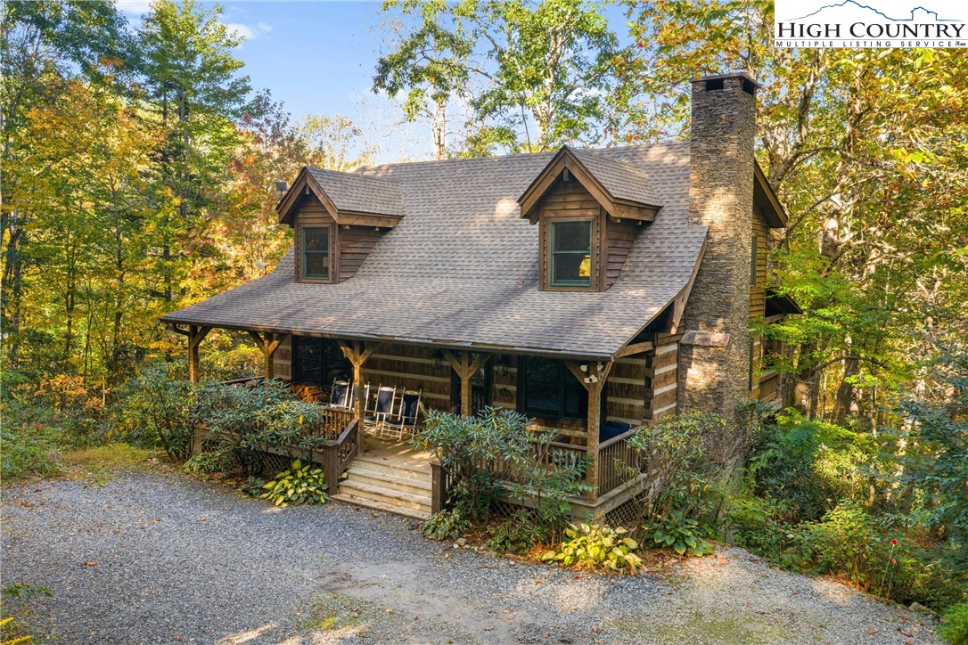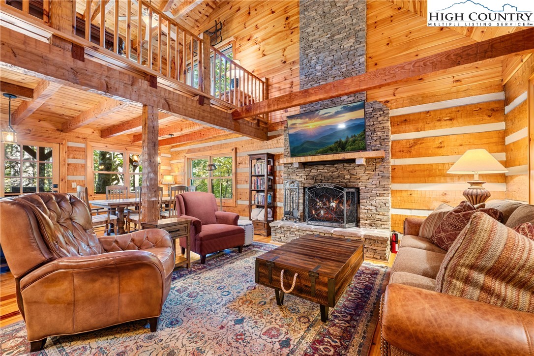 If you have been searching for a dreamy log cabin in the Blue Ridge Mountains, look no further! Nestled among the trees in the peaceful community of Lost Creek, located between Blowing Rock and Linville. This secluded yet easily accessible gated community is just an 18 minute gorgeous drive (mostly via the Blue Ridge Parkway if you desire) from Blowing Rock and 10 minutes to Grandfather Mountain, and provides privacy and serenity and close proximity to world class hiking, climbing, mountain biking, and all the other outdoor adventures offered by the Pisgah National Forest and the NC High Country. This idyllic mountain cabin features 2 bedrooms and 2 baths with an open floor plan featuring vaulted ceilings and a stunning floor to ceiling stacked stone wood burning fireplace, setting the scene for magical evenings by the fire. Step outside to enjoy the soothing sounds of a nearby creek or unwind in the hot tub while soaking in breathtaking natural scenery that surrounds you. The main level hosts a spacious bedroom with an ensuite bath, walk-in shower, and a luxurious soaking tub, ideal for relaxation after a day of adventure. Upstairs you will find a large versatile loft with expansive picture windows, currently set up as a game room and also featuring a queen bed for bonus overnight guests. The beautiful 2nd bedroom offers soaring vaulted ceilings and a gorgeous en suite bathroom. Meticulously maintained, the cabin features an updated roof, kitchen, bathrooms, HVAC, and appliances (2019-2021). Being offered fully furnished minus dishes, kitchenware, towels, linens, and the leather chair, this nearly turn-key property would be wonderful as a vacation home and is in a neighborhood that allows short term rentals, it could make for an excellent rental investment opportunity. Discover your mountain getaway where outdoor adventure and tranquil relaxation seamlessly combine for the mountain lifestyle you have been dreaming of.