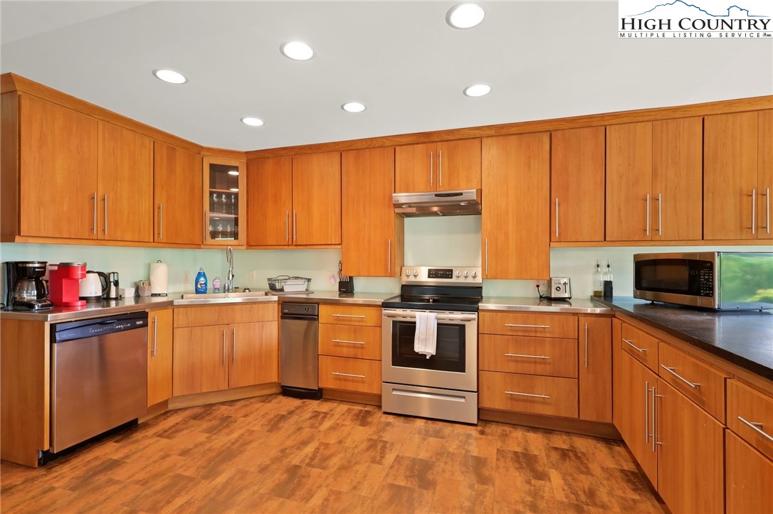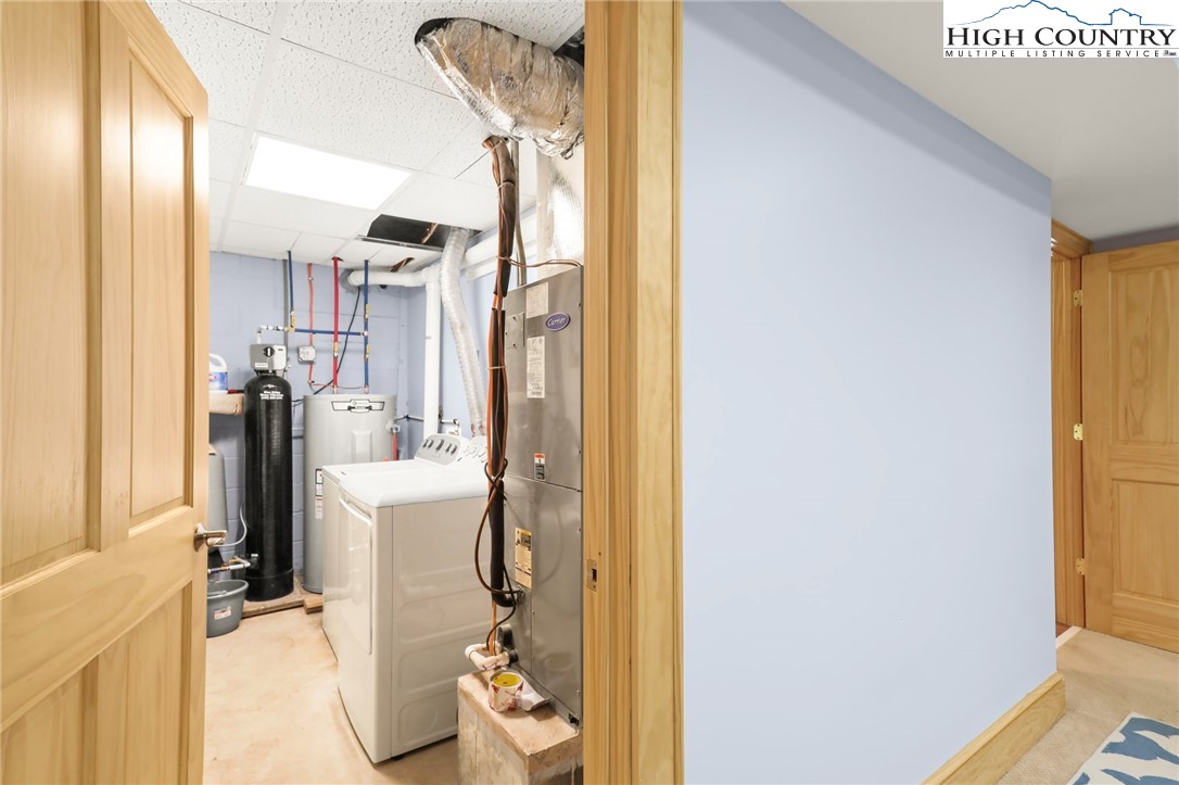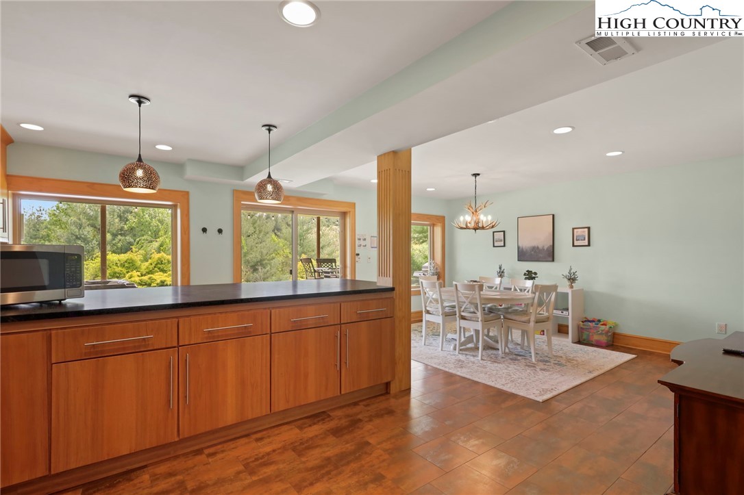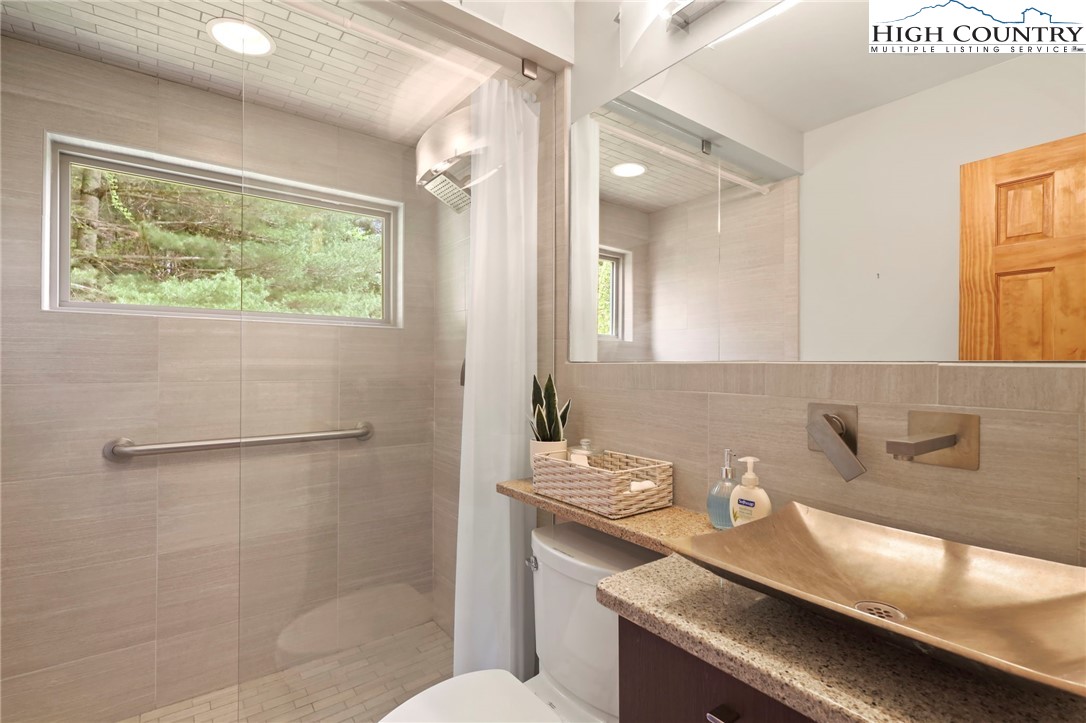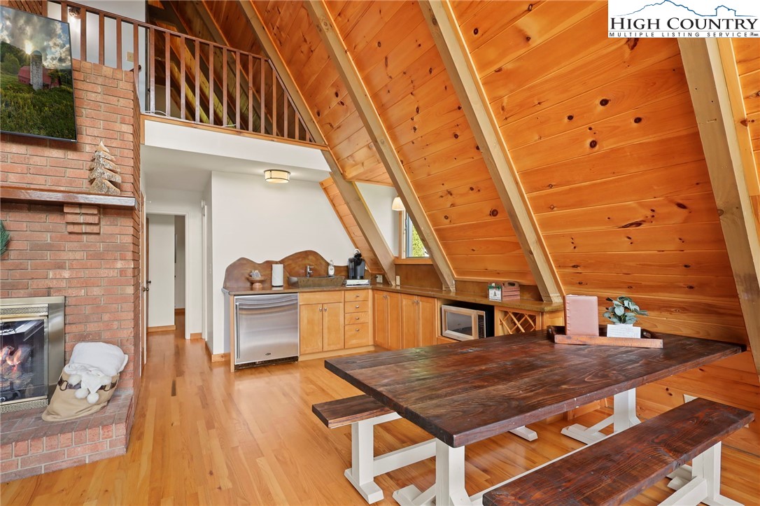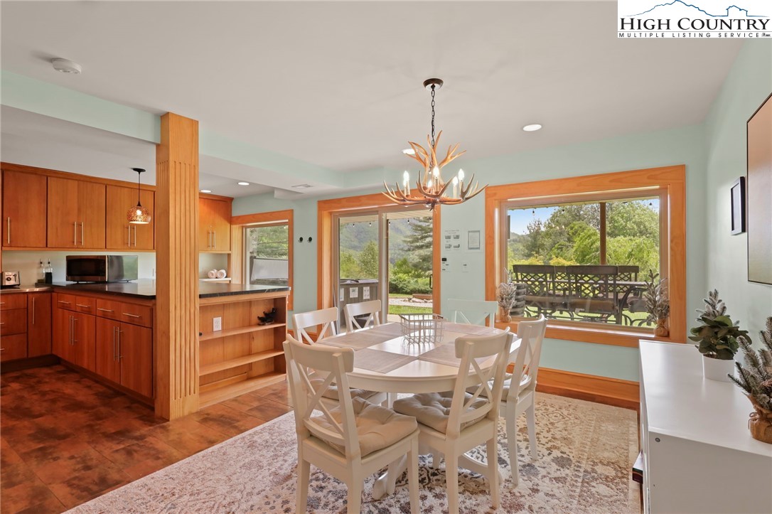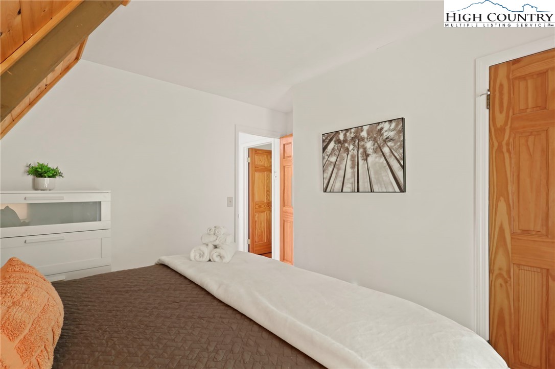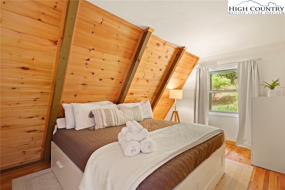 MUST SEE A-Frame Mountain Retreat! This sweet 3-bedroom, 2-bath Mountain house is move in ready, fully furnished and adjoins over 50 acres NC State Park Land and beautiful protected view of The Little Peak Mountain, also owned by the state and part of the New River State Park. Just a stone's throw to the New River and seasonal views of the river are yours to enjoy. Nicely maintained landscaping on just over an acre offers plenty of flat area of enjoy outdoor activities. The main level offers an open great room with gas log fireplace, two bedrooms, fully updated bath, and updated kitchen efficiency with concrete counter-tops, bar refrigerator, sink, and microwave. The loft level, which was used as a third bedroom, offers additional sleeping space. The lower level has an updated full kitchen with granite and stainless steel counter-tops, large island, tons of cabinet storage, open living/dining space, a full updated bath, bonus room with additional storage, and utility/laundry room. Great weekend get-way, vacation rental, or full time home.