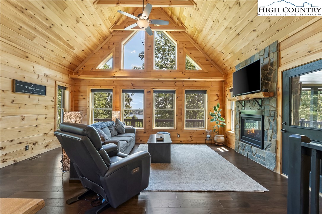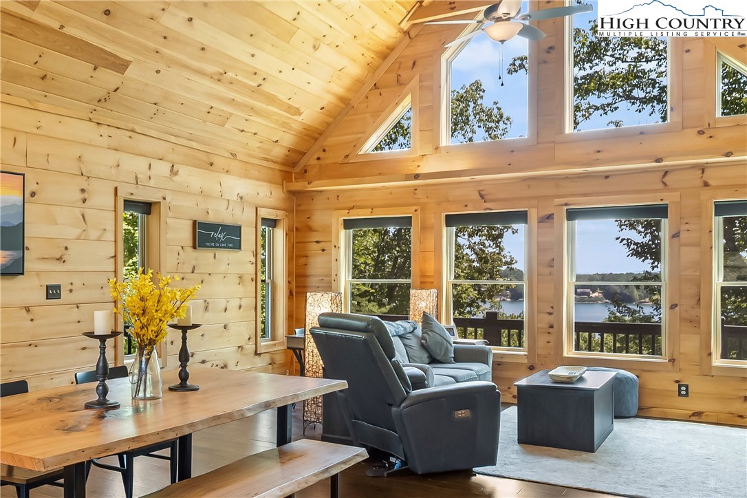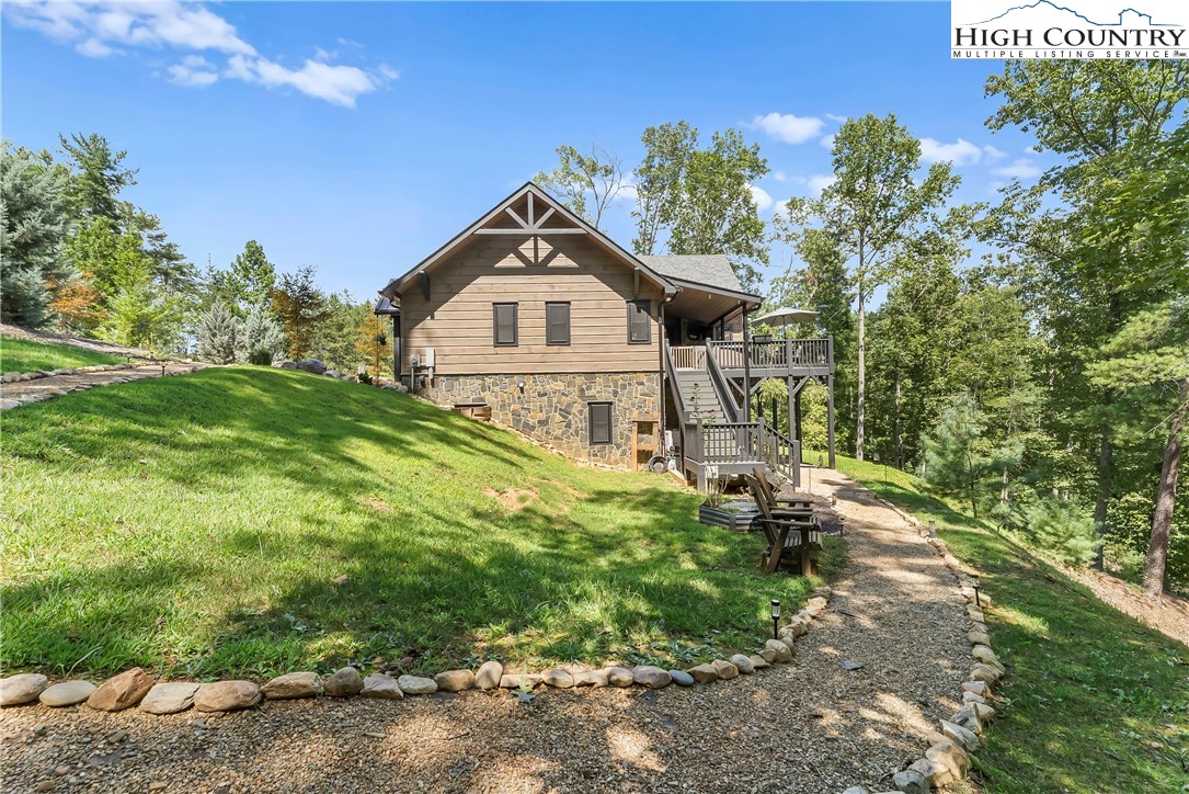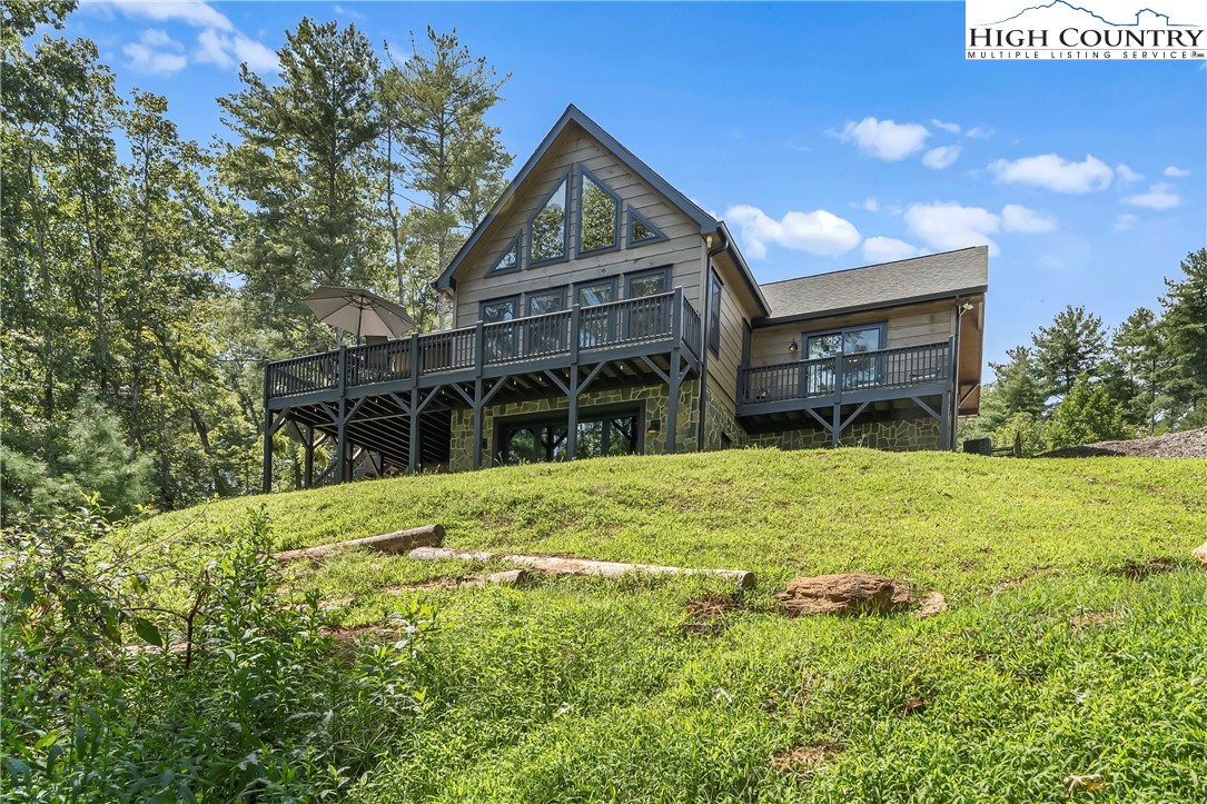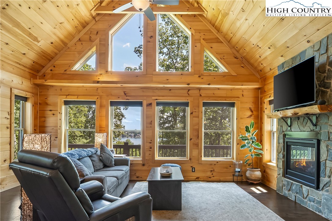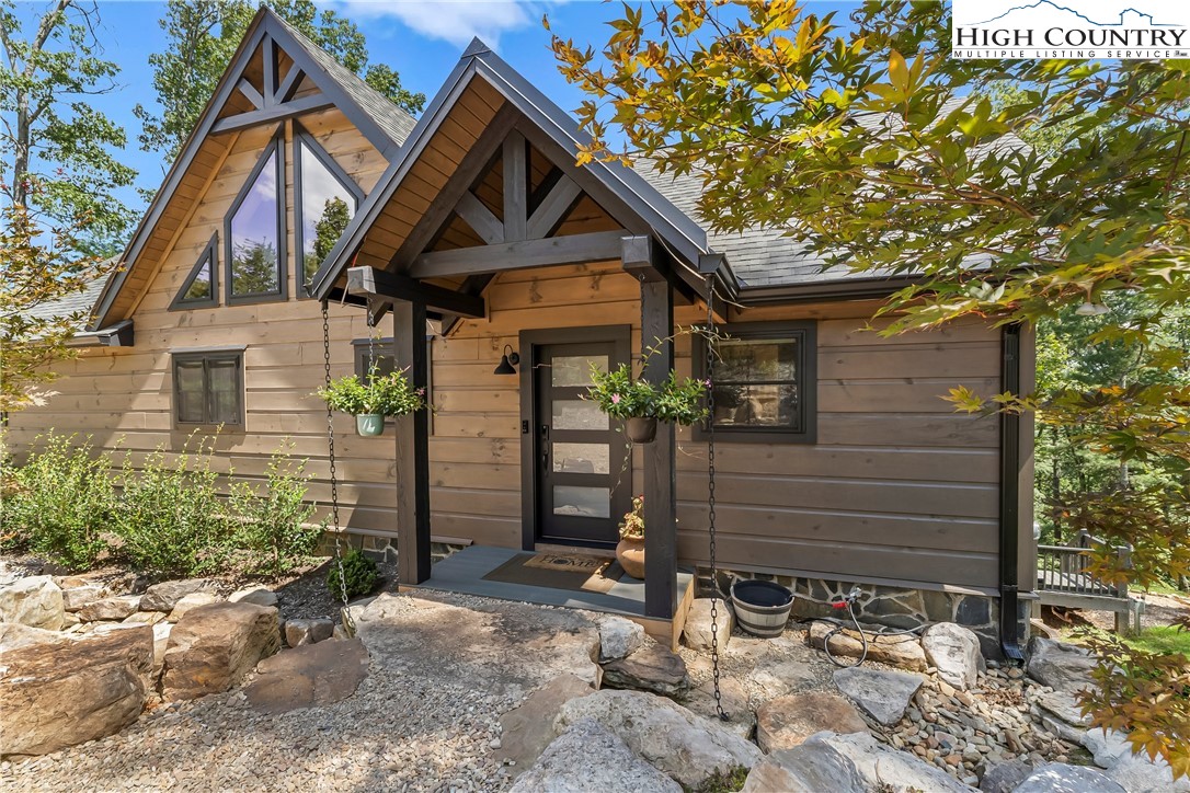 Nestled on 1.41 acres between 2 conservation areas, this stunning Blue Ridge log home offers a tranquil mountain escape with breathtaking lake views. Enter the home across the rock bridge surrounded by boulders and a wet weather rock bed. The main level welcomes you with a spacious, open great room that shares a cozy two-sided gas fireplace with the adjacent covered porch and has lake views surrounded by the trees. The primary suite is conveniently located on the main floor and has private balcony providing lake views and a peaceful sanctuary. An additional bedroom with ensuite full bath are also on this level, perfect for guests. Guest bath and laundry on main level as well. The lower level is designed for both relaxation and entertaining. It features two more bedrooms, a full hall bathroom and a dedicated office space for remote work. The large great room on this floor is an entertainment hub, complete with a wet bar for serving drinks to family and friends. Tin ceiling, stained concrete floor and wine nook under stairs. Retractable glass sliding doors let you enjoy the lake views. The deeded community boat slip is just a short walk or golf cart ride away for easy access to Lake James. As a resident, you'll also enjoy membership to Camp Lake James, offering an array of amenities and social events. This home is more than a residence; it's a lifestyle, blending rustic charm with modern comfort & lake views with endless opportunities for recreation on one of North Carolina's most beautiful lakes.